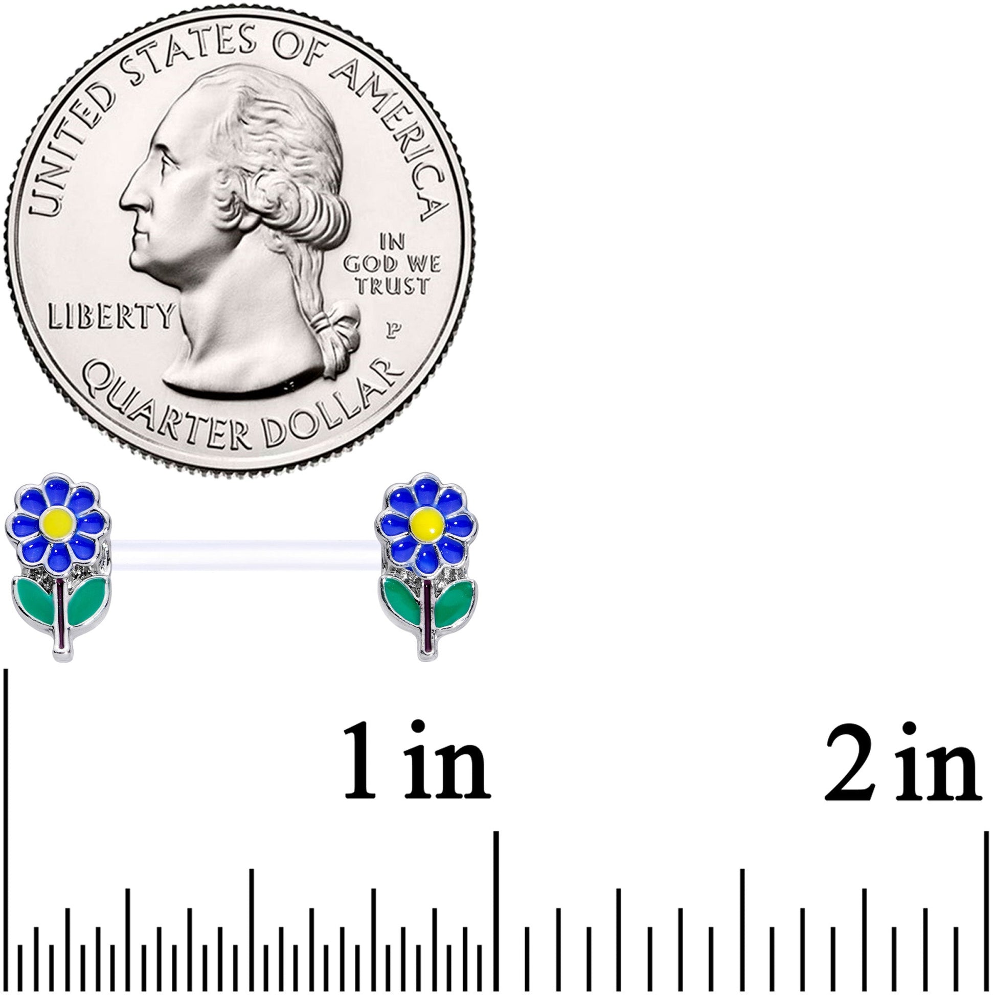 Give your nipple piercings a bit of extra flower power with these 14 gauge nipple rings! They're made with 14mm clear flexible Bioplast straight barbells for extra comfort anytime or during pregnancy. The ends feature 1960s styled flower charms with dark blue petals and yellow centers. The flowers are further embellished with green leaves that makes each individual element really stand out. You'll never want to take these out because they're just so bloomin' beautiful! Sold as a set of two.Specifications