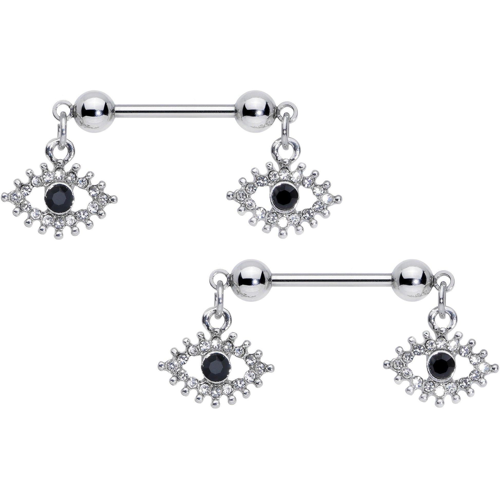 This 14 gauge nipple jewelry is sure to leave you absolutely wide-eyed! It's made with 14mm durable 316L surgical grade stainless steel straight barbells with 5mm ball ends. Dangling from each ball end is a wide-open eye charm ringed all the way around with clear gems. Set at its center is a large black gem. If you're the sort of person who loves having your nipple piercings stared at, now they can stare back with these elegant eye nipple rings! Sold as a set of two.Specifications
