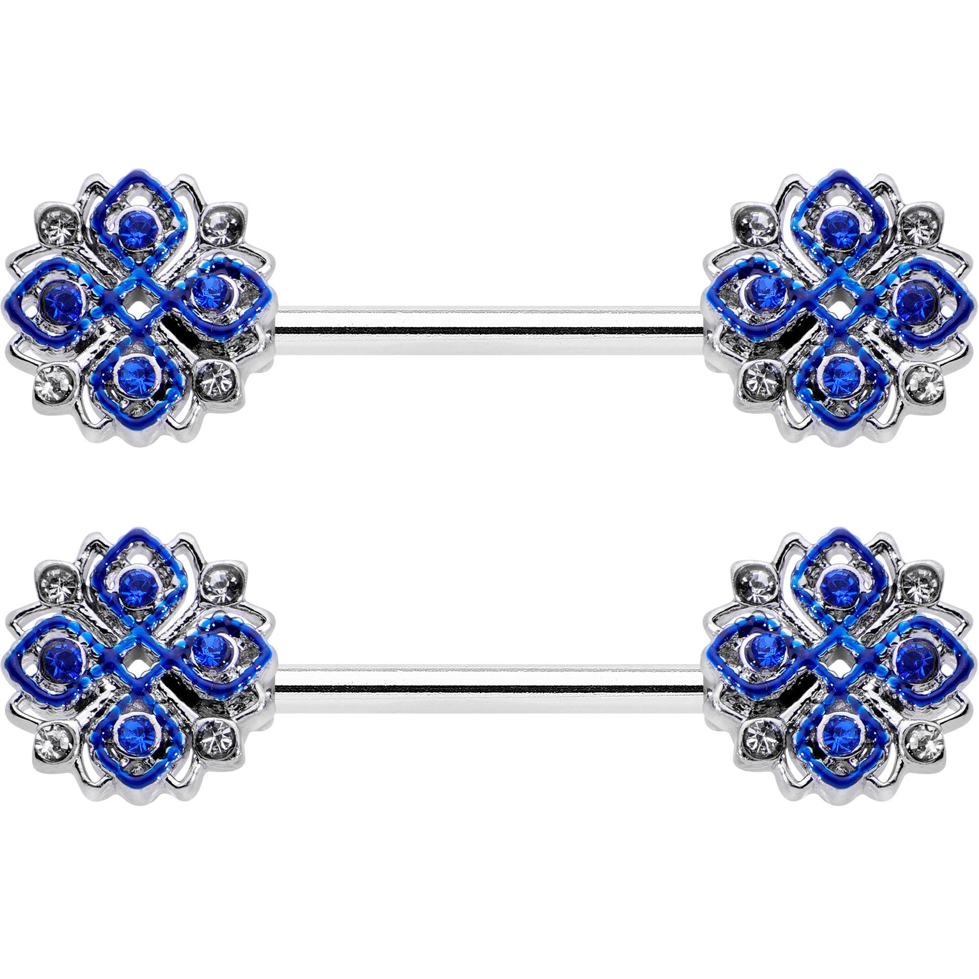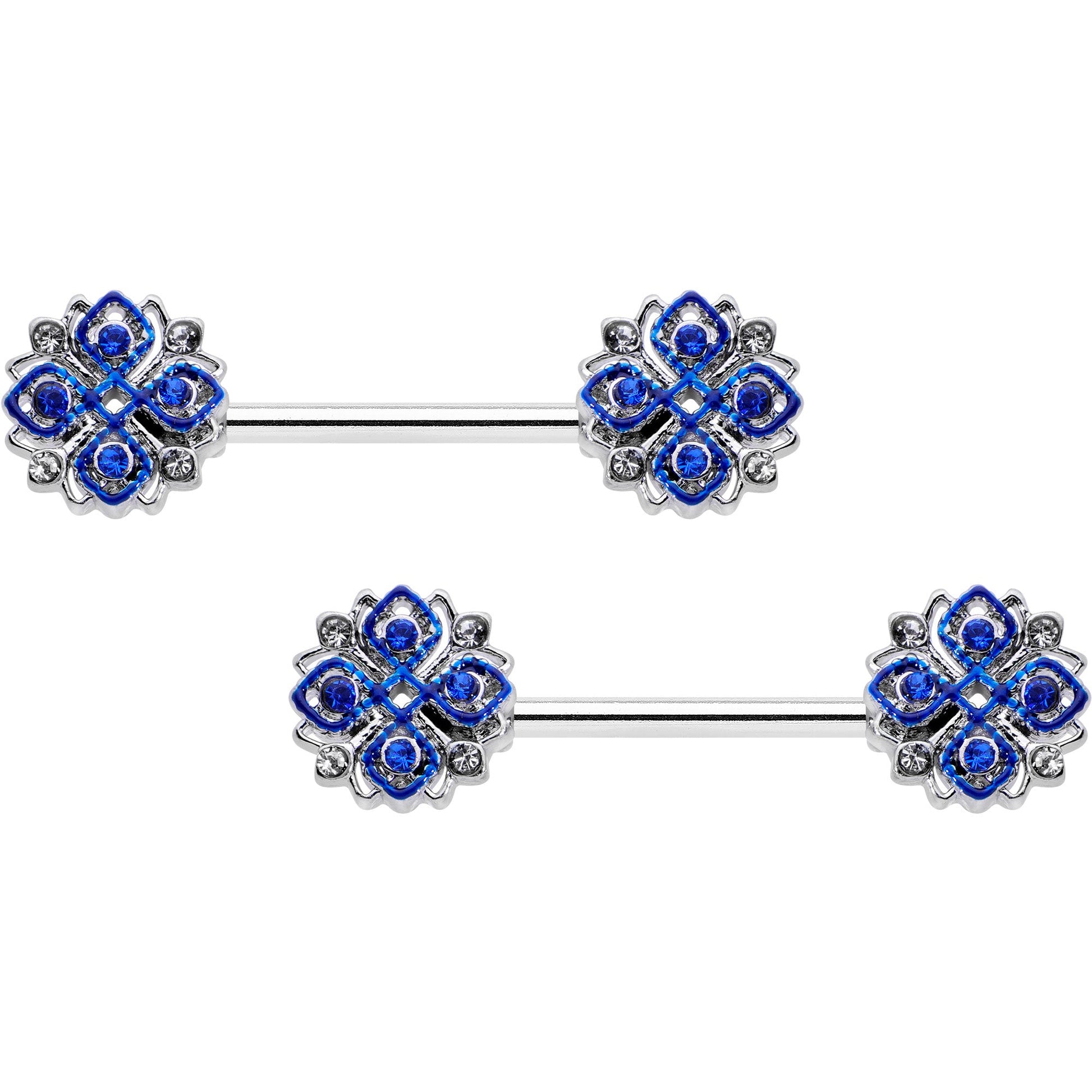 14G 9/16 Clear Blue Gem Embellished Cross Barbell Nipple Ring Set