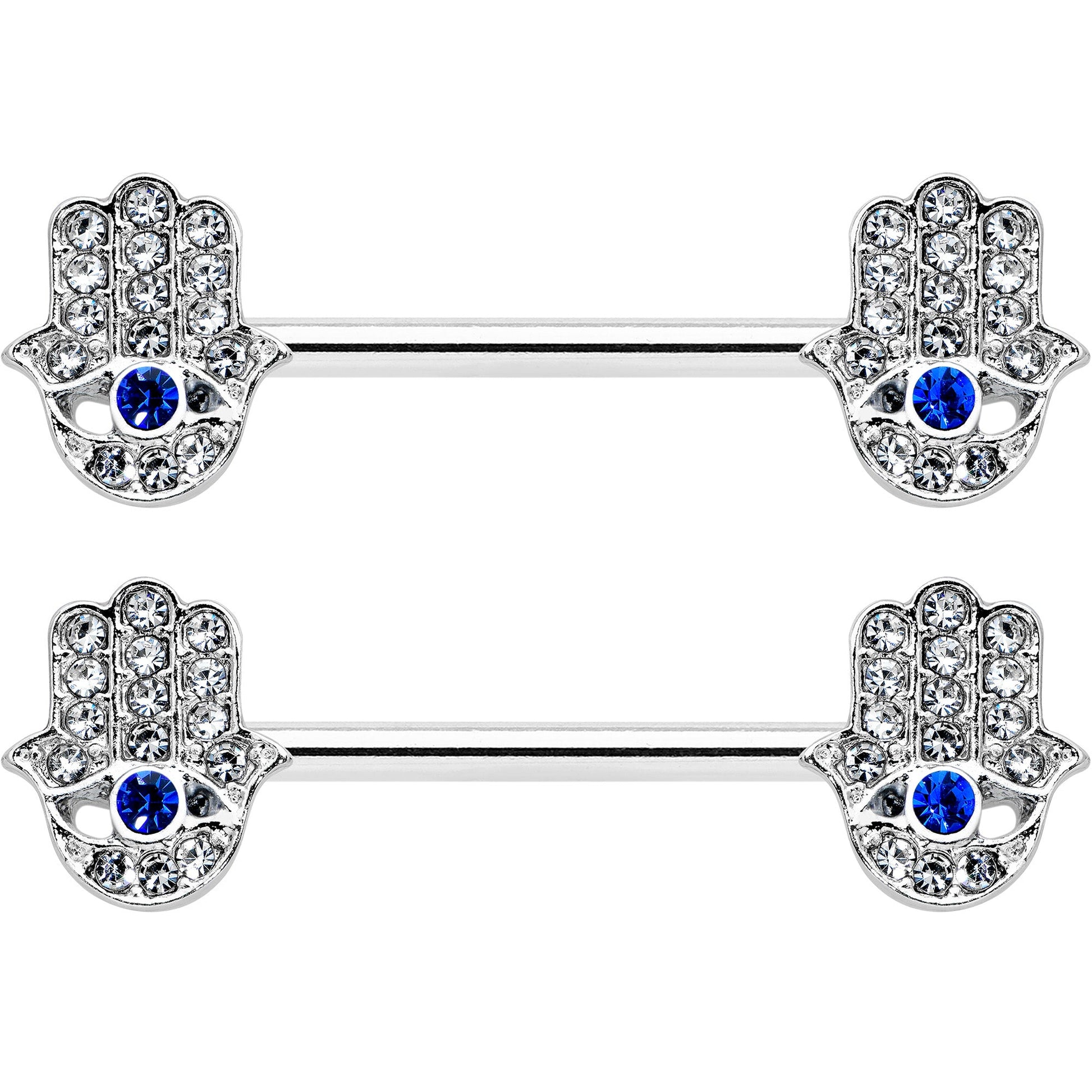 Protect yourself against evil auras with this 14 gauge cosmic Hamsa hand nipple jewelry. It's made with 14mm durable 316L surgical grade stainless steel straight barbells. Each of the ends features a blue gem eye in the palm of a Hamsa hand, which is paved with clear gems. Keep the bad vibes away while looking amazing with these stylish and spiritual nipple piercing rings! Sold as a set of two.Specifications