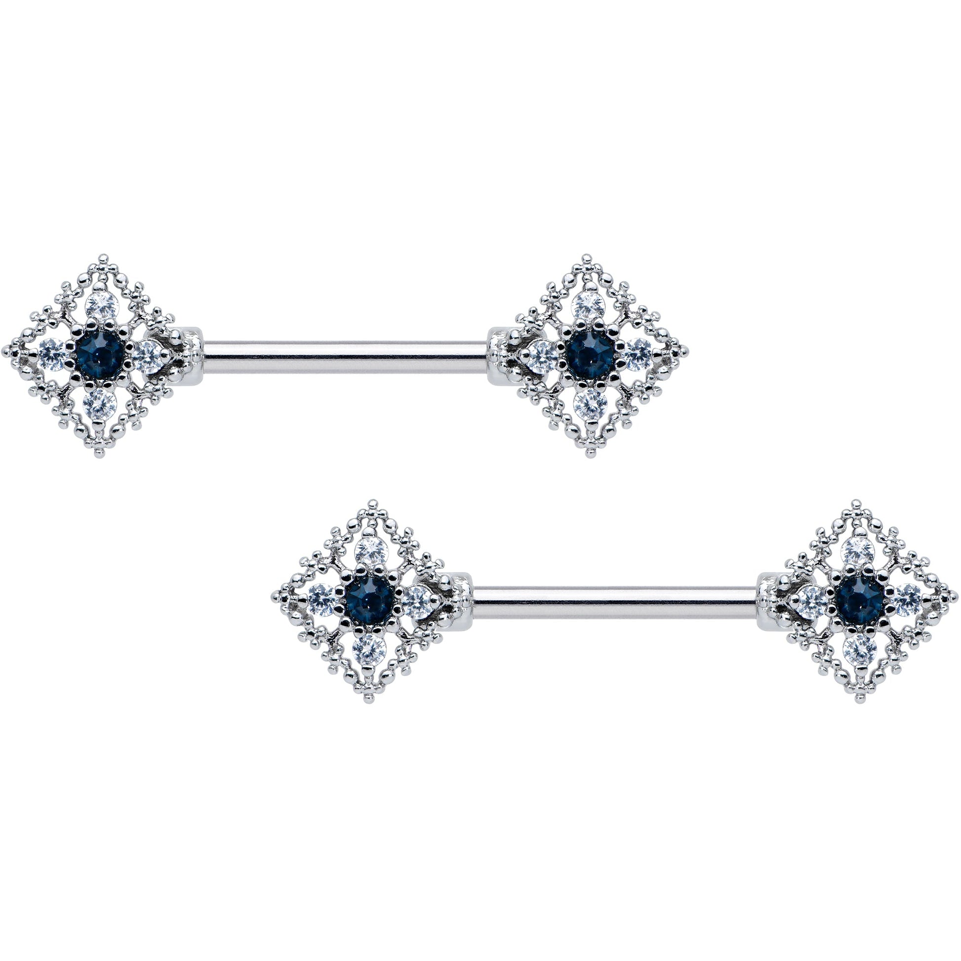 14G 9/16 Clear Blue Gem Textured Rhombus Cross Nipple Ring Set
