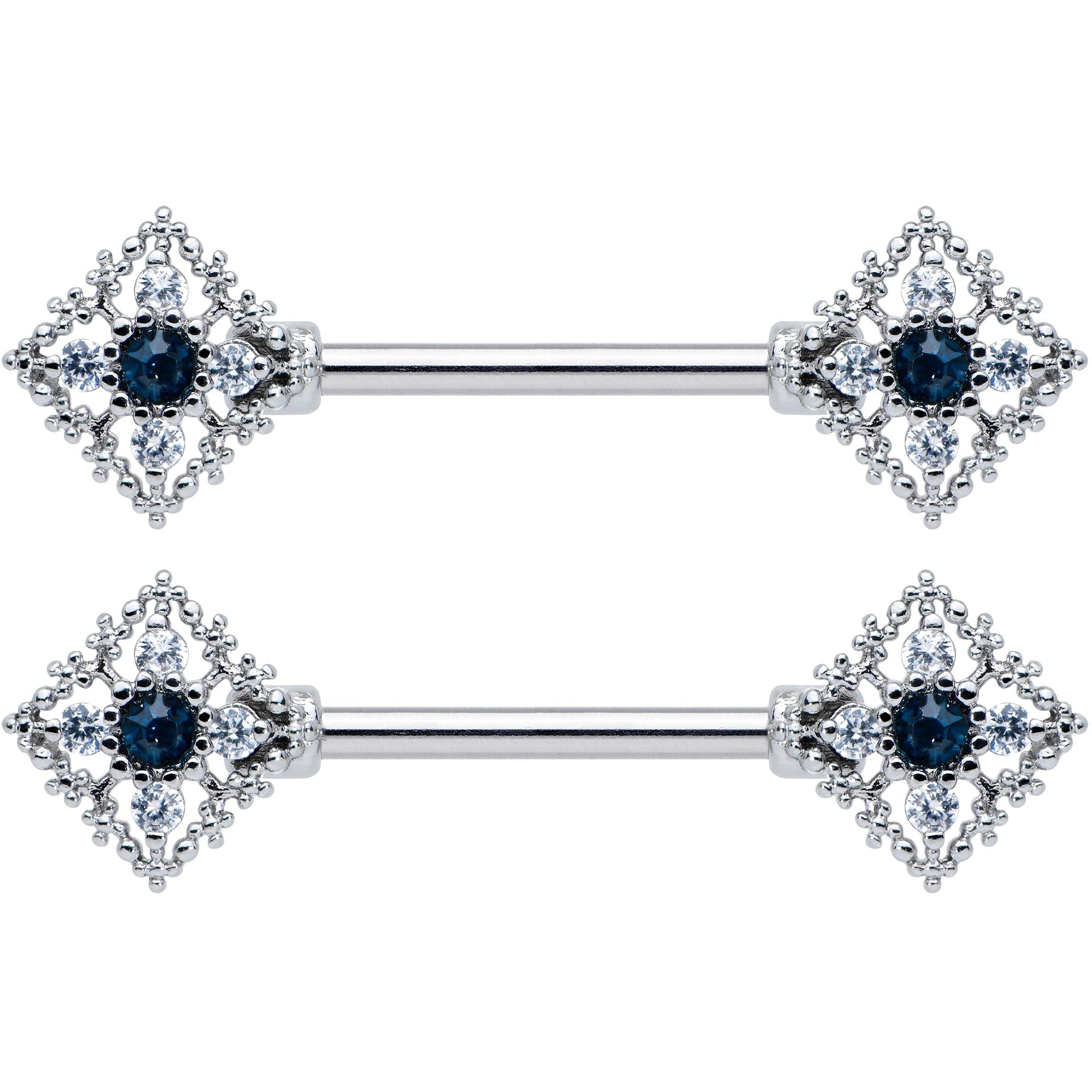 Celebrate your faith in style with this 14 gauge nipple jewelry! It's made with 14mm durable 316L surgical grade stainless steel straight barbells. Each of the ends features a rhombus shaped cross charm. The cross is composed of four clear gem arms with a deep, deep blue gem set at the center. The entire cross is set within a rhombus shape, with textured detailing for maximum visual impact. Wear your cross with pride and style with this elegant and spiritual nipple piercing jewelry! Sold as a set of two.Specifications