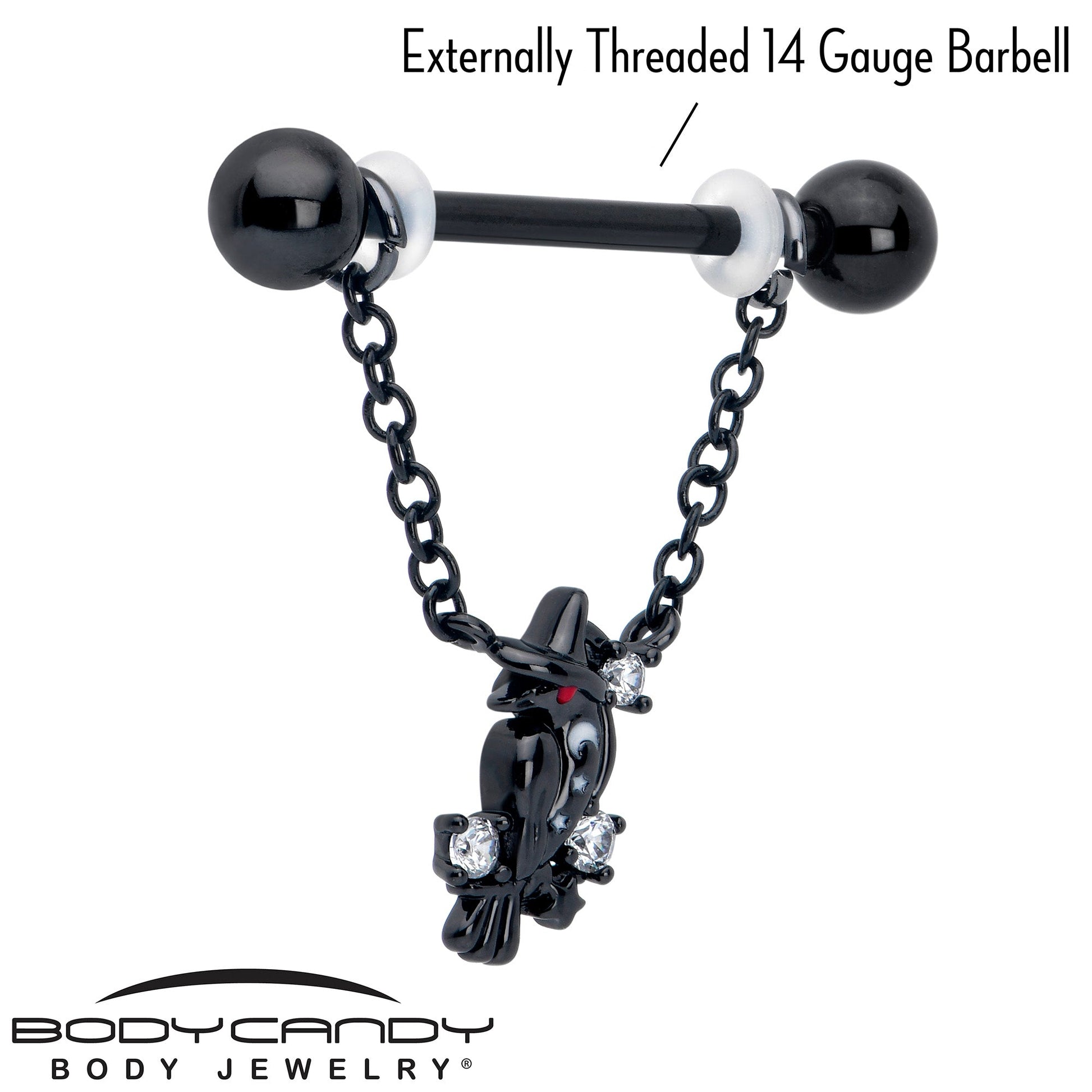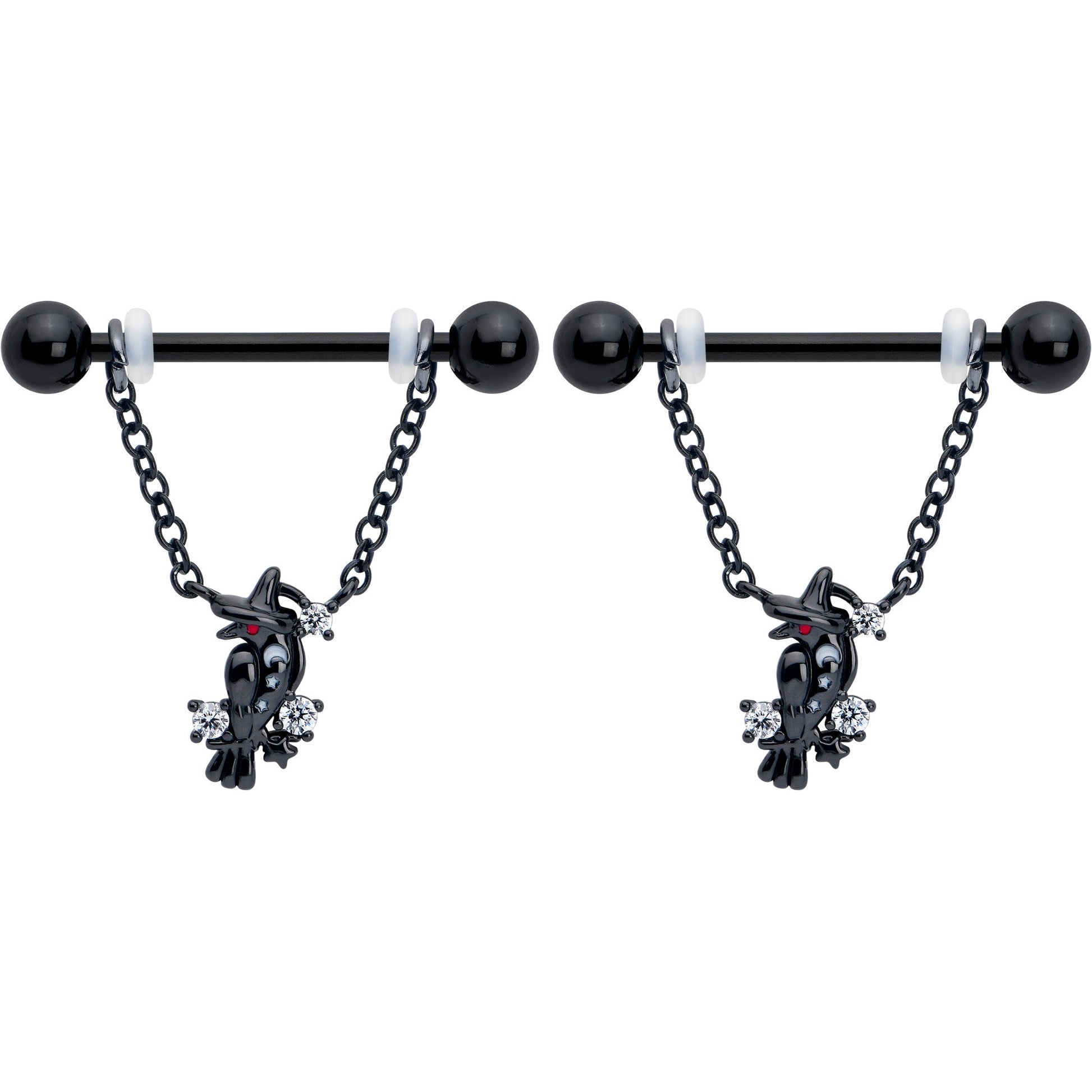 Nevermore will you be searching for the right look when you're rocking this 14 gauge nipple jewelry. It's made with 14mm black PVD over 316L surgical grade stainless steel straight barbells with 5mm ball ends. Each barbell supports a double length of matching chain. The dangling chains support a charm of a black raven, wearing a witch's hat. They're embellished with clear cubic zirconia gems for striking contrast. Make magic and rule the skies with these gorgeously gothic nipple piercing rings. Sold as a set of two.Specifications