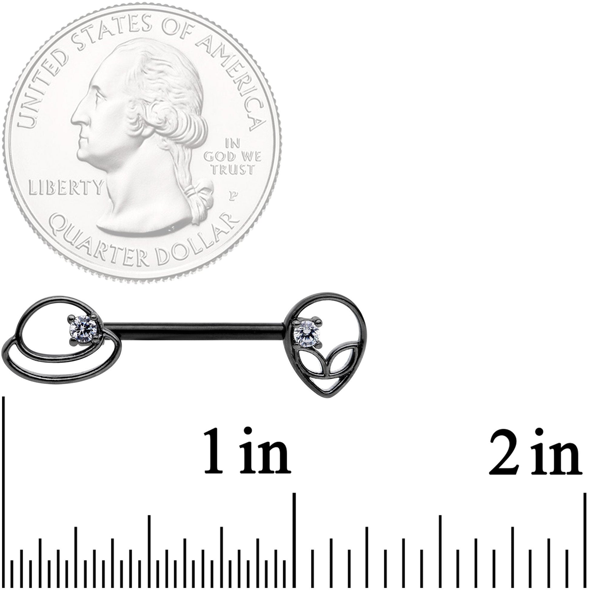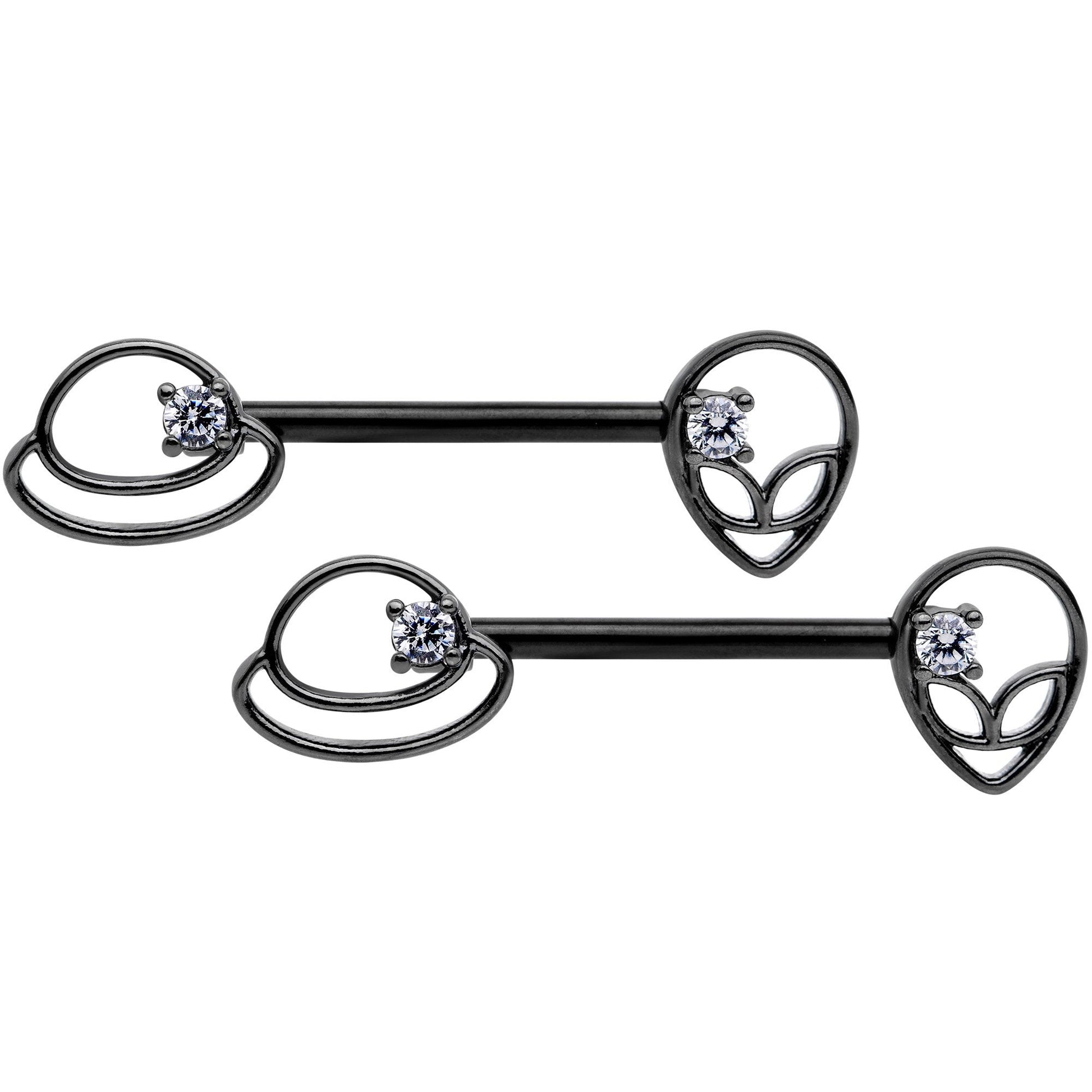 These 14 gauge nipple piercings are absolutely out of this world! They're made with black PVD over 316L surgical grade stainless steel straight barbells. One end features an openwork planet Saturn, the clean outlines embellished with a clear cubic zirconia gem. The other end is an openwork alien face with detailed eyes, also embellished with a clear cubic zirconia gem. Whether or not you believe in aliens, this nipple jewelry will have you seeing stars! Sold as a set of two.Specifications