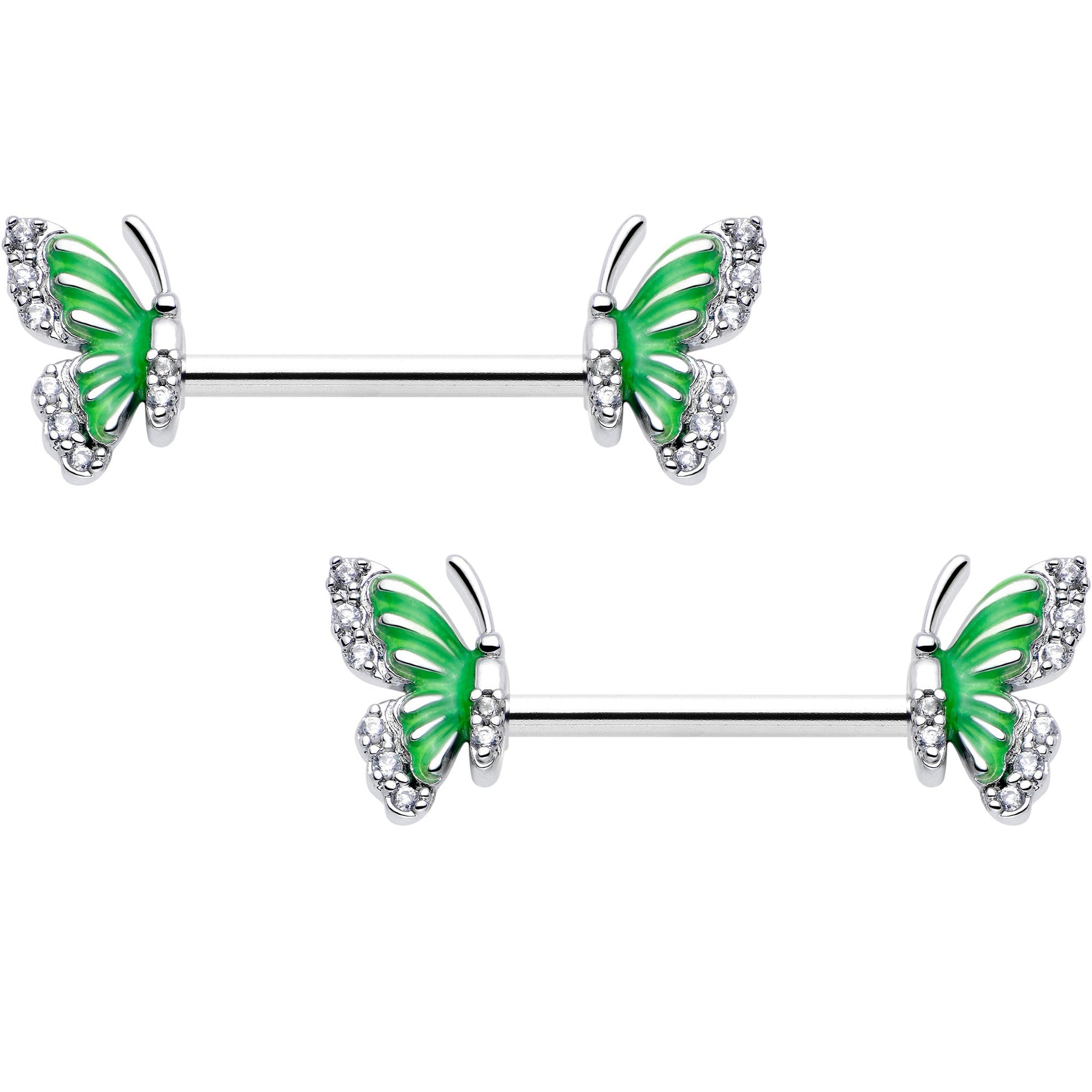 The butterflies on this 14 gauge nipple jewelry will add a cheery splash of color to your look. It's made with 14mm durable 316L surgical grade stainless steel straight barbells. Each of the ends features a butterfly charm, with wings set with clear cubic zirconia gems. The butterflies are further embellished with green inlay for a colorful highlight. These vivid butterfly nipple piercing rings will make you want to fly. Sold as a set of two,Specifications