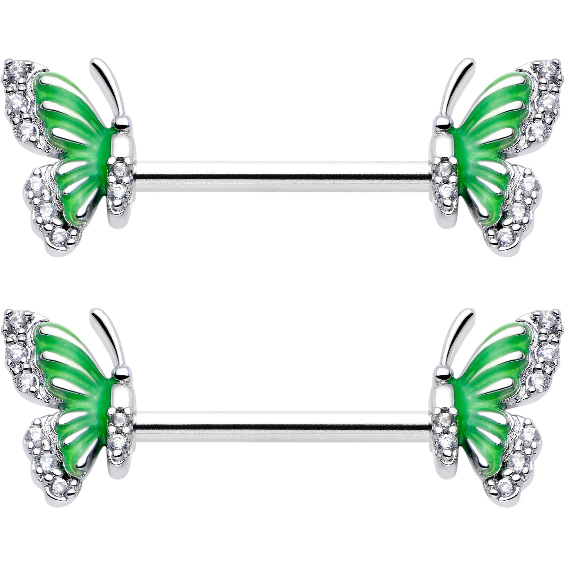 14G 9/16 Clear CZ Gem Butterfly Green Barbell Nipple Ring Set