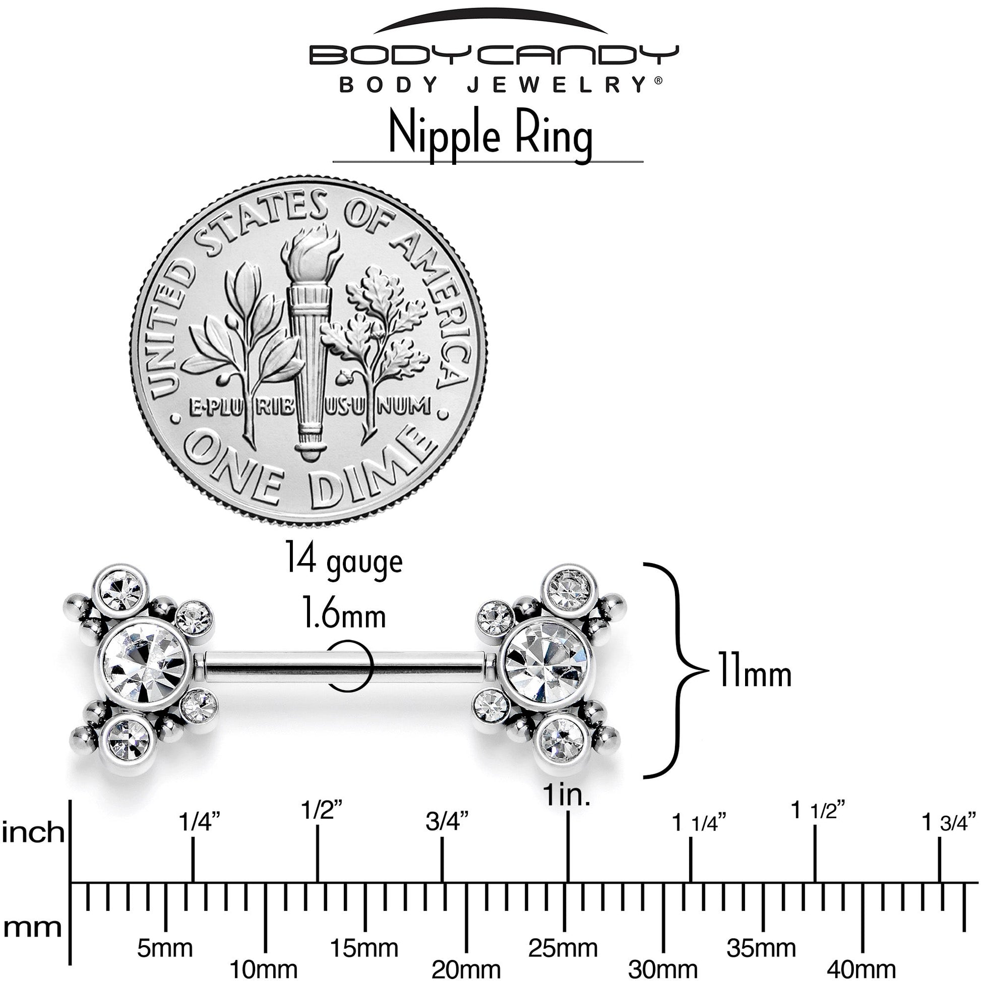 Simple style that goes with everything is what you get with with these 14 gauge nipple rings. They are made with 14mm durable 316L surgical grade stainless steel straight barbells. The ends are set with forward facing clear cubic zirconia gems with a quartet of smaller clear cubic zirconia gems surrounding a larger clear cubic zirconia gem. They feature raised detailing and an threadless design for maximum comfort on insertion and removal while keeping a secure fit. Keep it simple while still keeping it stylish with this eternally elegant nipple piercing jewelry. Sold as a set of two.Specifications