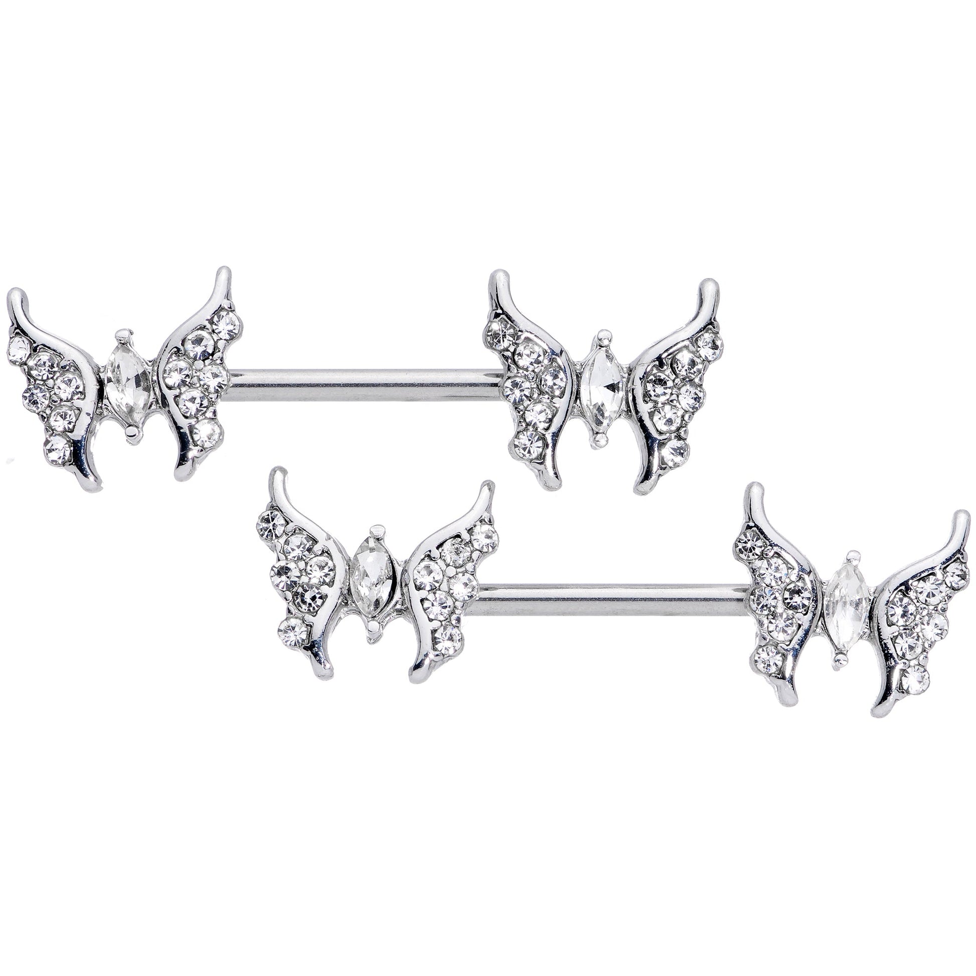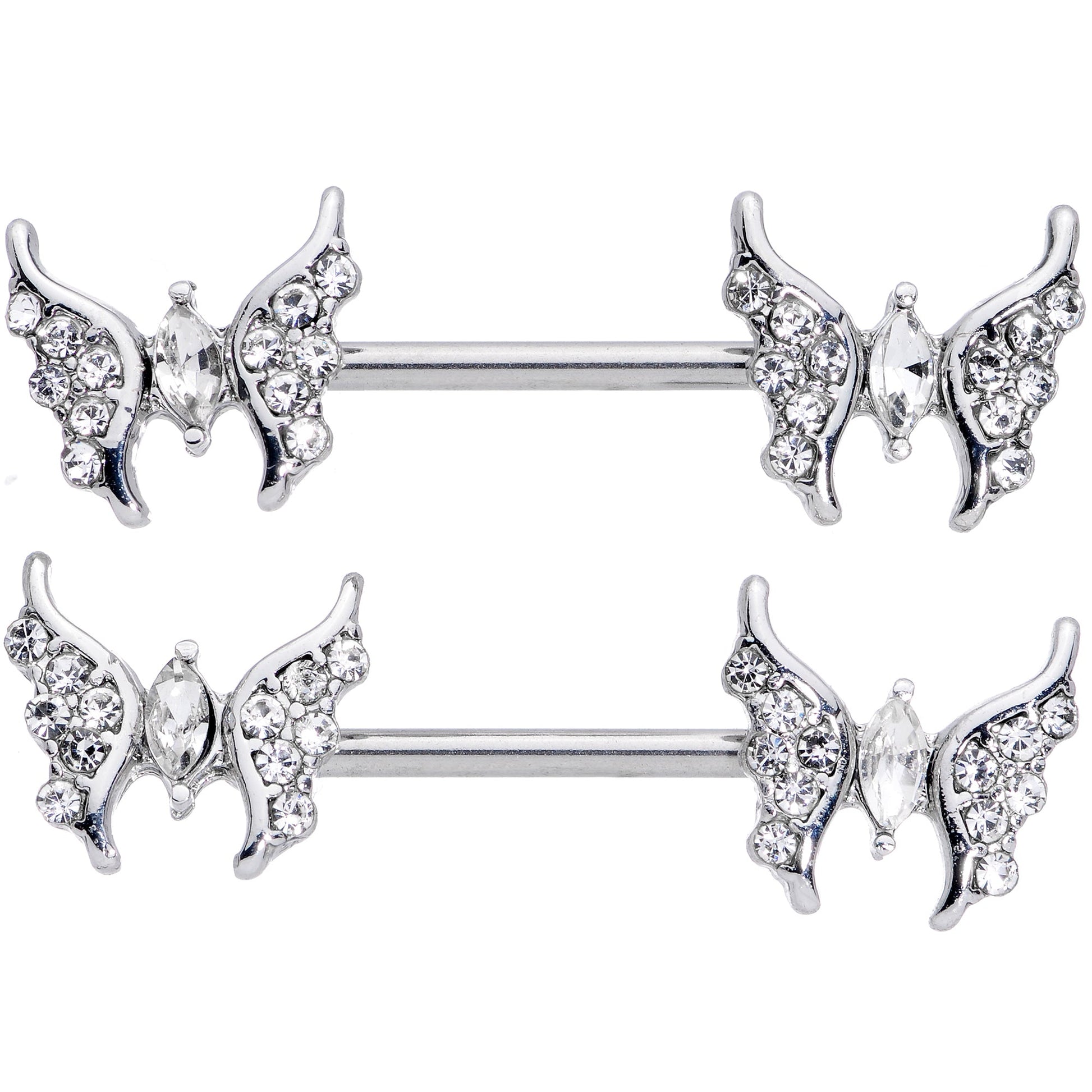 Some people do their best to avoid drama....but some wear drama in their nipple piercings with these 14 gauge nipple rings! They're made with 14mm durable 316L surgical grade stainless steel straight barbells. The ends feature butterfly charms with elegantly curved wings that end in elegant points. The wings are paved in clear cubic zirconia gems, with the body of the butterfly being composed of a clear cubic zirconia gem. The luxe detailing and strikingly graceful lines make these butterflies into something truly special. Do drama right with these beautiful butterfly barbells! Sold as a set of two.Specifications