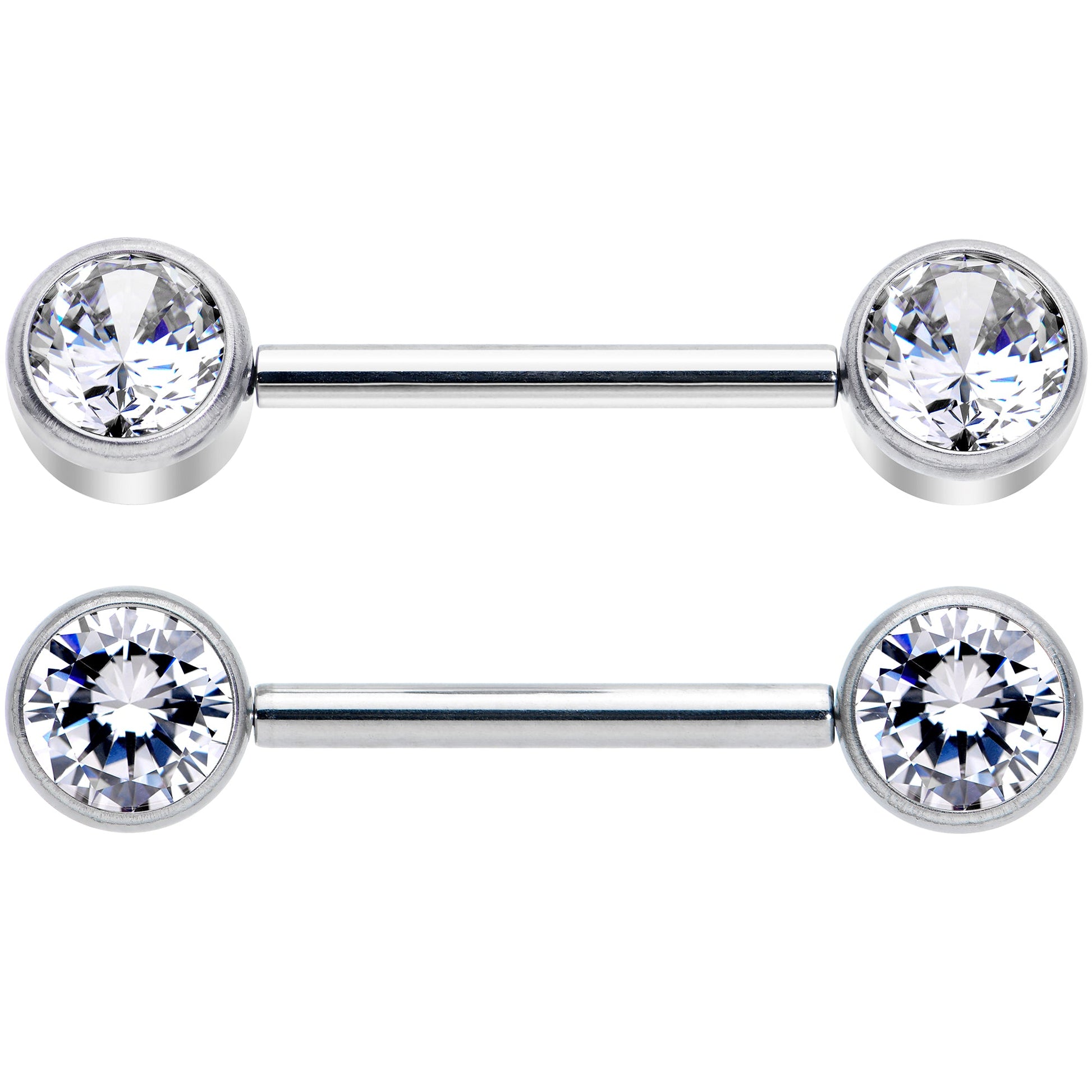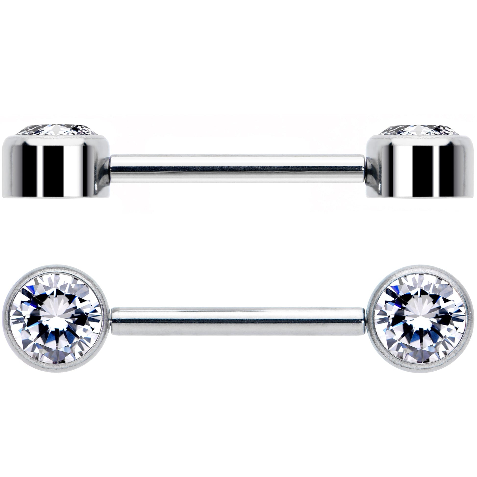 Get fashion forward with these 14 gauge barbell nipple rings! They're made with 14mm solid grade 23 implant grade titanium straight barbells with 6mm disc ends. The ends are set with clear cubic zirconia gems, facing forwards for a look that's very distinct and eye-catching. If that weren't enough, they also feature a threadless design that makes insertion and removal super easy! Give your nipple piercings some forward-facing color with this fashionable and colorful nipple jewelry! Sold as a set of two.Specifications