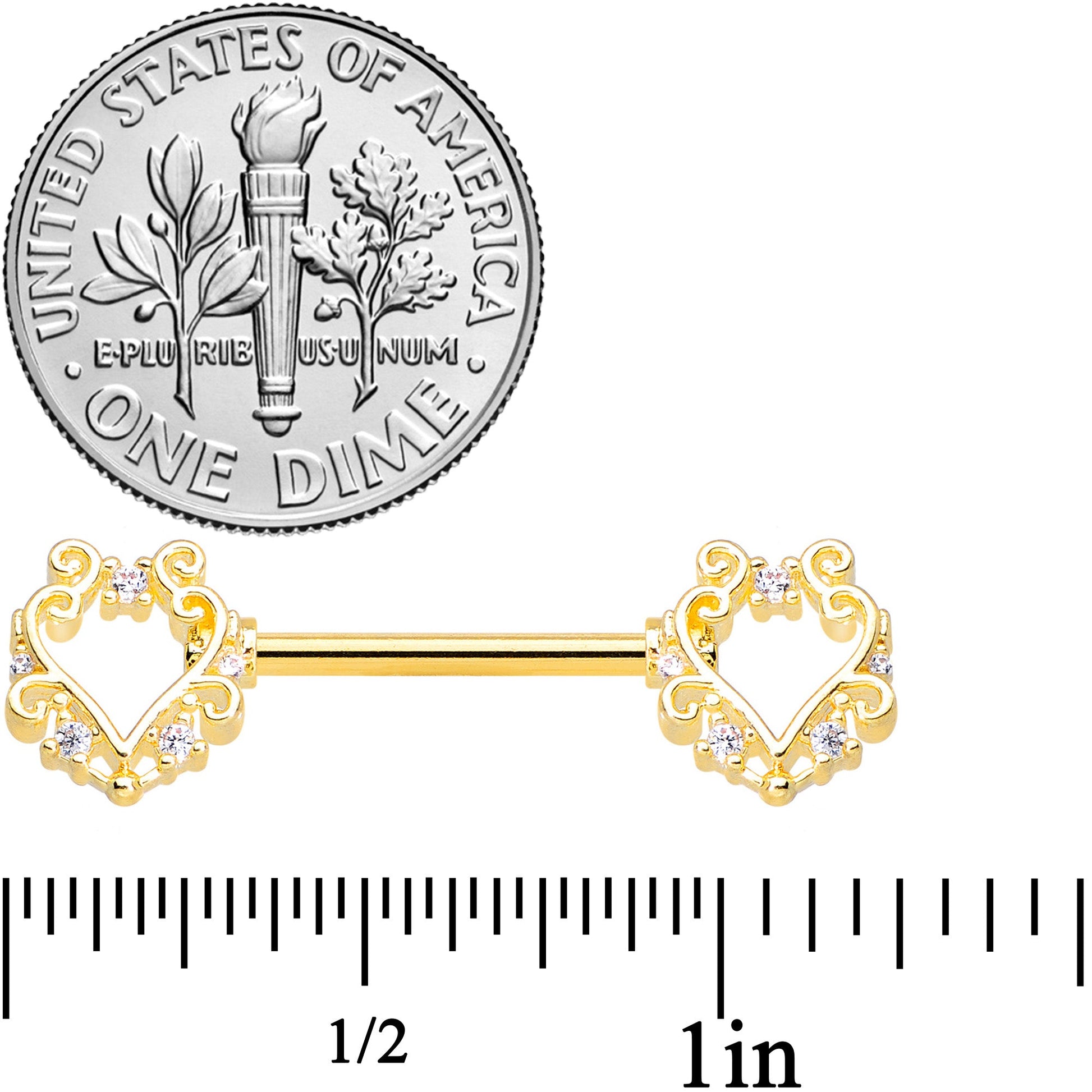 The scrollwork designs on these 14 gauge nipple rings bring to mind antique wrought iron - fashionable and functional! They're made with 14mm gold tone PVD over 316L surgical grade stainless steel straight barbells. The ends feature scrollwork open heart charms with matching ornamentation on their sides. Each one is set with a trio of clear cubic zirconia gems. These gorgeously embellished hearts are sure to find a place in yours! Sold as a set of two.Specifications