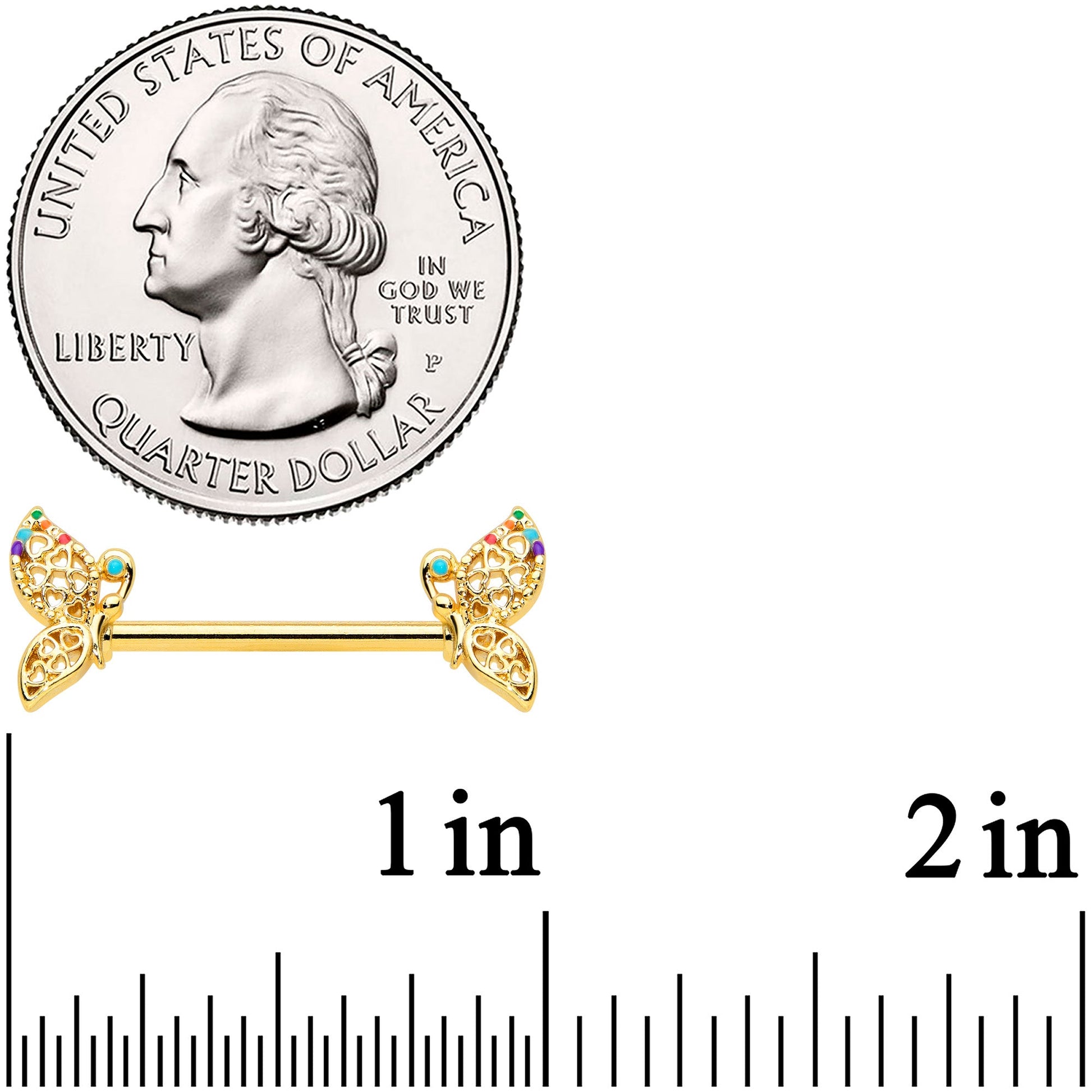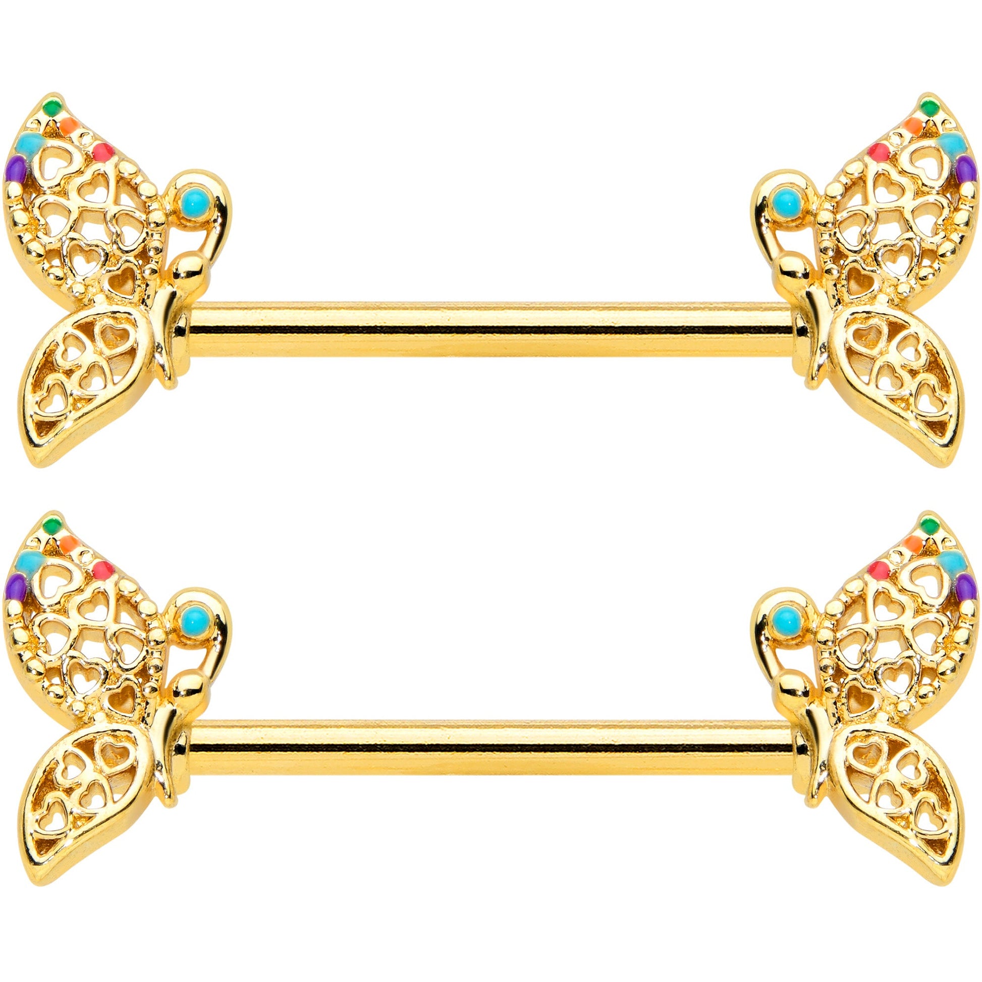 Fall in love with your piercings when you're rocking this 14 gauge nipple jewelry! It's made with 14mm gold tone PVD over 316L surgical grade stainless steel straight barbells. Each of the ends features a butterfly charm. The butterflies feature hearts within their openwork wings, embellished with clear cubic zirconia gems and color inlays in red, green, blue, and more! These nipple rings are sure to steal your heart! Sold as a set of two.Specifications