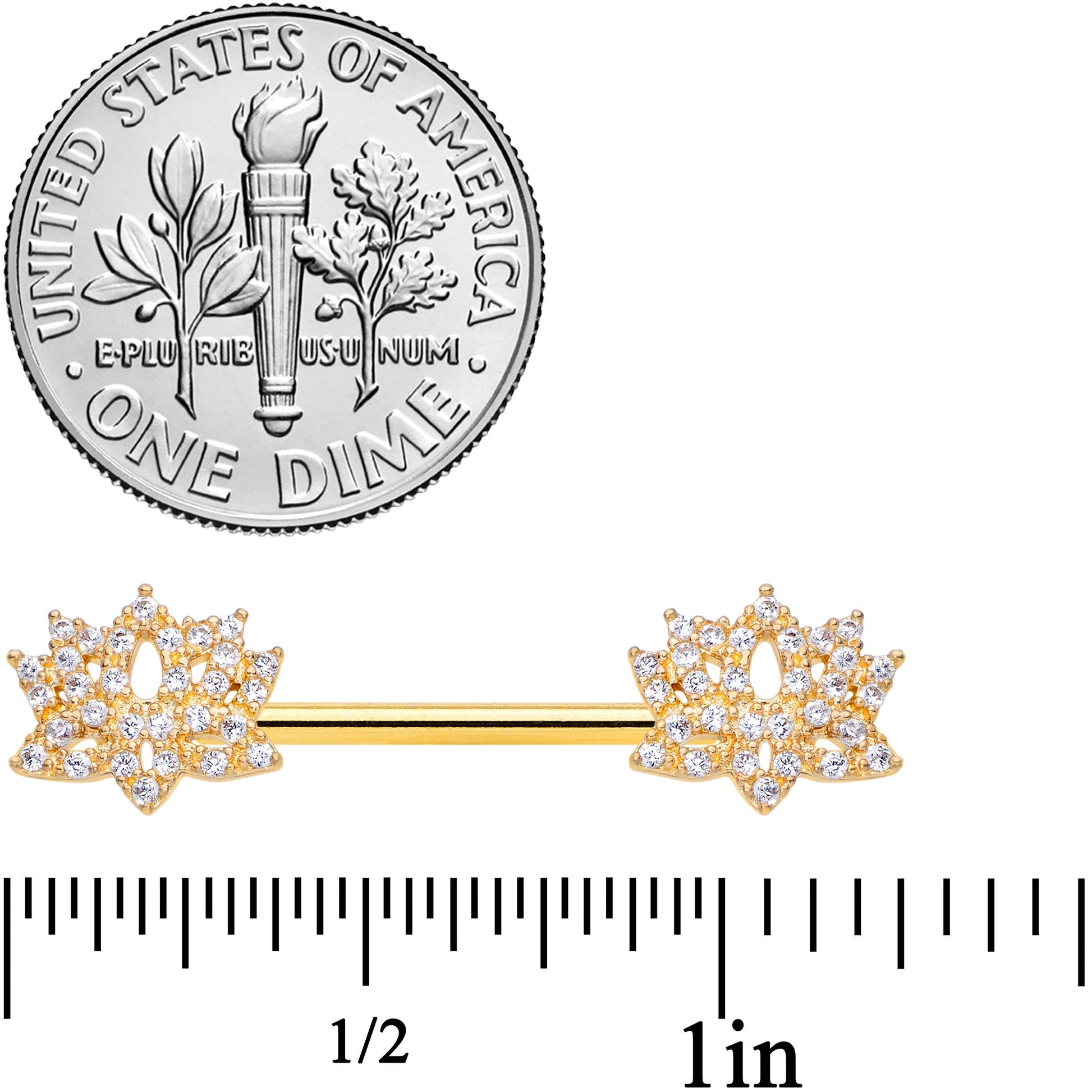 Inner peace is important but so is outer peace - like the kind you get from this 14 gauge nipple jewelry! It's made with 14mm gold tone PVD over 316L surgical grade stainless steel straight barbells. The ends each features a gorgeous lotus flower charm paved with clear cubic zirconia gems. It's a great way to show off your spiritual side, as well as the peace you'll get from knowing how sophisticated and stylish your nipple piercings look! This lotus is sure to soothe your mind - when you look this good, you're sure to feel good too! Sold as a set of two.Specifications