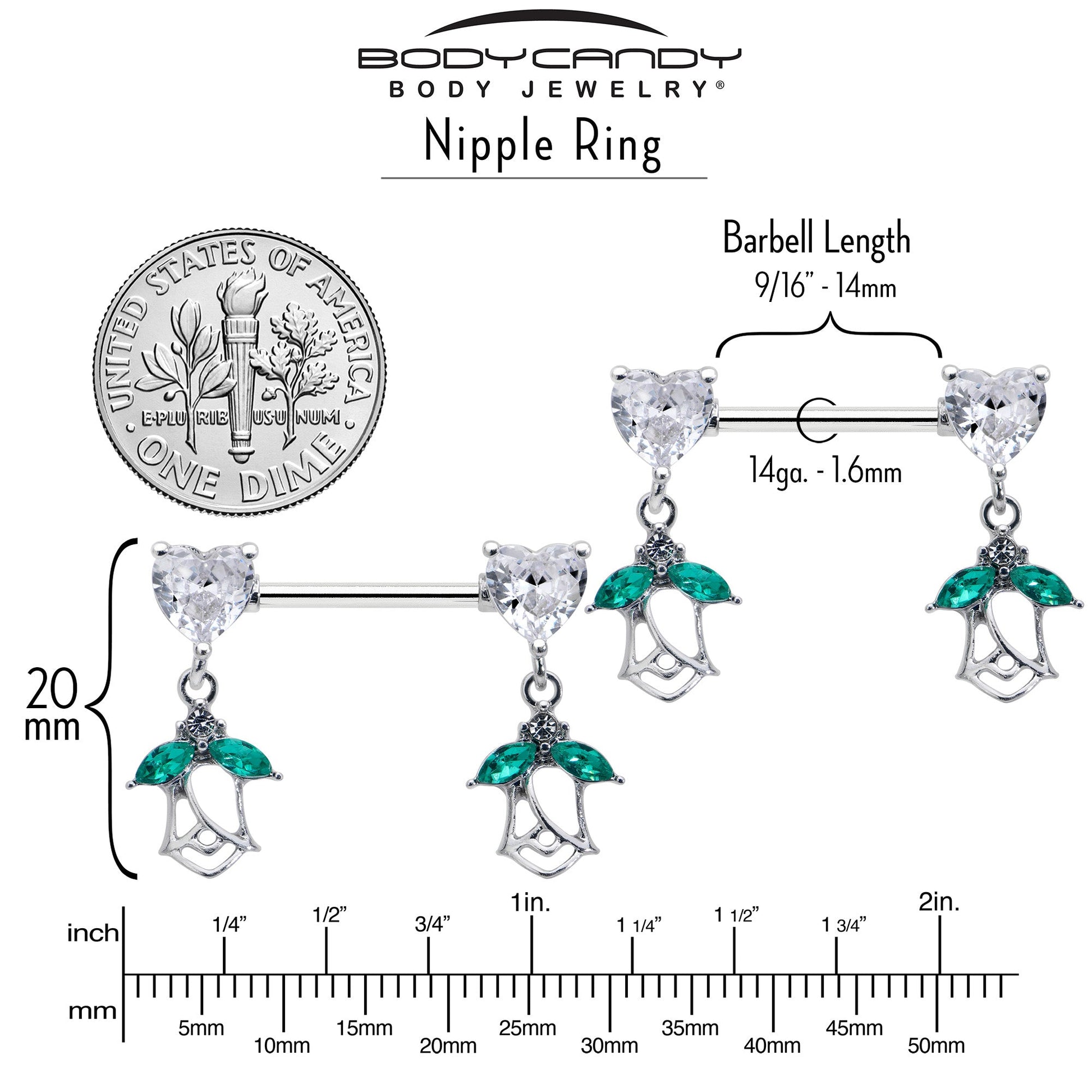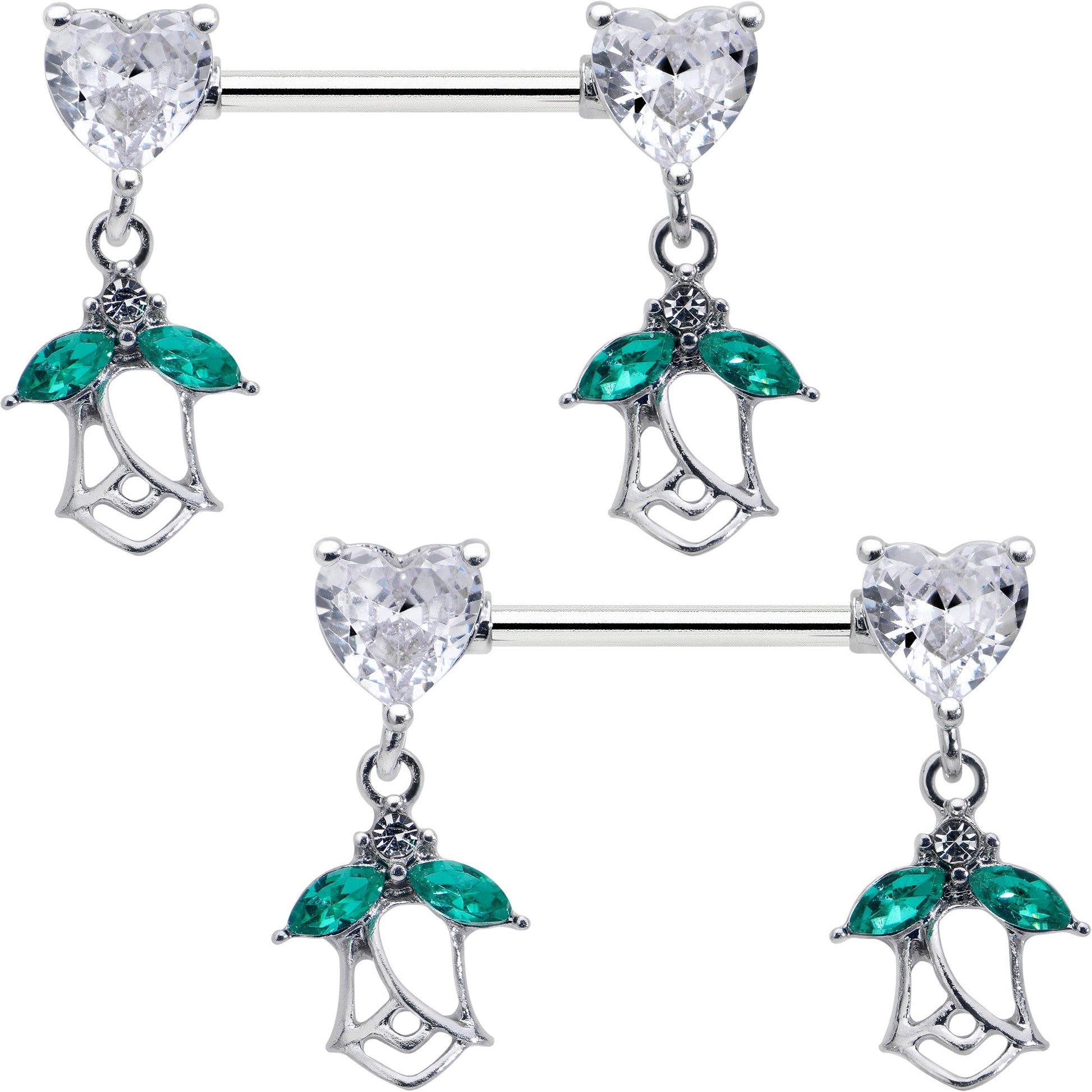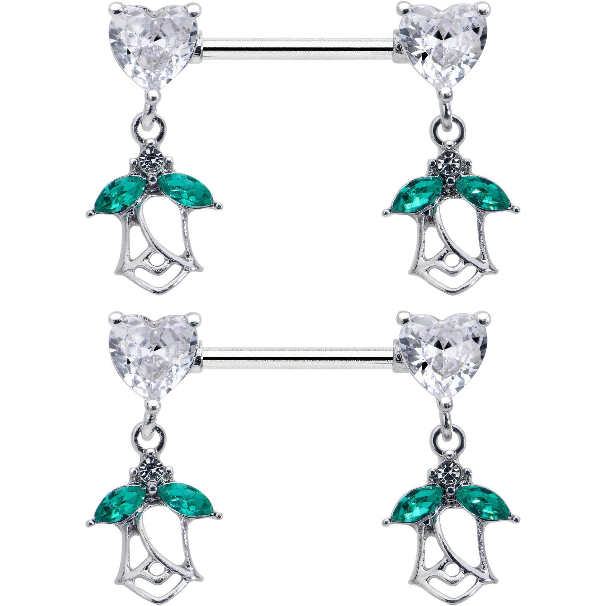 What could be more romantic than this 14 gauge nipple jewelry? It is made with 14mm durable 316L surgical grade stainless straight barbells. Each of the ends features a clear cubic zirconia gem in the shape of a heart. Dangling beneath each heart is a rose charm, with the leaves composed of green cubic zirconia gems and an airy, openwork design. Fall in love with these richly romantic nipple piercing rings. Sold as a set of two.Specifications