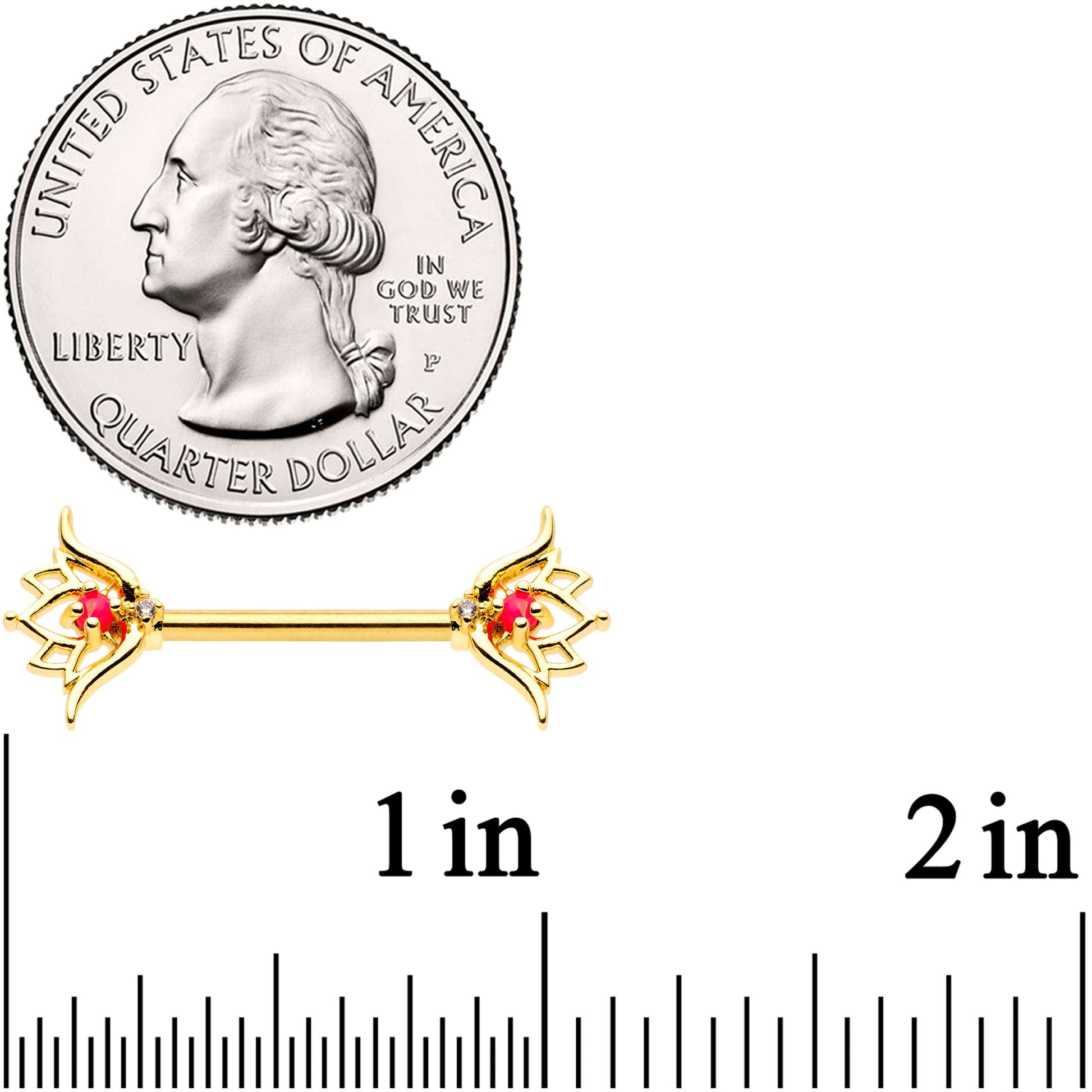 Open your mind and let your mind blossom....with thoughts of this gorgeous 14 gauge nipple jewelry! It's made with 14mm gold tone PVD over 316L surgical grade stainless steel straight barbells. The ends feature lotus flower charms set at the base with a pink orb and a small clear cubic zirconia gem. The overall look is a perfect blend of boho and elegance that you'll absolutely love. Sold as a set of two.Specifications