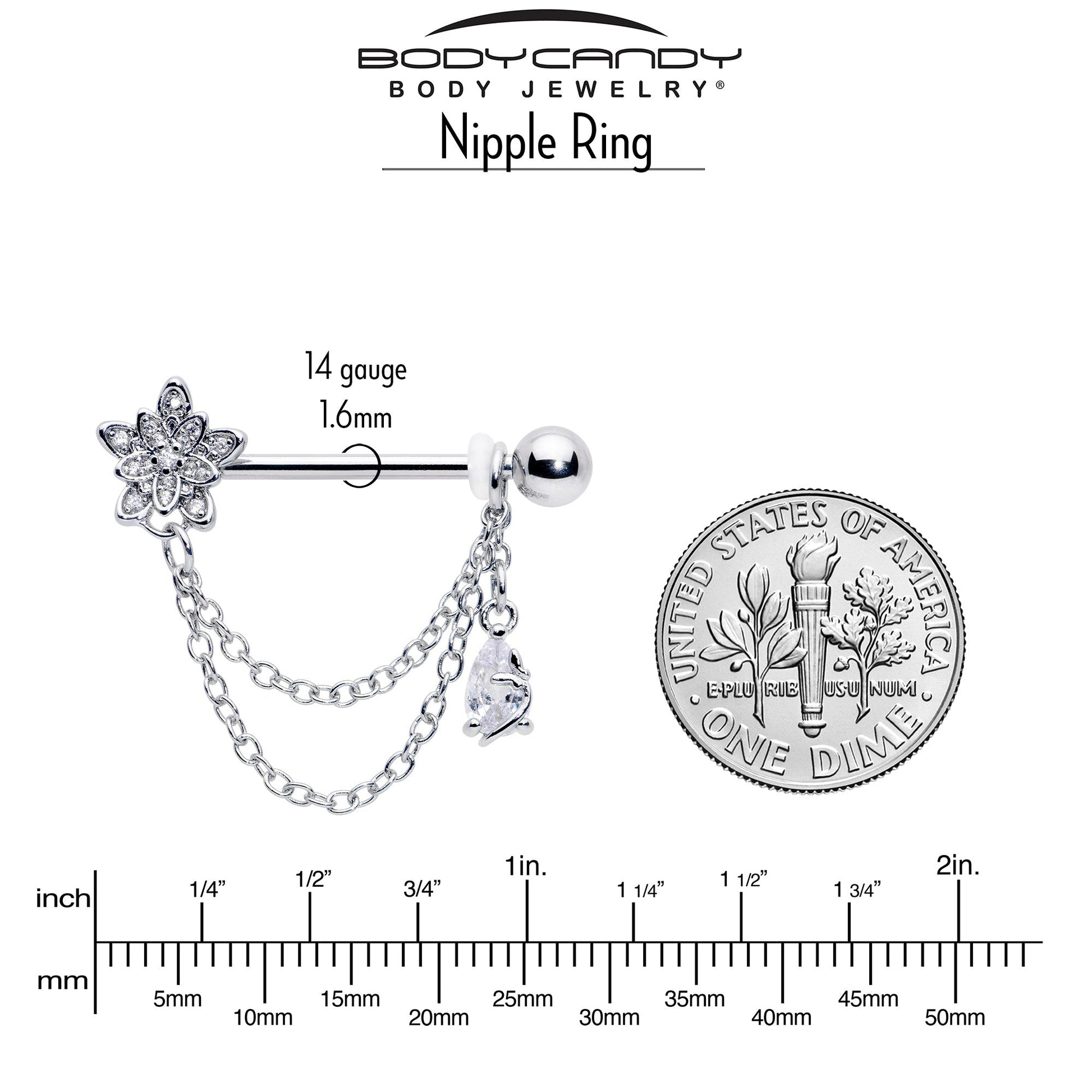 14 Gauge 9/16 Clear CZ Gem Snowflake Flower Chain Dangle Nipple Ring Set