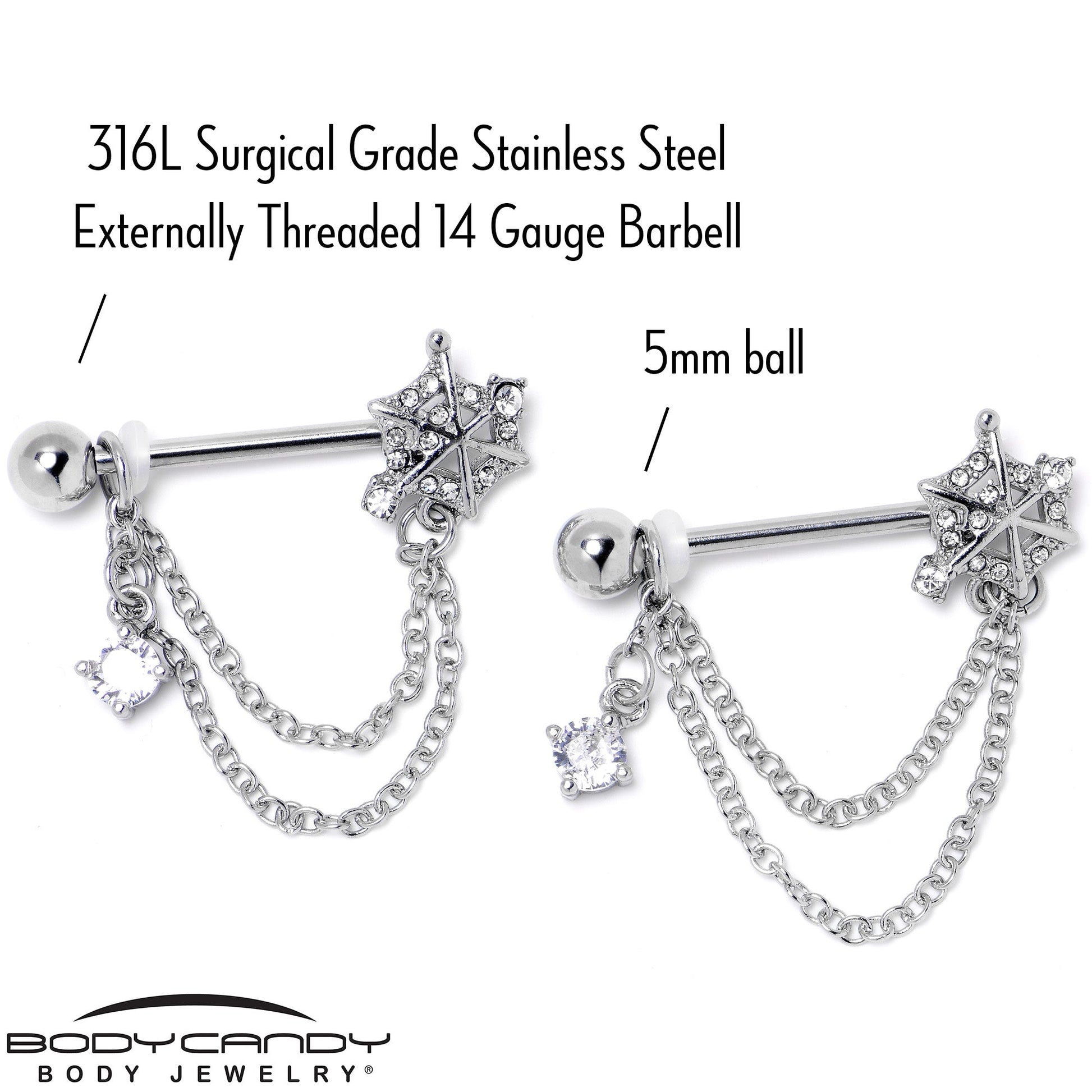 If you are a creature of the night, show it off with this 14 gauge nipple jewelry. It is made with 14mm durable 316L surgical grade stainless steel straight barbells with 5mm ball ends on one side. The other end features spiderweb charms, set with clear cubic zirconia gems. They are further embellished with double chain dangles for added motion and style and are tipped with a single clear cubic zirconia gem. For gothic glamour, these nipple piercing rings cannot be beat. Sold as a set of two.Specifications