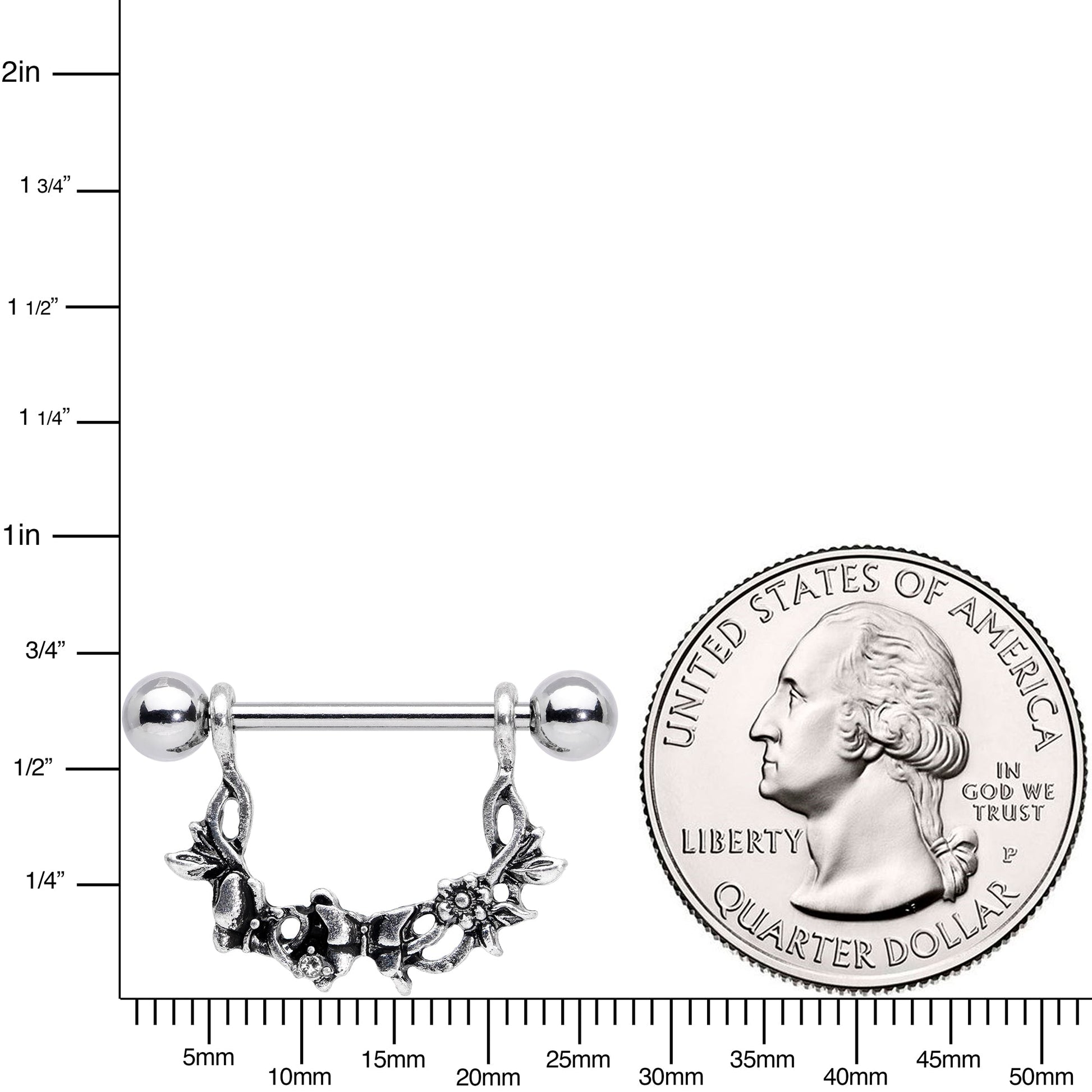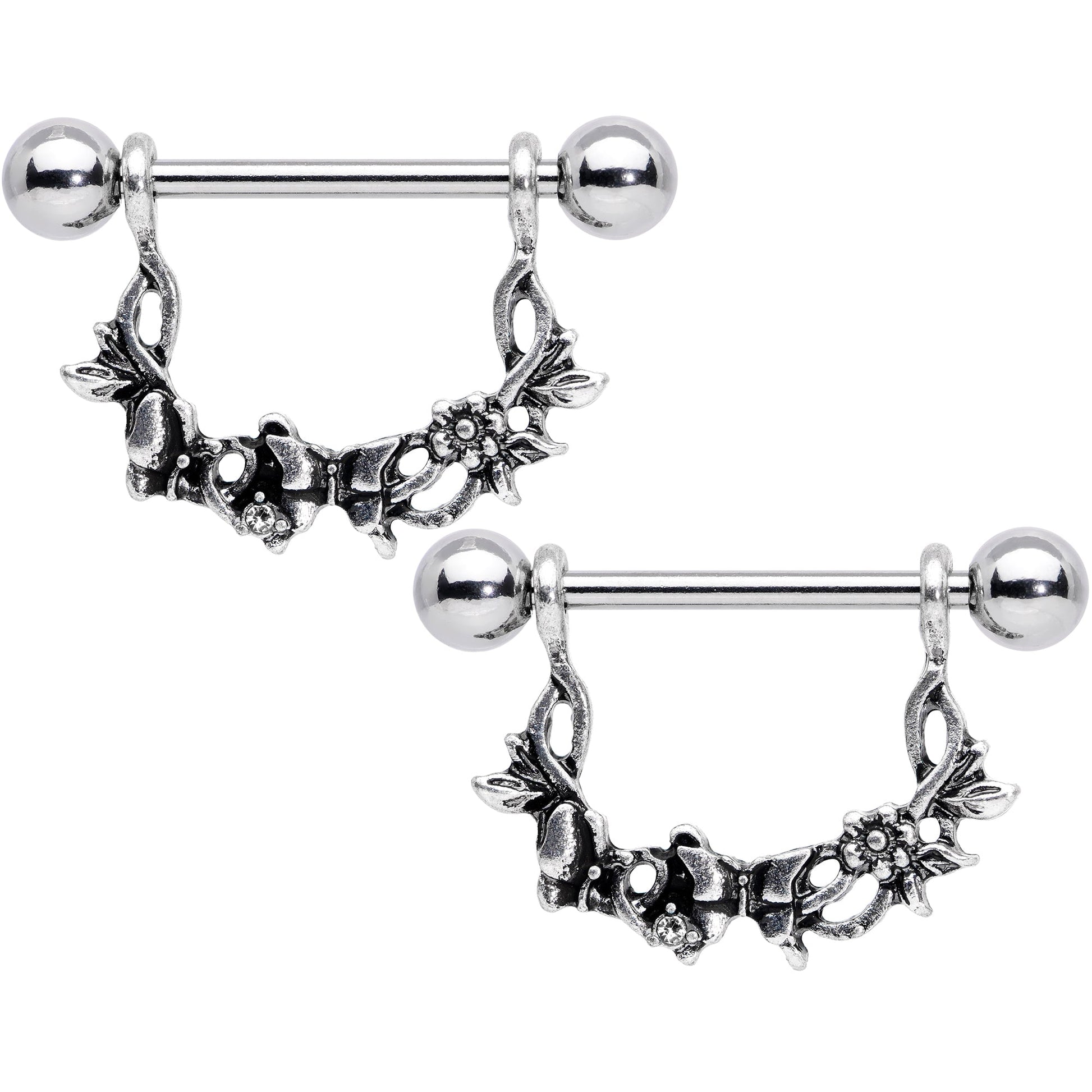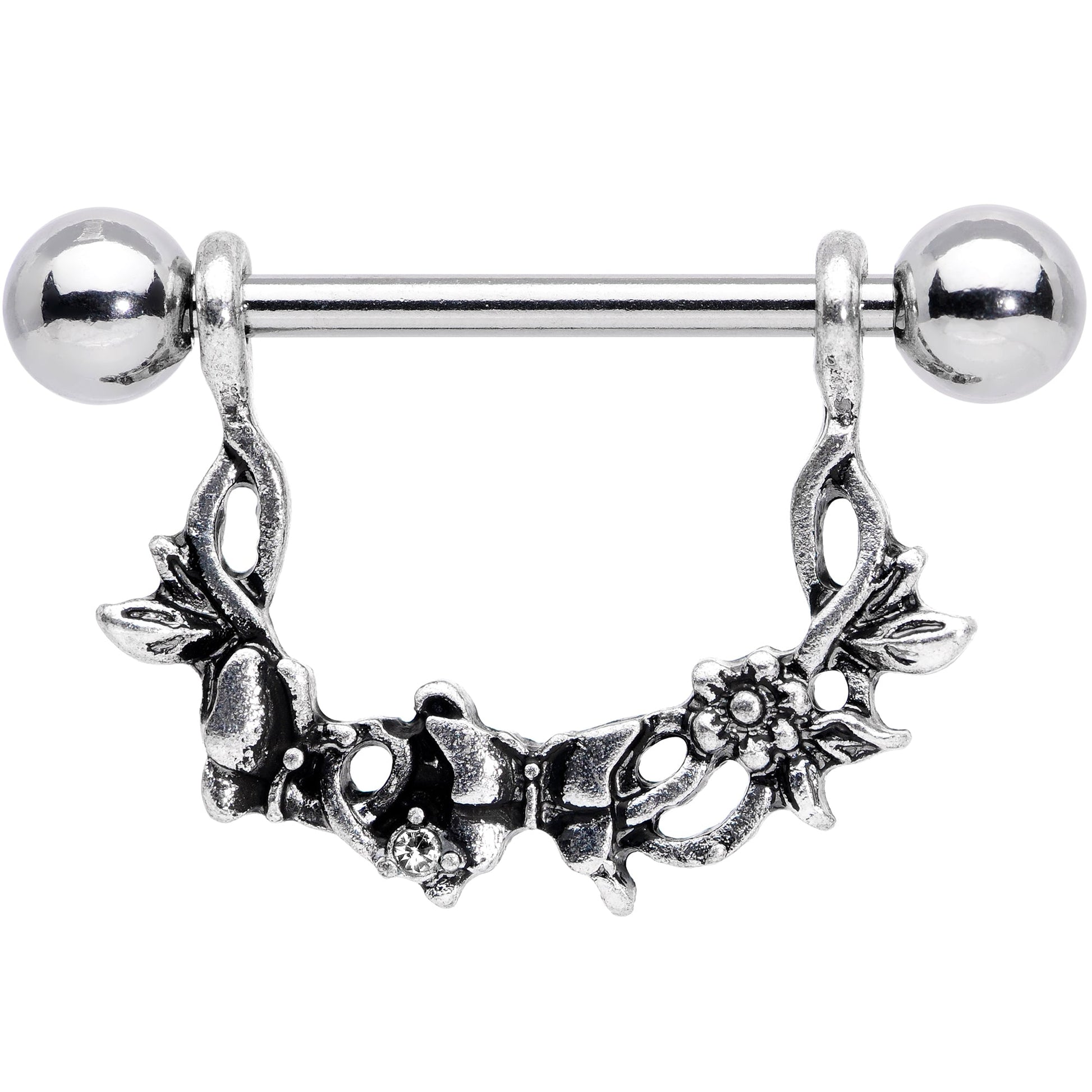 The butterfly on this 14 gauge nipple jewelry is bedecked with bows! It's made with 14mm durable 316L surgical grade stainless steel straight barbells with 5mm ball ends. Dangling beneath is an abstract butterfly, set between two stylized bows. The butterfly is set with a clear gem for an added pop of color that is truly eye-catching. Give your nipple piercings all things beautiful with these abstract butterfly and bows nipple rings! Sold as a set of two.Specifications