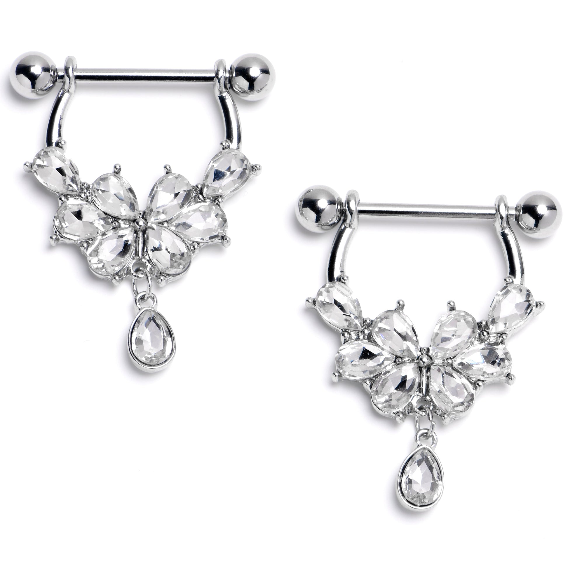 14G 9/16 Clear Gem Baroque Flower Bloom Dangle Nipple Ring Set