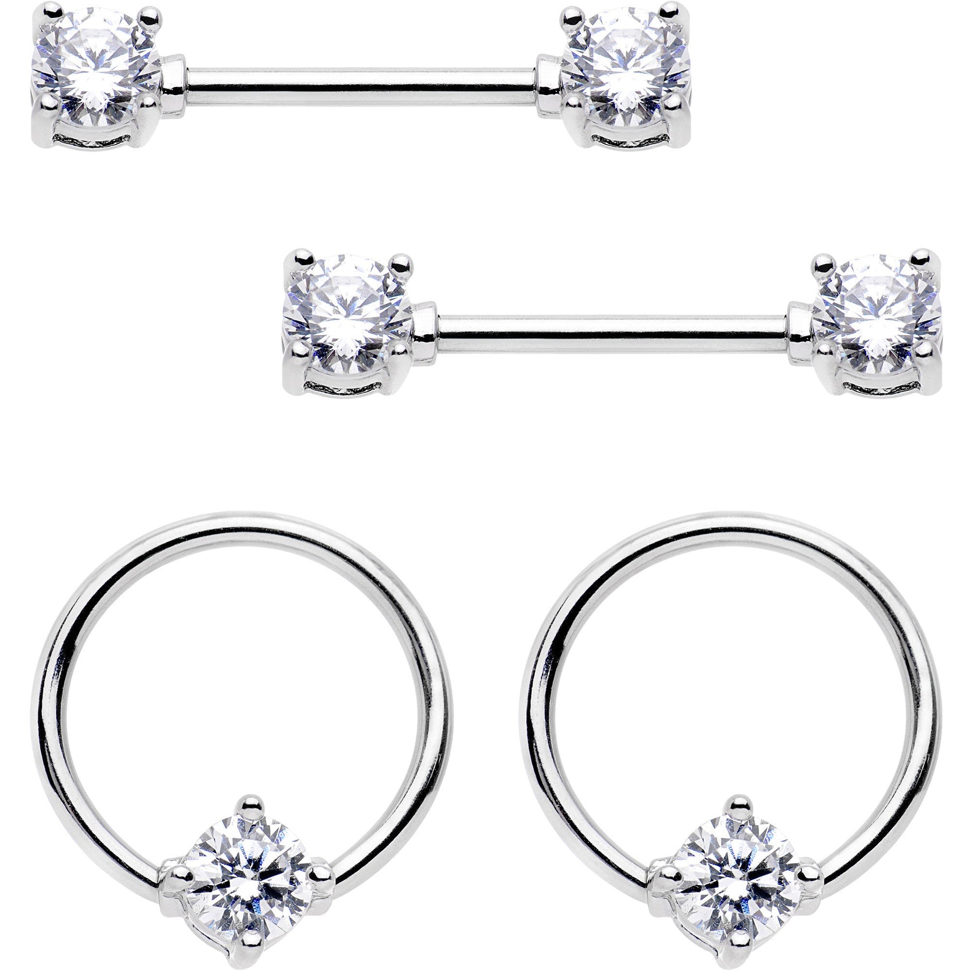 If you love to dress your breasts in a variety of different jewelry or even like to mix and match then this set of 14 gauge nipple jewelry is an excellent pick. Made with 14mm durable 316L surgical grade stainless steel straight barbells and circular rings, this double pair of nipple piercings includes two straight barbell nipple rings with 5mm clear gem ends as well as two BCR nipple rings with 5mm clear captive gem. Whether you are shopping for beauty or value, this set of four nipple rings is just for you.
