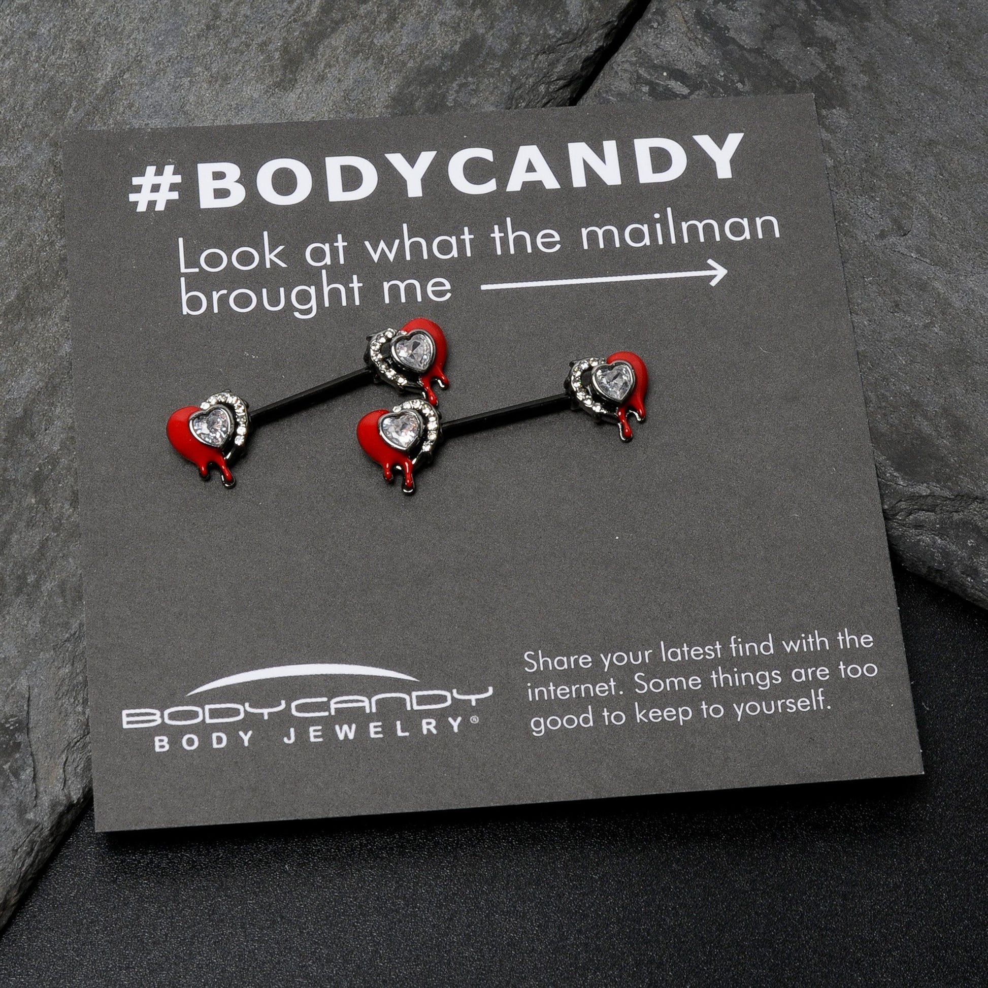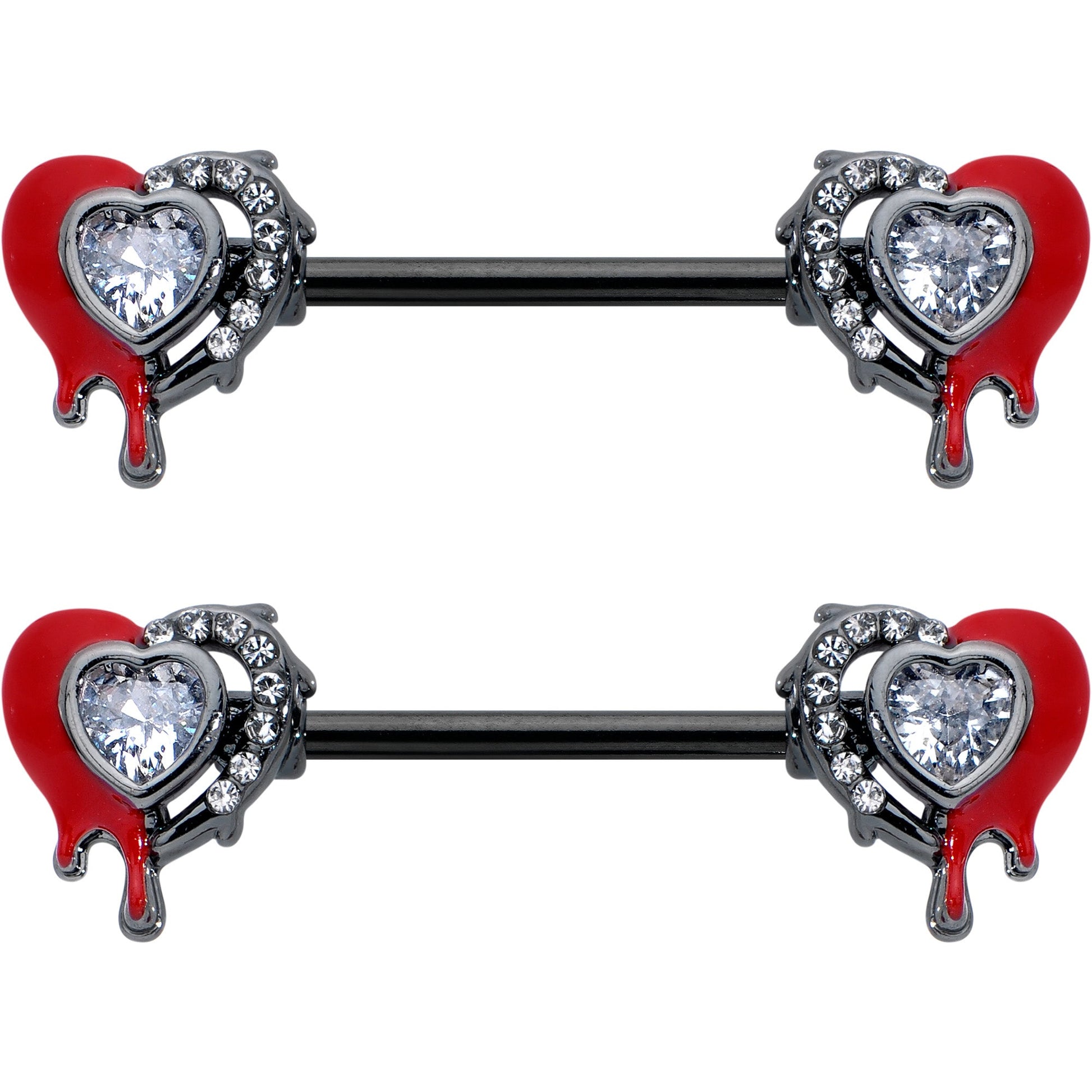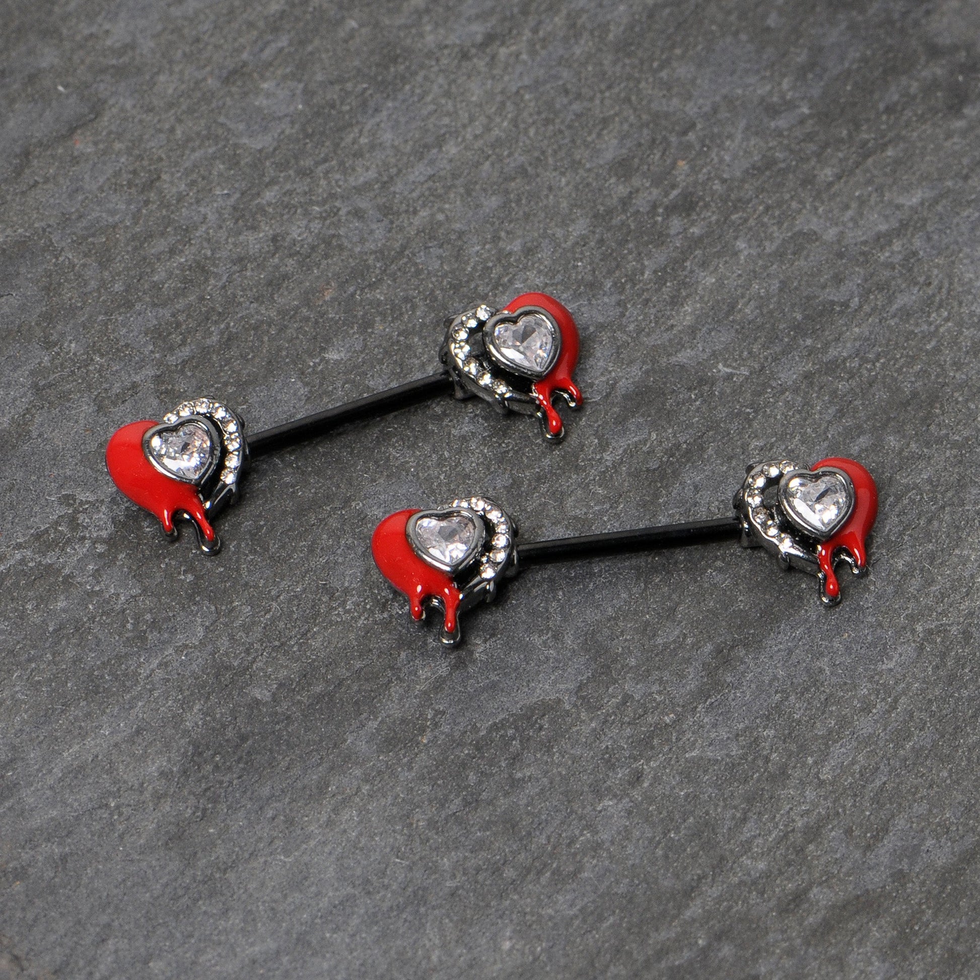 If you have been wounded by love, this 14 gauge nipple jewelry should be perfect for you. It is made with 14mm black PVD over 316L surgical grade stainless steel straight barbells. Each of the ends features a heart charm, with one side embellished with white inlay dots. The other sides are red and feature a dripping effect as if the hearts were bleeding. They have a clear gem heart at the center for added style. Wear your heartache with style when you are rocking these strikingly symbolic nipple piercing rings. Sold as a set of two.Specifications