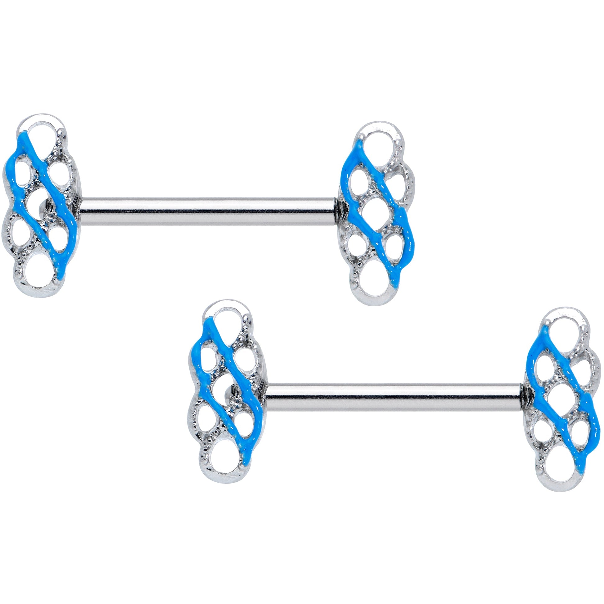 It's impossible knot to love this 14 gauge nipple jewelry! It's made with 14mm durable 316L surgical grade stainless steel straight barbells. Each of the ends features a Celtic knot inspired charm, with intricate detailing. The knot charm is set with clear gems and blue embellishment for an elegant touch of color that catches the eye without overwhelming it. Your look is sure to be all tied up and ready to roll with this elegant Celtic knot inspired nipple piercing jewelry! Sold as a set of two.Specifications