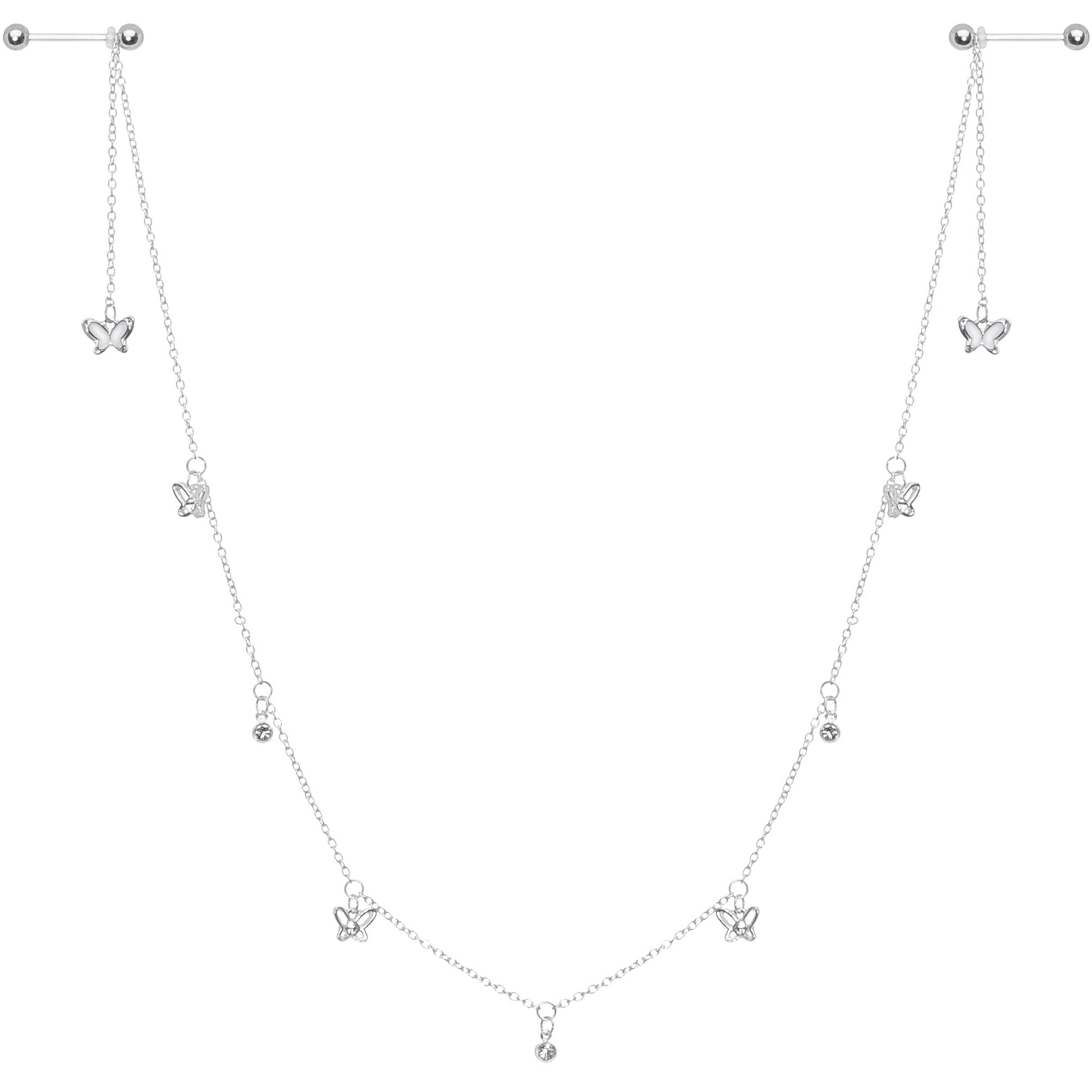 Get ready to celebrate all the animals of spring and summer with this pretty 14 gauge dangle nipple jewelry! Made with 14mm durable 316L surgical grade stainless steel straight barbells, these nipple piercings feature a 14" maximum length chain whose position can be adjusted with o-rings and butterfly dangle charms with white details or clear gems. Your partner will be hypnotized, but not by your eyes!Specifications