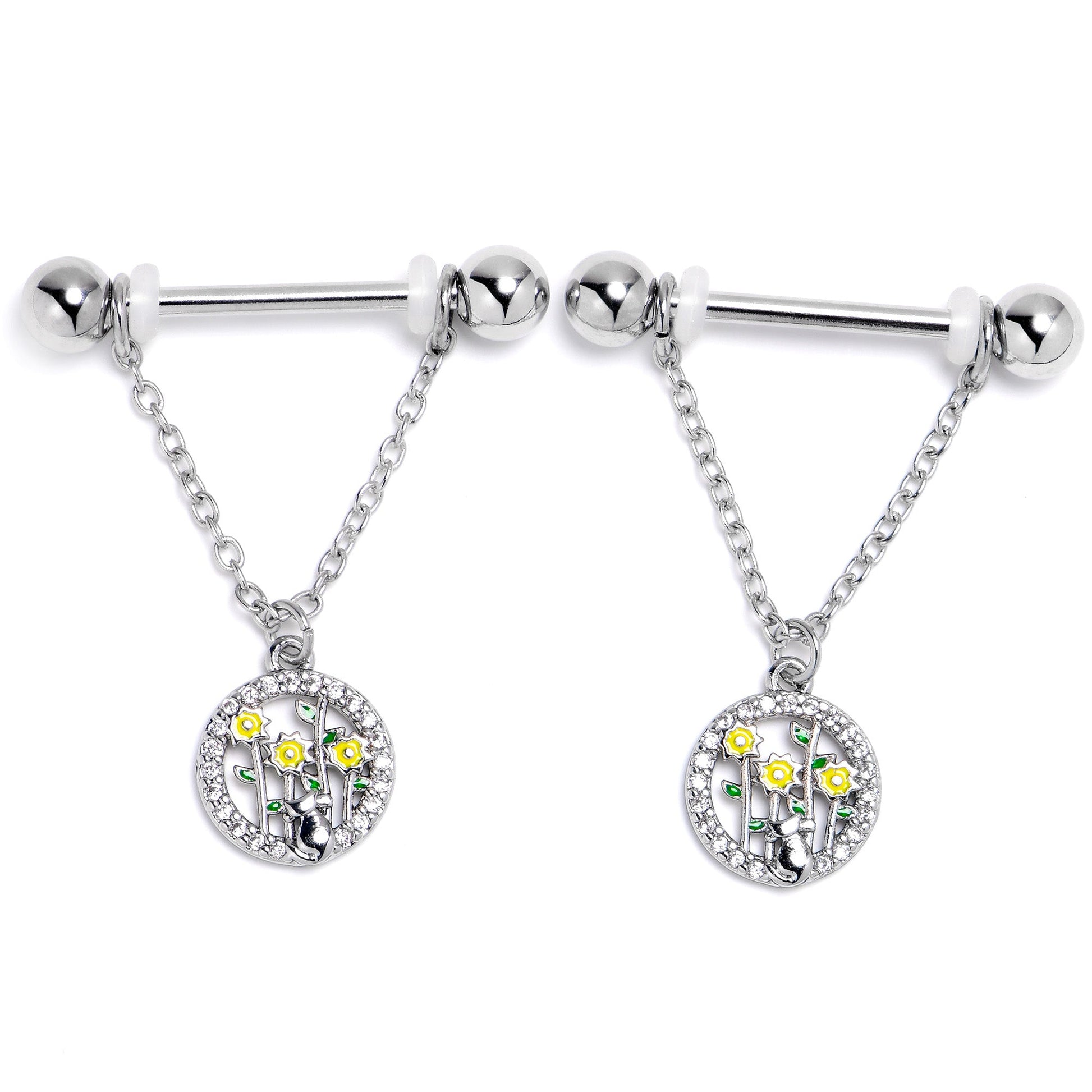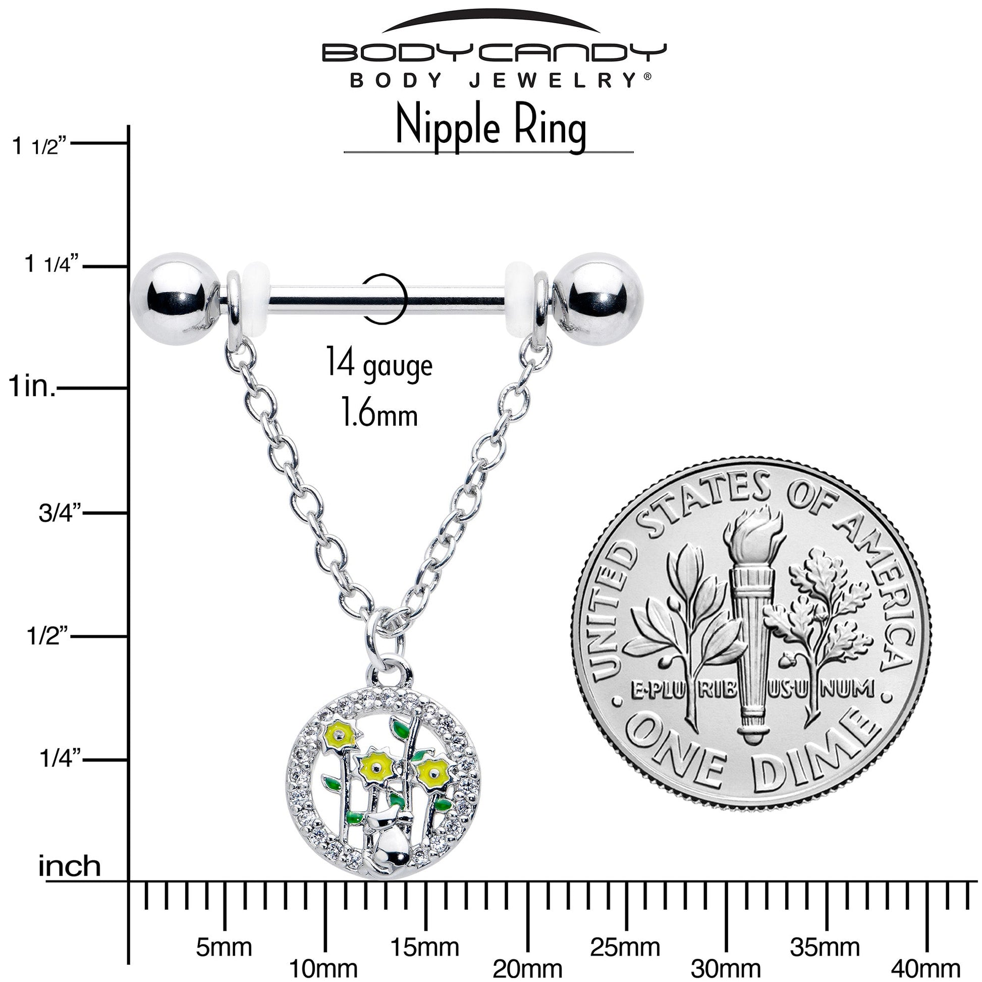 14 Gauge 9/16 Clear Gem Cat Yellow Flowers Chain Dangle Nipple Ring Set