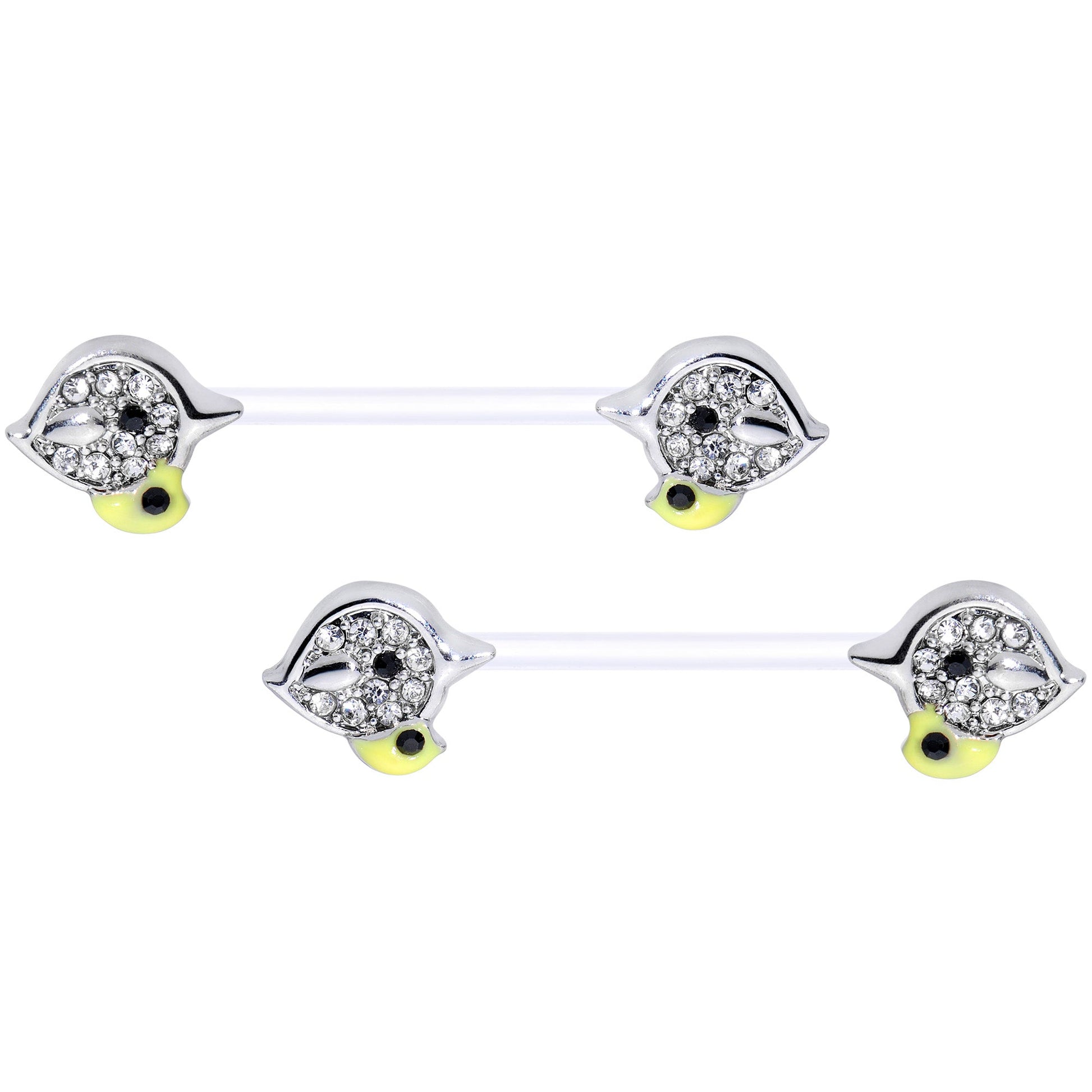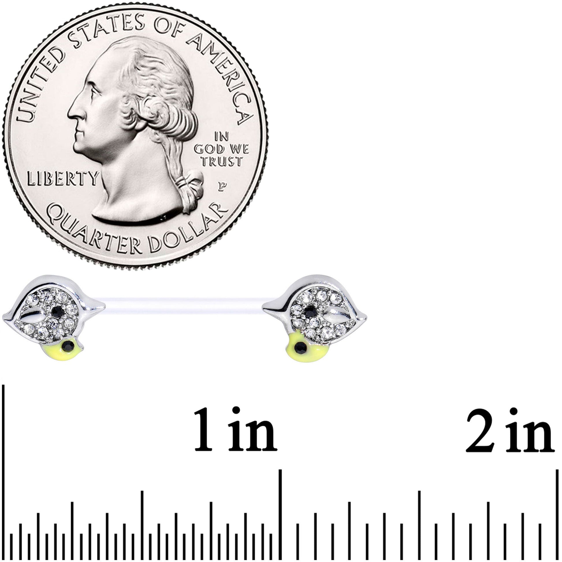 The mama birds on these 14 gauge nipple piercing rings are busy protecting their chicks....and looking fabulous while they do it! They're made with 14mm clear flexible Bioplast straight barbells, perfect for those who are pierced and pregnant as well as those who are just pierced. The ends feature a bird charm paved in small clear gems with a tiny black gem eye. Sitting with the mama bird is a tiny yellow chick, also with a black eye for a cohesive appearance. Stylish and sweet, these are birds you'll never kick out of the nest! Sold as a set of two.Specifications