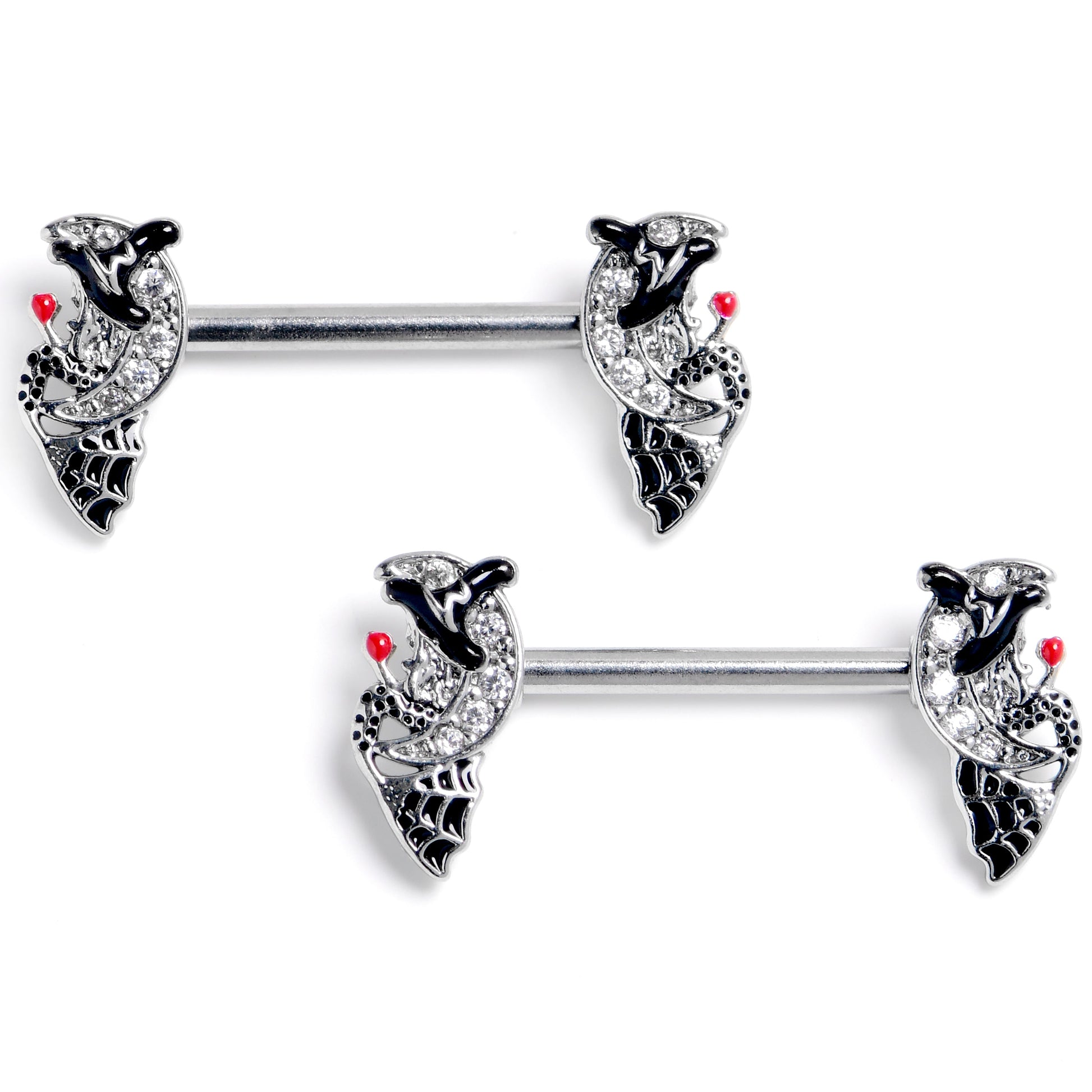 The witches on this 14 gauge nipple jewelry have found the perfect spot for some stargazing. It is made with 14mm durable 316L surgical grade stainless steel straight barbells. Each of the ends features a crescent moon charm, set with clear gems. Sitting on the moons are witches, with black detailed hats, spiderweb embellishment on their dresses, and red orbs that they appear to be gazing into. You will be seeing stars too with these wonderful witch nipple piercing rings. Sold as a set of two.Specifications