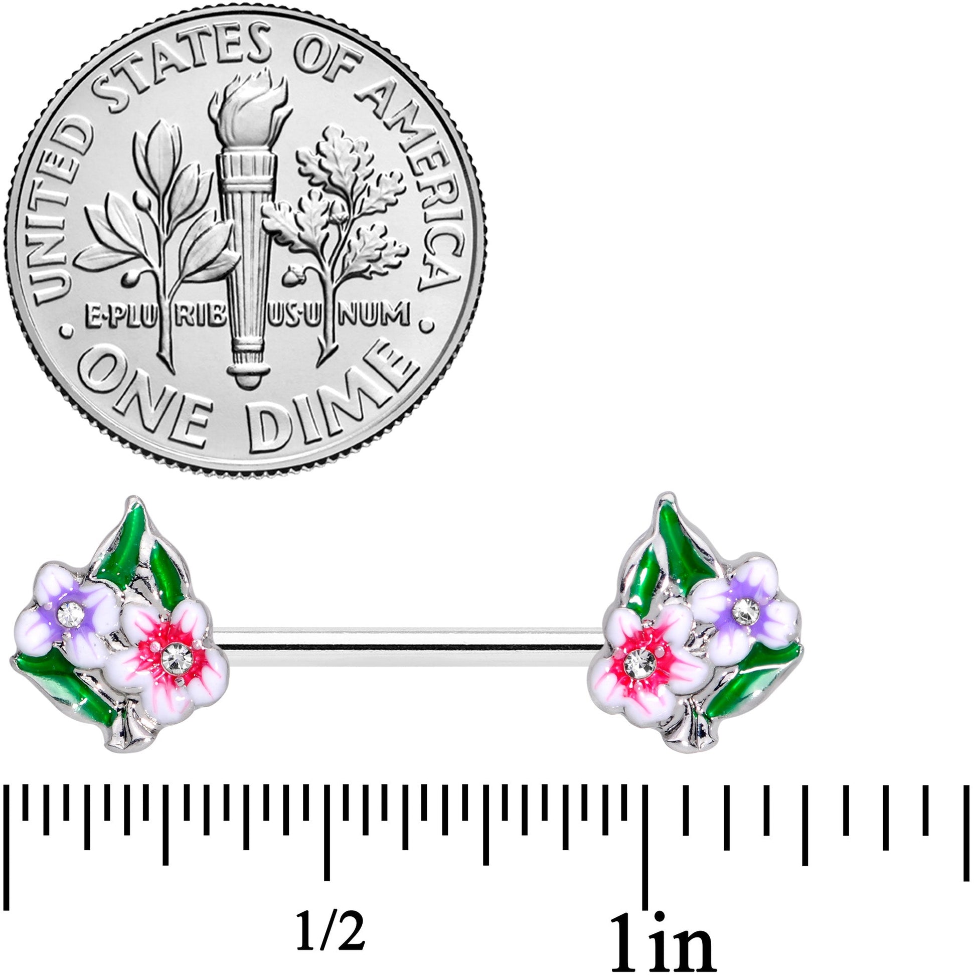 Give yourself fresh flowers every day with these 14 gauge nipple rings! They're made with 14mm durable 316L surgical grade stainless steel hinged straight barbells. Each end features a two flower charm one pink and one purple, surrounded by deep green leaves and clear gem centers for a look that's cohesive and luxe. These beautiful blooms are sure to add some fabulously floral style to your nipple piercings! Sold as a set of two.Specifications