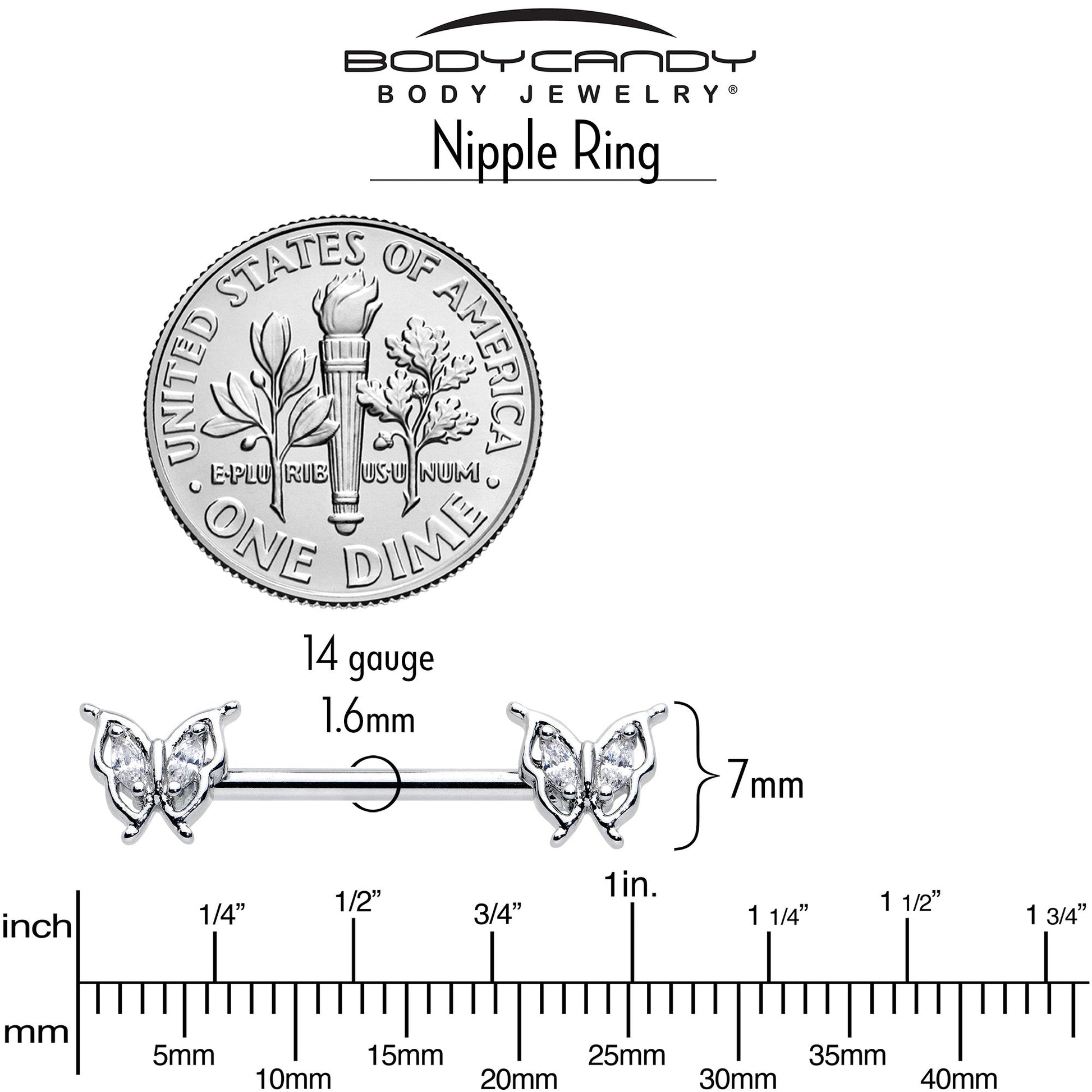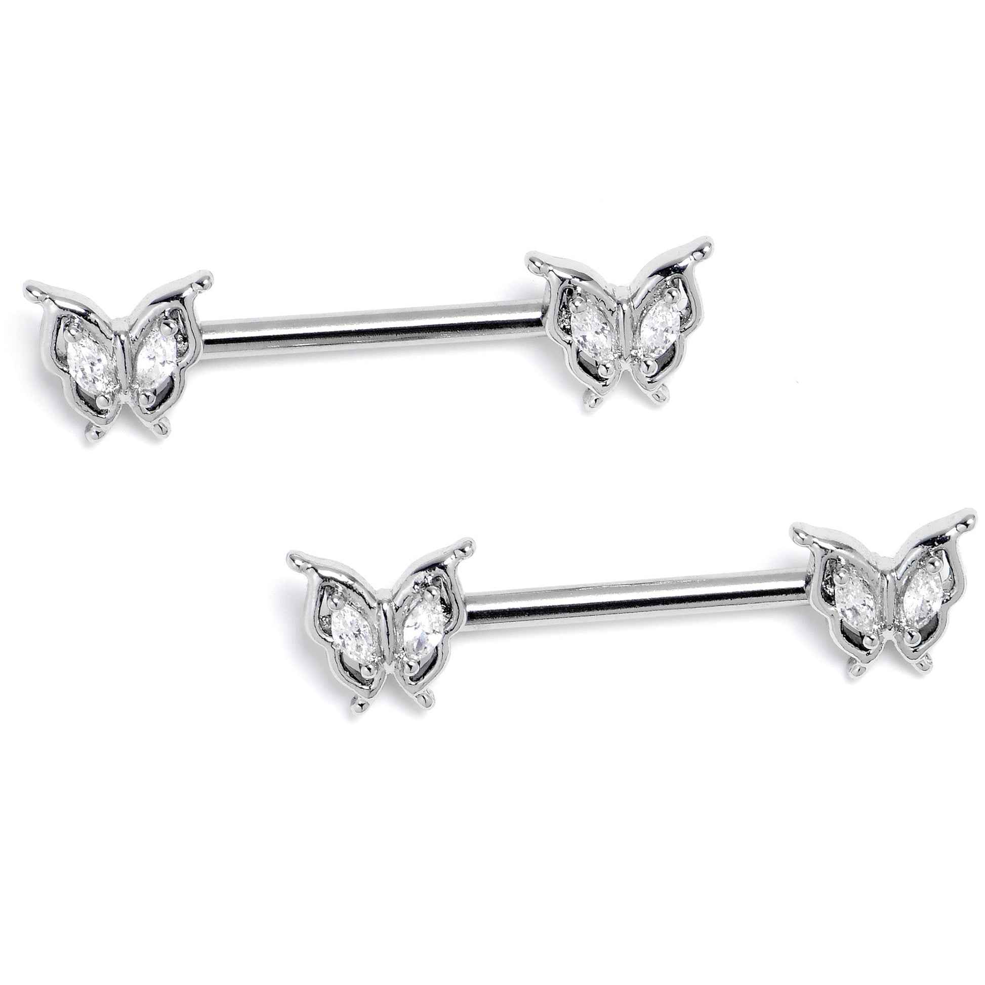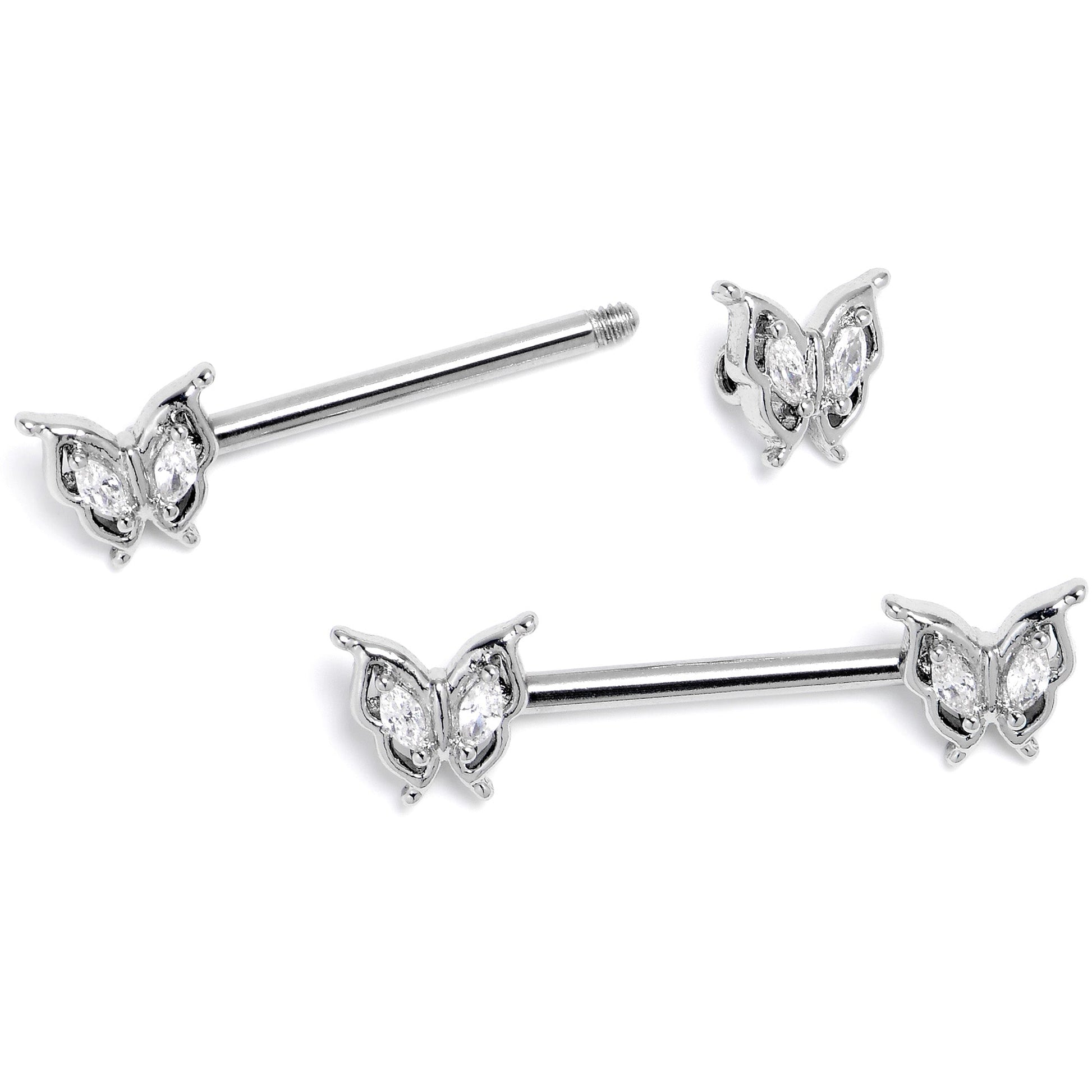 Add some butterfly fabulousness to your look with this 14 gauge nipple jewelry. It is made with 14mm durable 316L surgical grade stainless steel straight barbells. Each of the ends features a butterfly charm, embellished with simple detailing. Their wings are set with clear gems for an added touch of style. Fill your look with fabulous fashion with these lovely butterfly nipple piercing rings. Sold as a set of two.Specifications