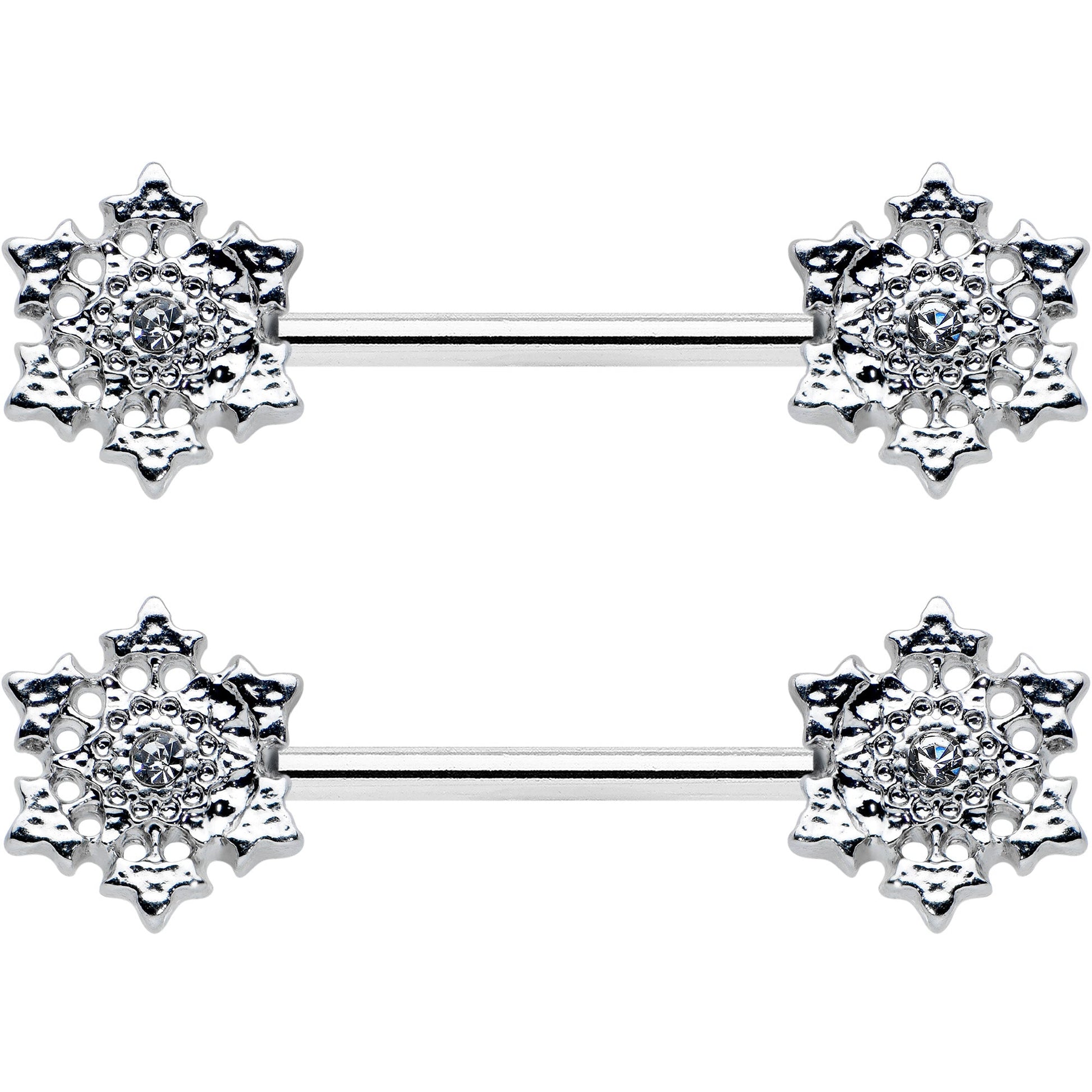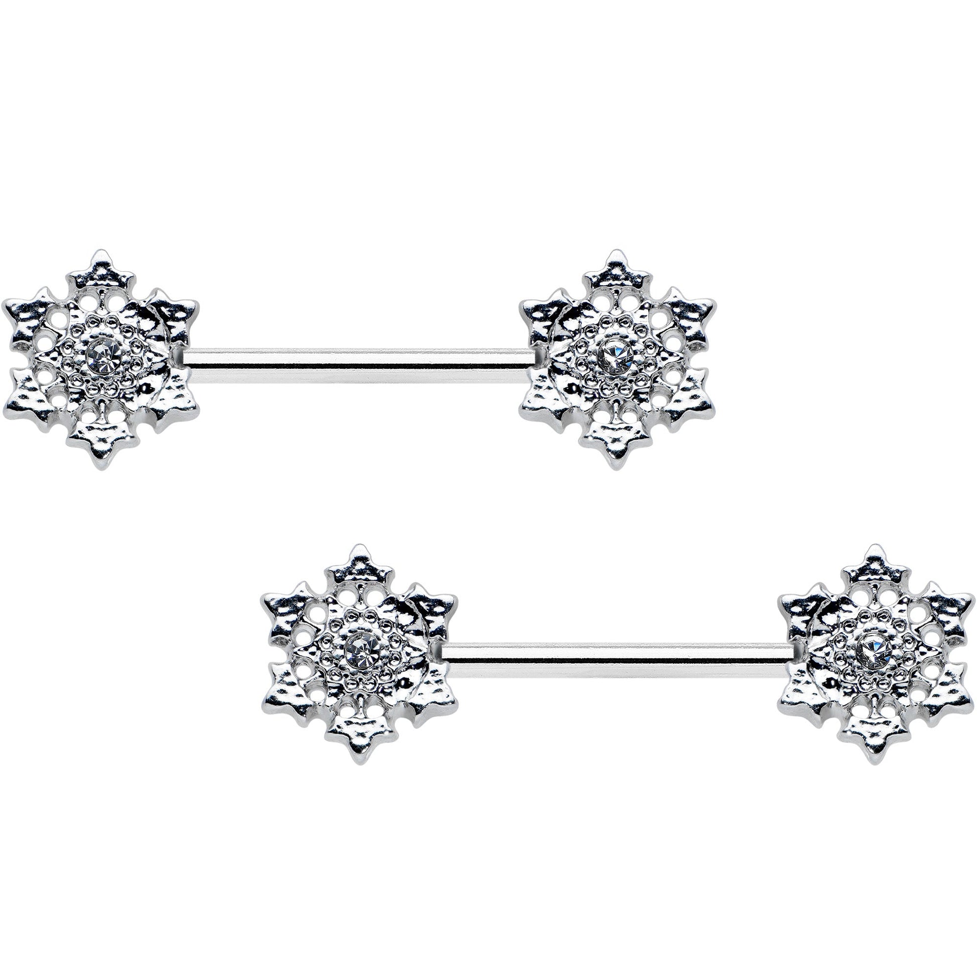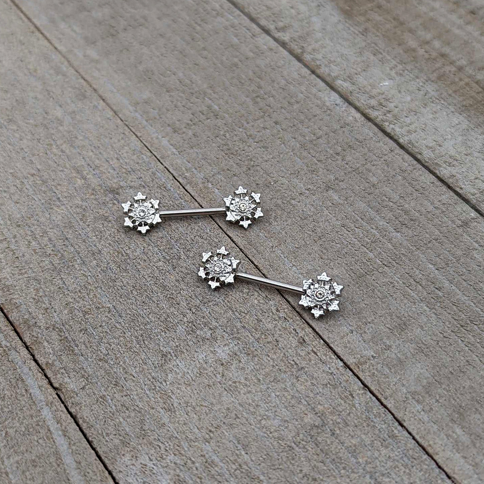 14 Gauge 9/16 Clear Gem Filigree Winter Snowflake Nipple Ring Set