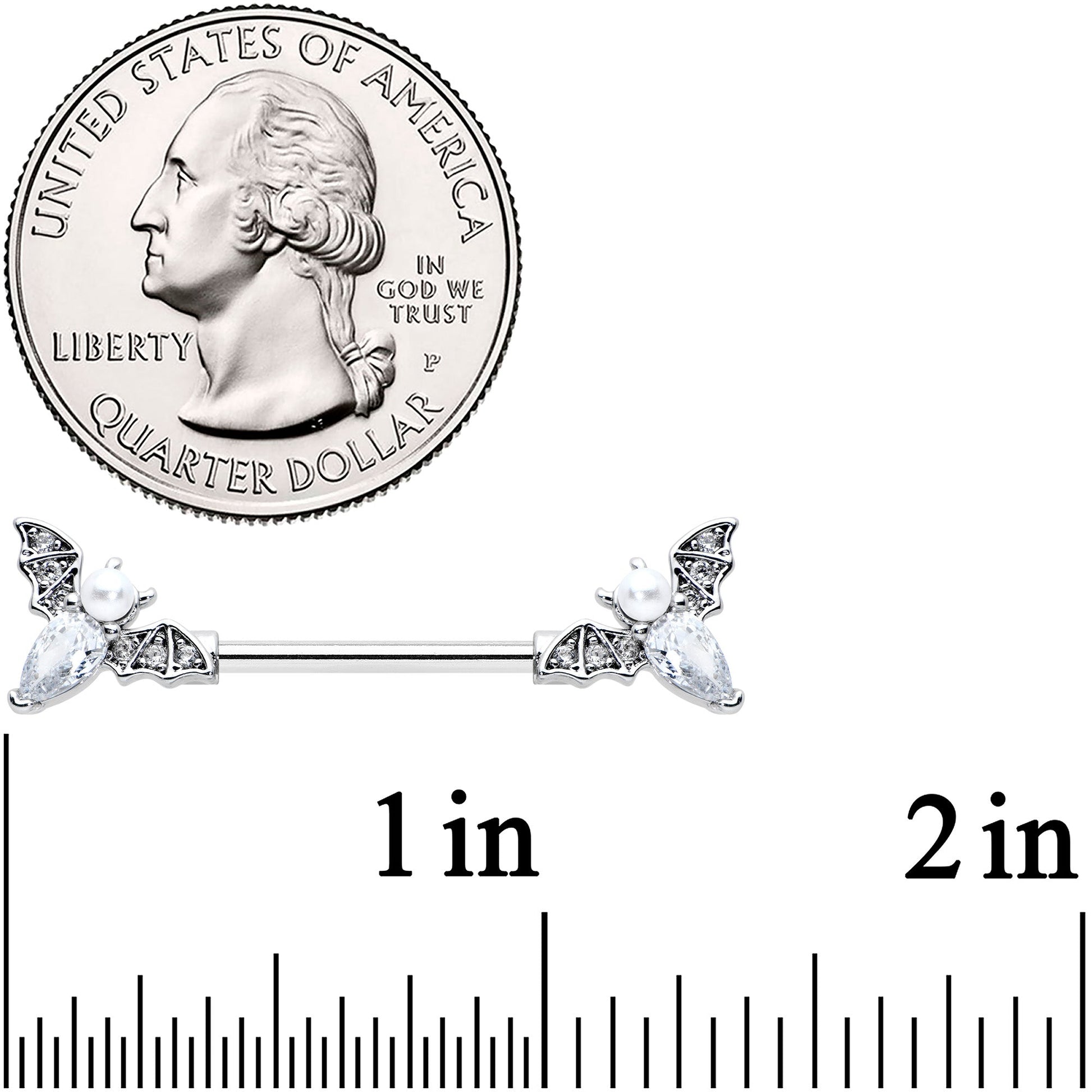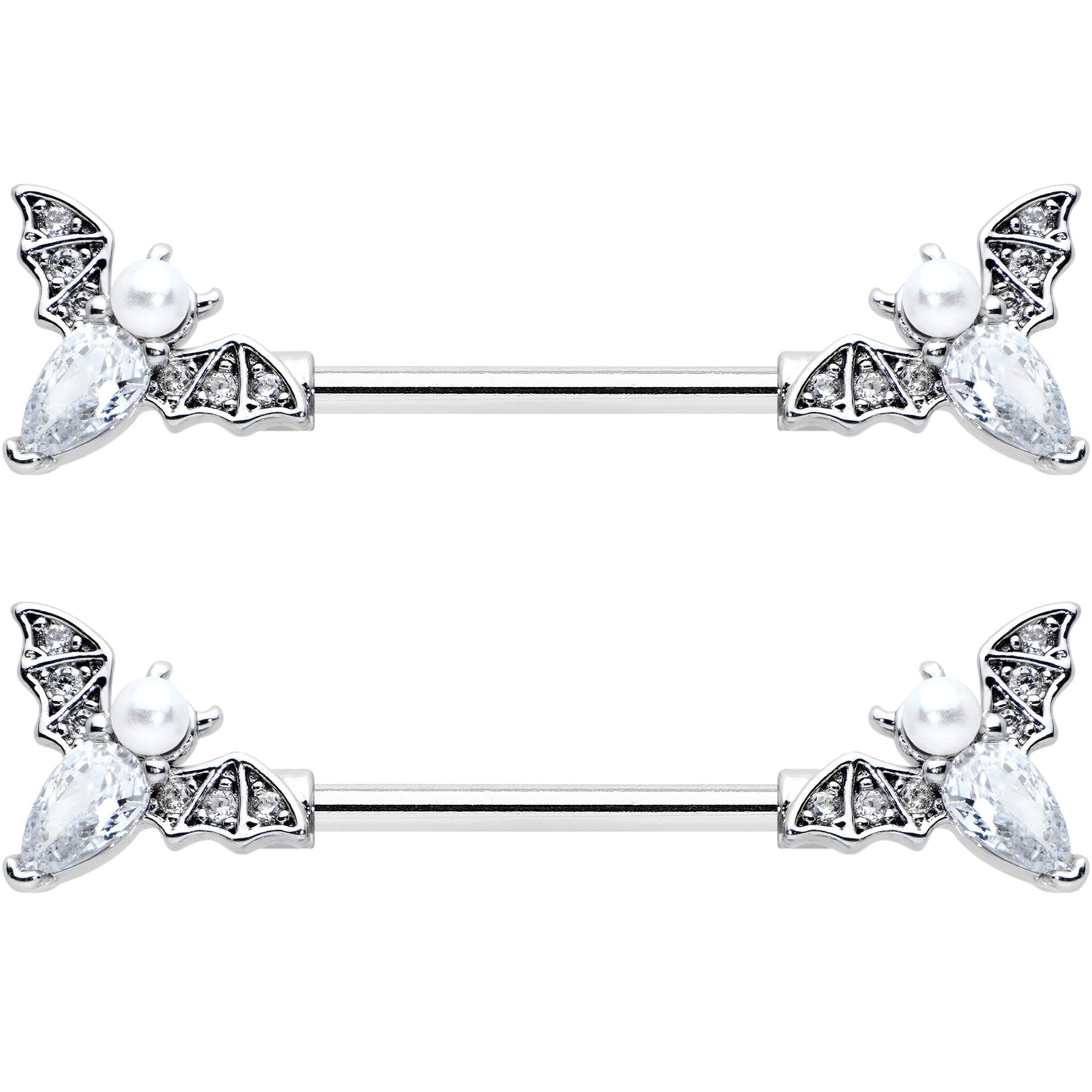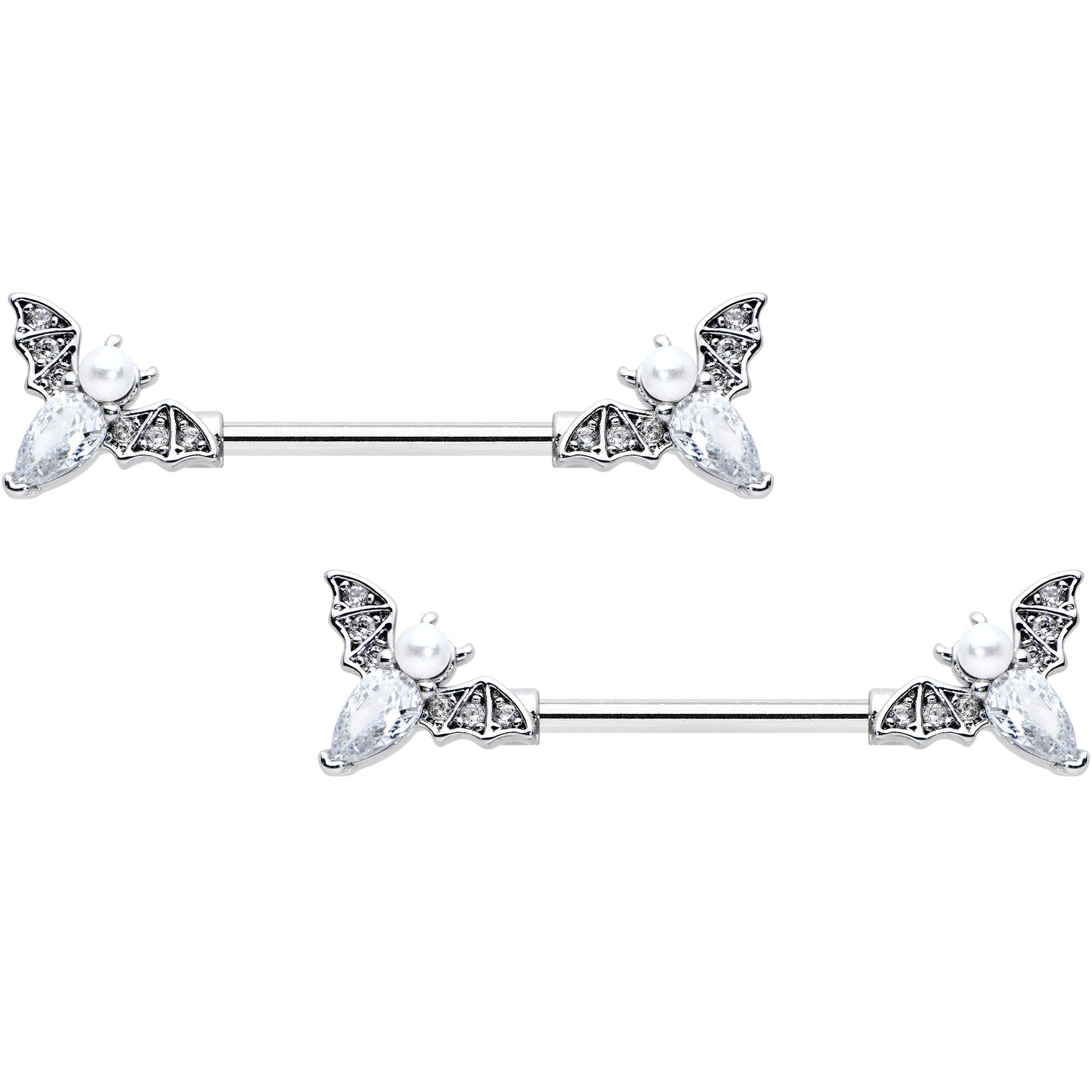 Let your piercings soar through the night skies like the bat on this 14 gauge nipple jewelry! It's made with 14mm durable 316L surgical grade stainless steel straight barbells. The ends feature bat charms with their wings set with small clear gems. The bat's body is a single oval clear gem while its head is a white pearlescent orb. They're perfect for Halloween or to accessorize any gothic aesthetic. You're bound to be besotted with these Halloween bats! Sold as a set of two.Specifications