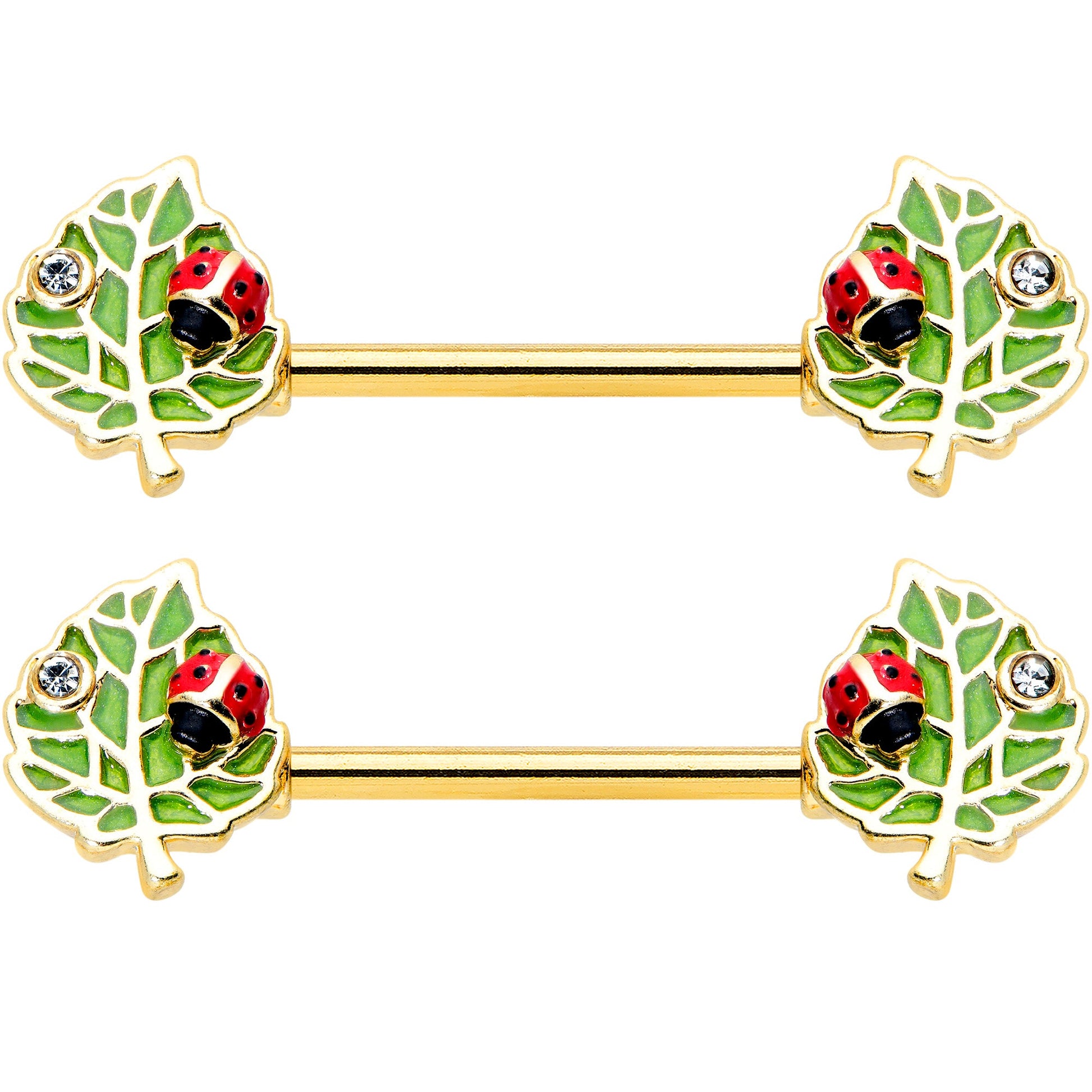 The little ladybugs on this 14 gauge nipple jewelry have found a perfectly gorgeous place to chill! It's made with 14mm gold tone PVD over 316L surgical grade stainless steel straight barbells. Each of the ends features a leaf charm, with matching tone detailing. The leaves feature a tiny ladybug embellishment, a sweet surprise for those who look closer, as well as small clear gem. Let your style feel as relaxed and contemporary as the ladybugs on this charming nipple piercing rings! Sold as a set of two.Specifications
