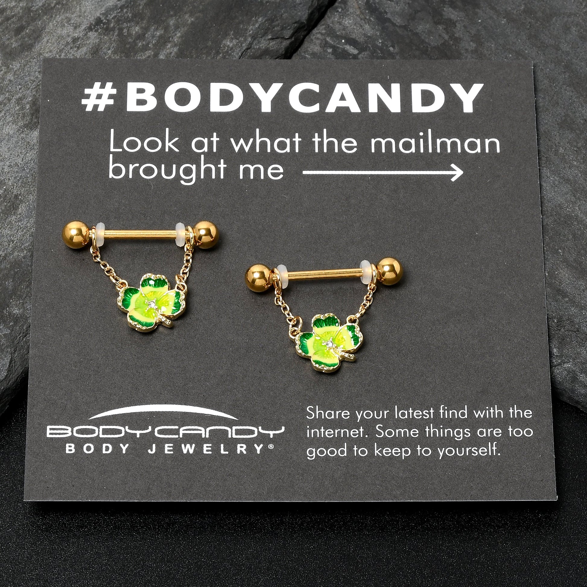 14G 9/16 Clear Gem Gold Hue Lucky Shamrock Dangle Nipple Ring Set