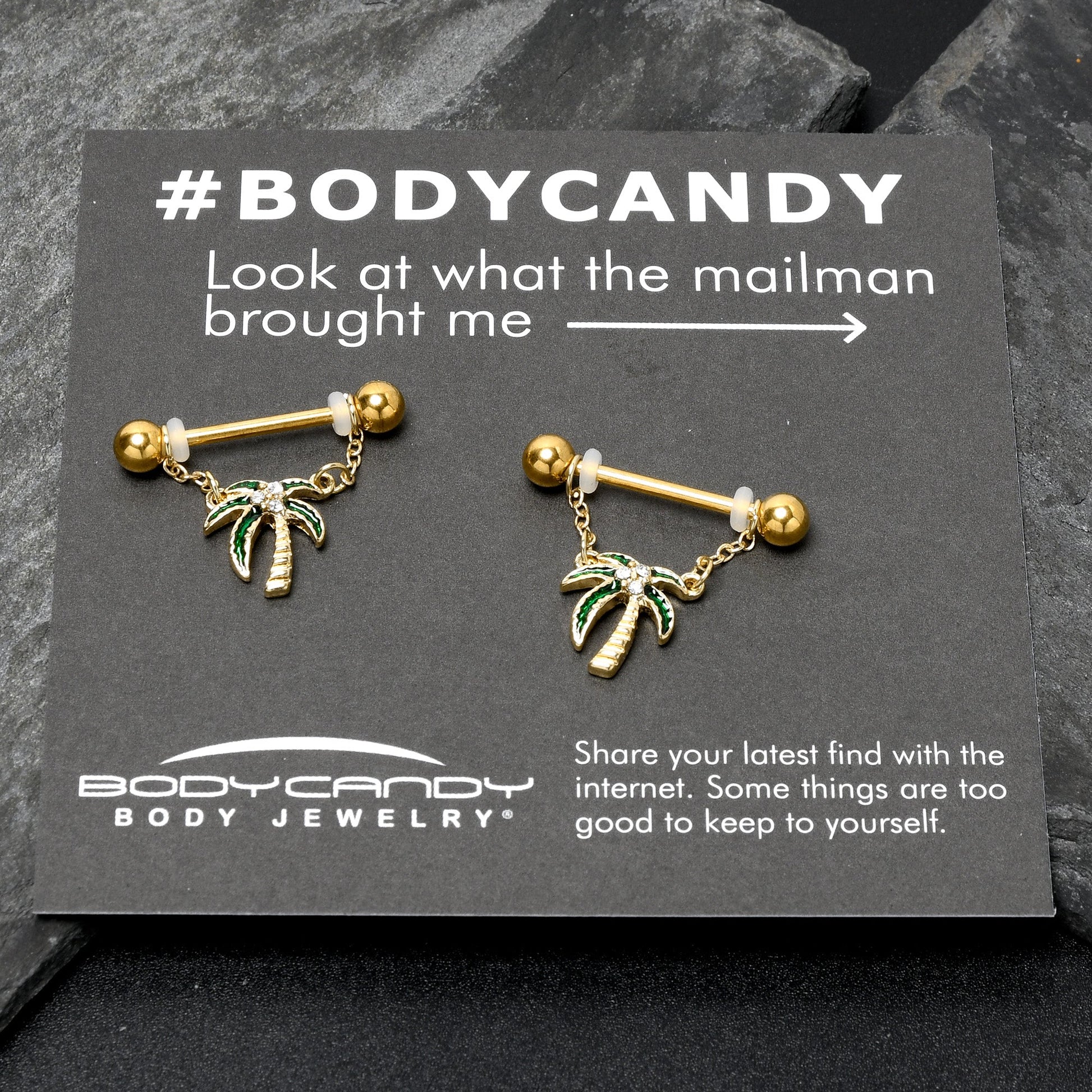 Take a trip to the tropics in total style like on this 14 gauge nipple jewelry. It is made with 14mm gold tone electroplate over 316L surgical grade stainless steel straight barbells with 5mm ball ends. Each barbell features a length of dangling chain that supports an elegant palm tree charm. The trunks feature textured detailing while the tops of the trees are set with clear gems. The leaves feature green inlay for elegant color contrast. Grab your beach towel and sunscreen, it is time to rock a tropical look with these perfect palm tree nipple piercing rings. Sold as a set of two.Specifications