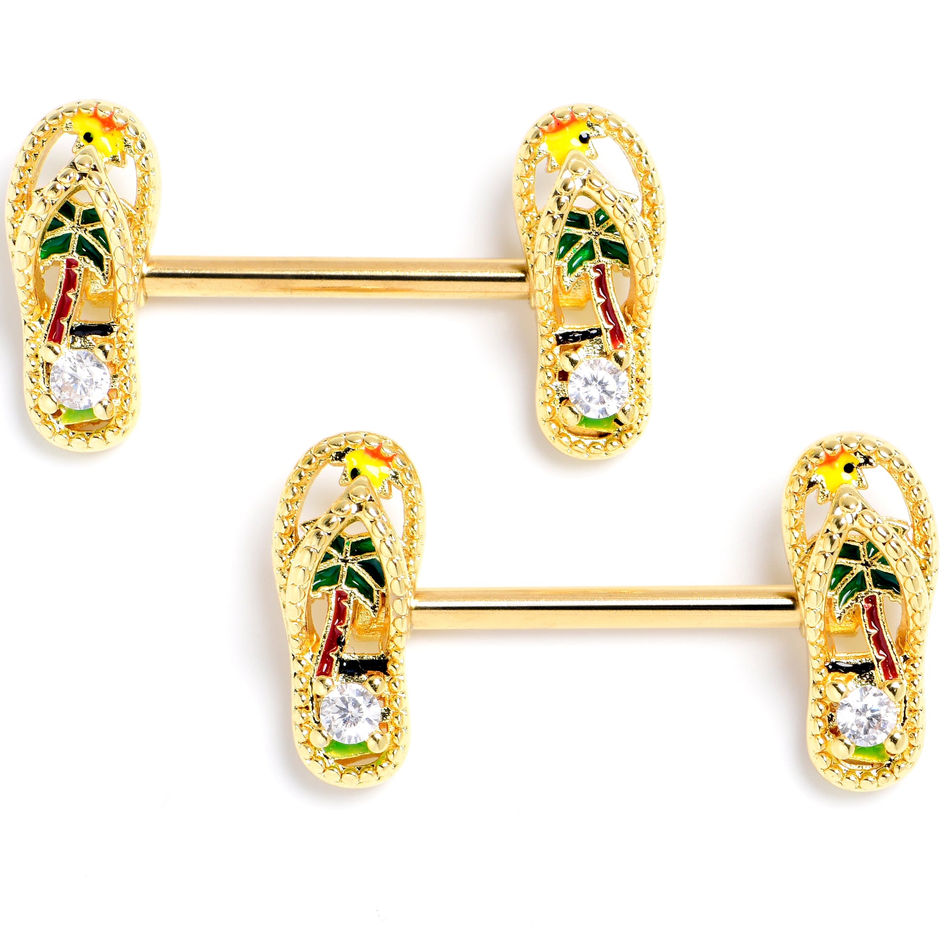 You are going to flip for the flip flops on this 14 gauge nipple jewelry. It is made with 14mm gold tone PVD over 316L surgical grade stainless steel straight barbells. Each of the ends features a beach sandal charm, with textured straps and clear gems set into the ends. Get ready to add some summery sandal style to your look with these fabulous flip flop nipple piercing rings. Sold as a set of two.Specifications