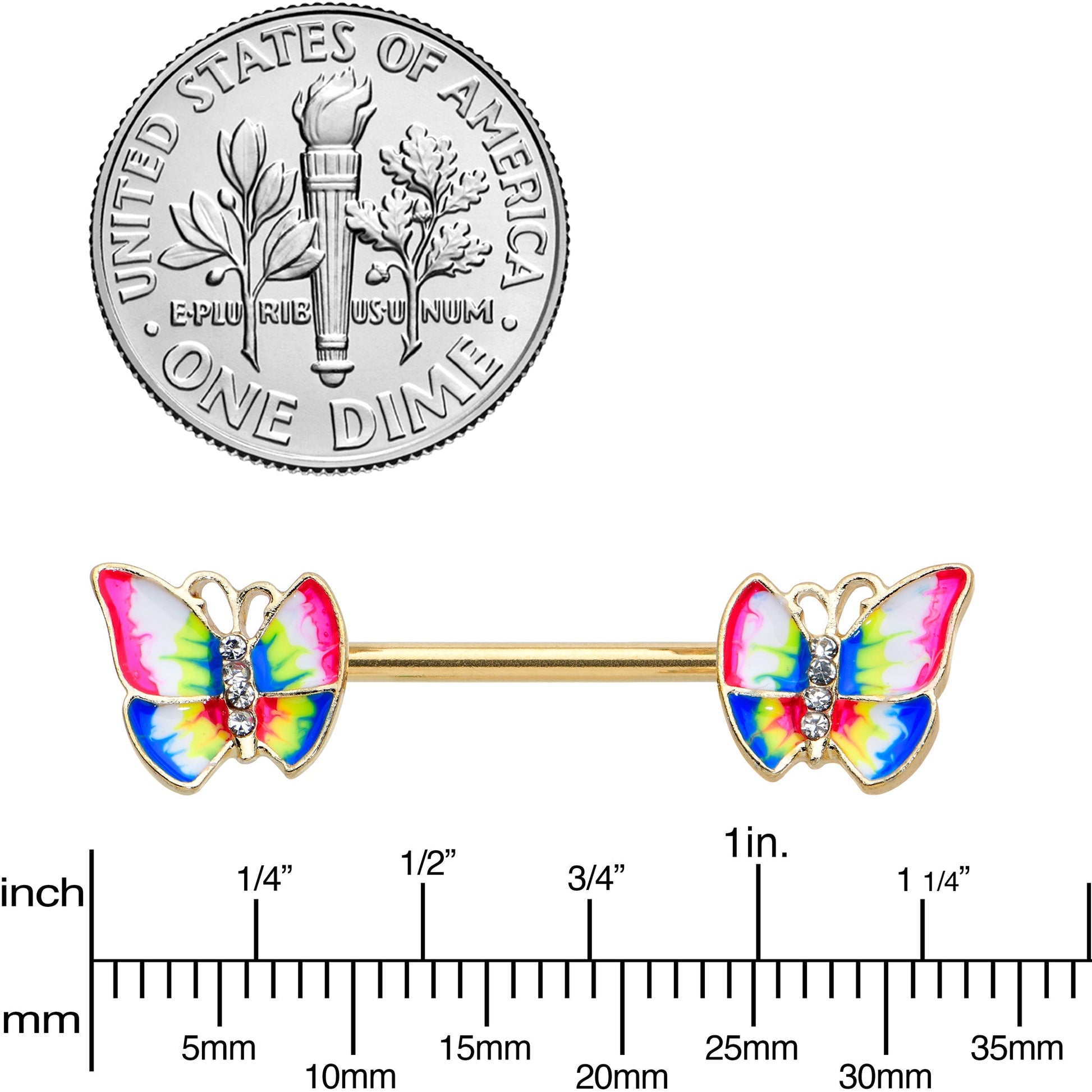 Brighten your look with this 14 gauge nipple jewelry! It's made with 14mm gold tone PVD over 316L surgical grade stainless steel straight barbells. Each of the ends features a vividly color butterfly charm. The butterflies are set with clear gems down the center and feature wildly colorful rainbow-edged wings. Perfect for Pride month or any month, these butterfly nipple piercing rings is sure to keep your look bright! Sold as a set of two.Specifications