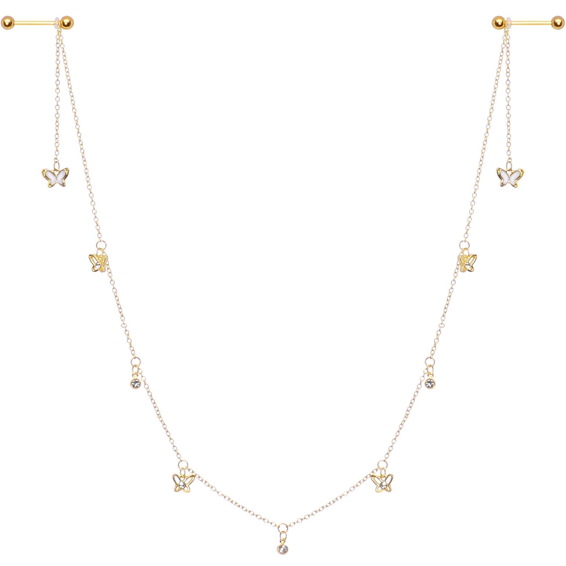 Get ready to celebrate all the animals of spring and summer with this pretty 14 gauge dangle nipple jewelry! Made with 14mm gold tone plated over 316L surgical grade stainless steel straight barbells, these nipple piercings feature a 14" maximum length chain whose position can be adjusted with o-rings and butterfly dangle charms with white details or clear gems. Your partner will be hypnotized, but not by your eyes!Specifications