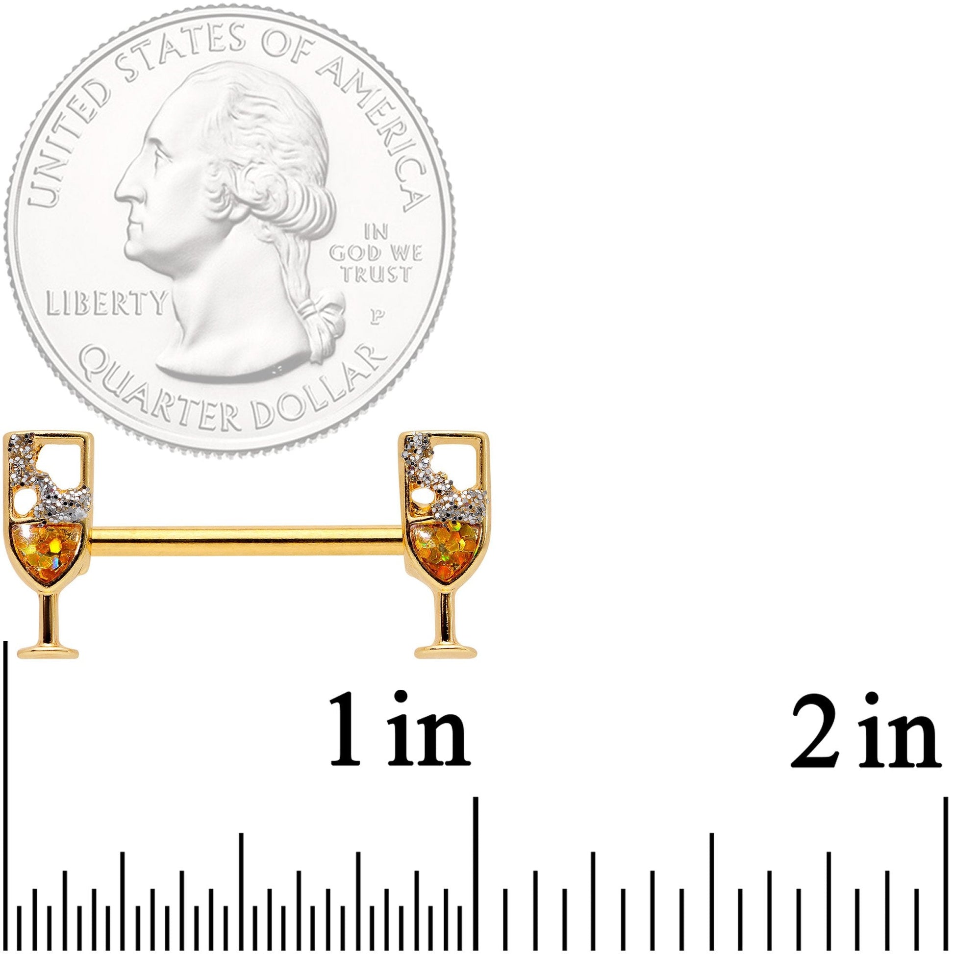 Who doesn't love a glass of champagne to celebrate life's victories? Now you can celebrate them and never wake up hung over with these 14 gauge nipple piercings! They're made with 14mm gold tone anodized over 316L surgical grade stainless steel straight barbells. The ends feature charms of glasses of champagne and small clear gems representing bubbles floating up inside the glass. It's a look that's both fashionable and festive - cheers to that! Sold as a set of two.Specifications