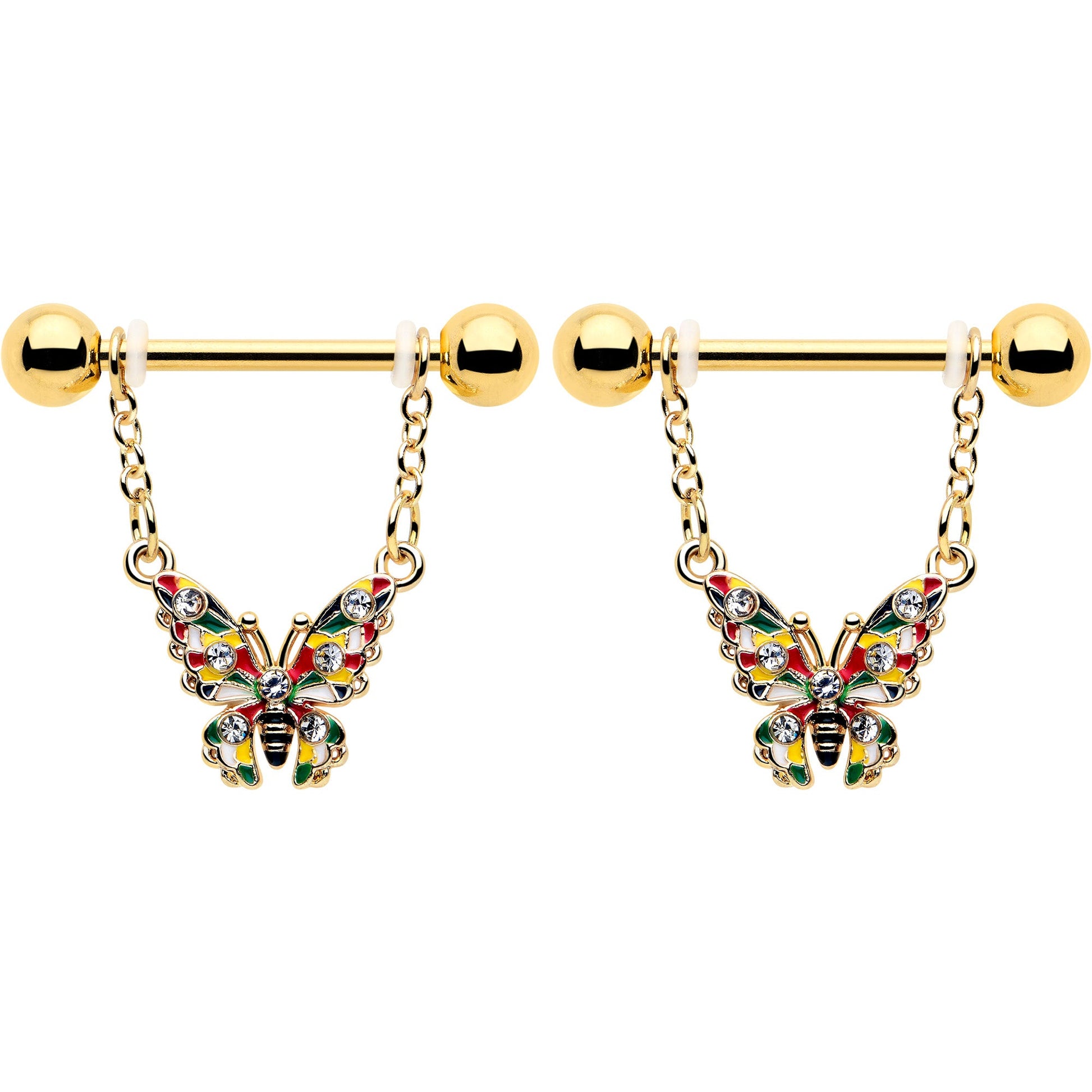 The butterflies on this 14 gauge nipple jewelry are rocking all the color and style you could possibly want. It's made with 14mm gold tone PVD over 316L surgical grade stainless steel straight barbells with 5mm ball ends. Each barbell supports a double length of matching chains that support a butterfly charm. The butterflies have wings inlaid in shades of red, yellow, and green with color block styled detailing. They are further embellished with clear gems. Grab your paintbrush and spread your wings, it is time for colorful style with these beautiful butterfly nipple piercing rings. Sold as a set of two.Specifications