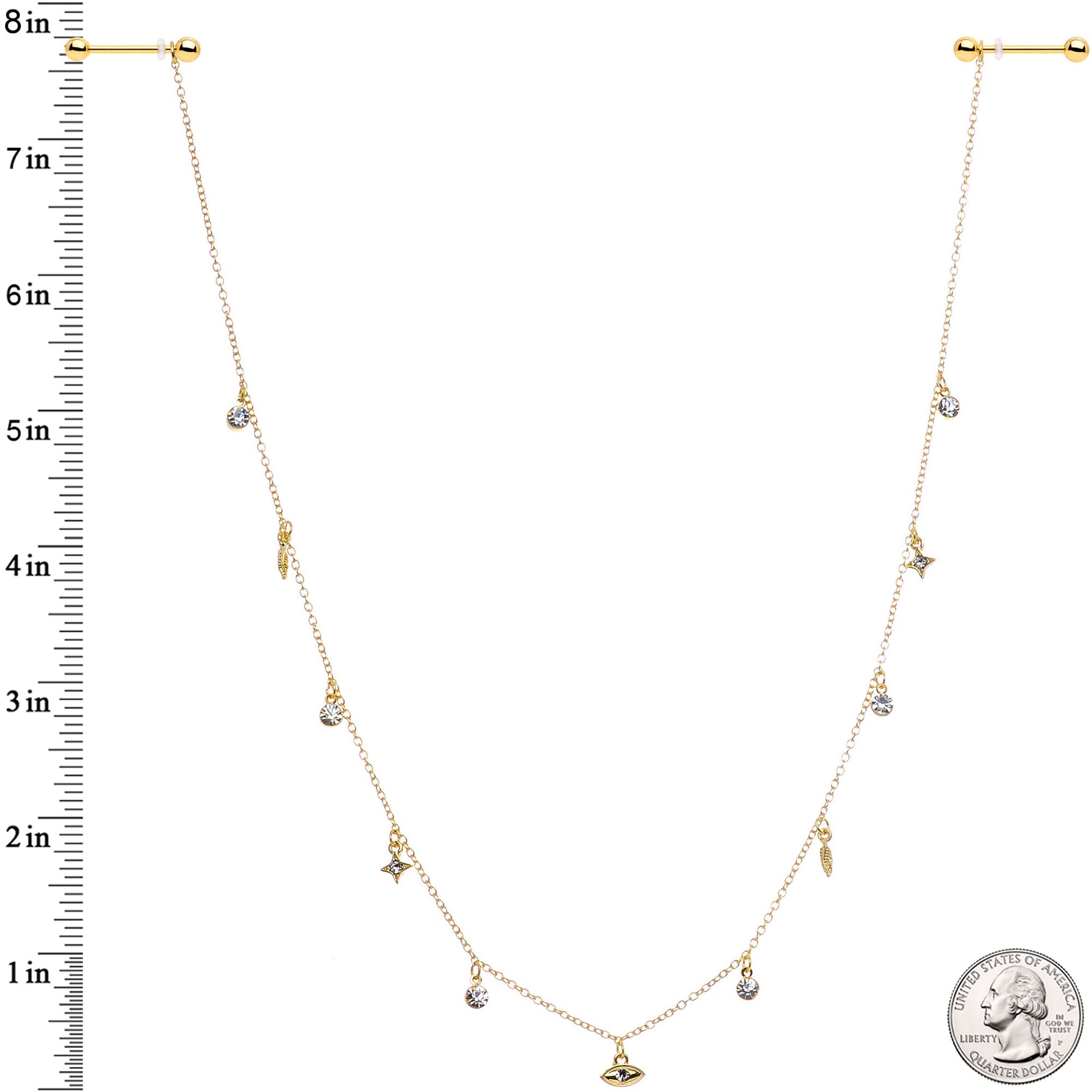 Show off your spiritual side with style when you're wearing this 14 gauge nipple jewelry! It's made with 14mm gold tone PVD over 316L surgical grade stainless steel straight barbells with 5mm ball ends. Dangling between the two barbells is a 15" length of gold tone chain. Dangling from the chain are round clear gems, alternating with eye, star, and feather charms. The eye and star charms are also set with clear gems. This mystical-themed nipple chain is sure to take your look to a whole new dimension!Specifications