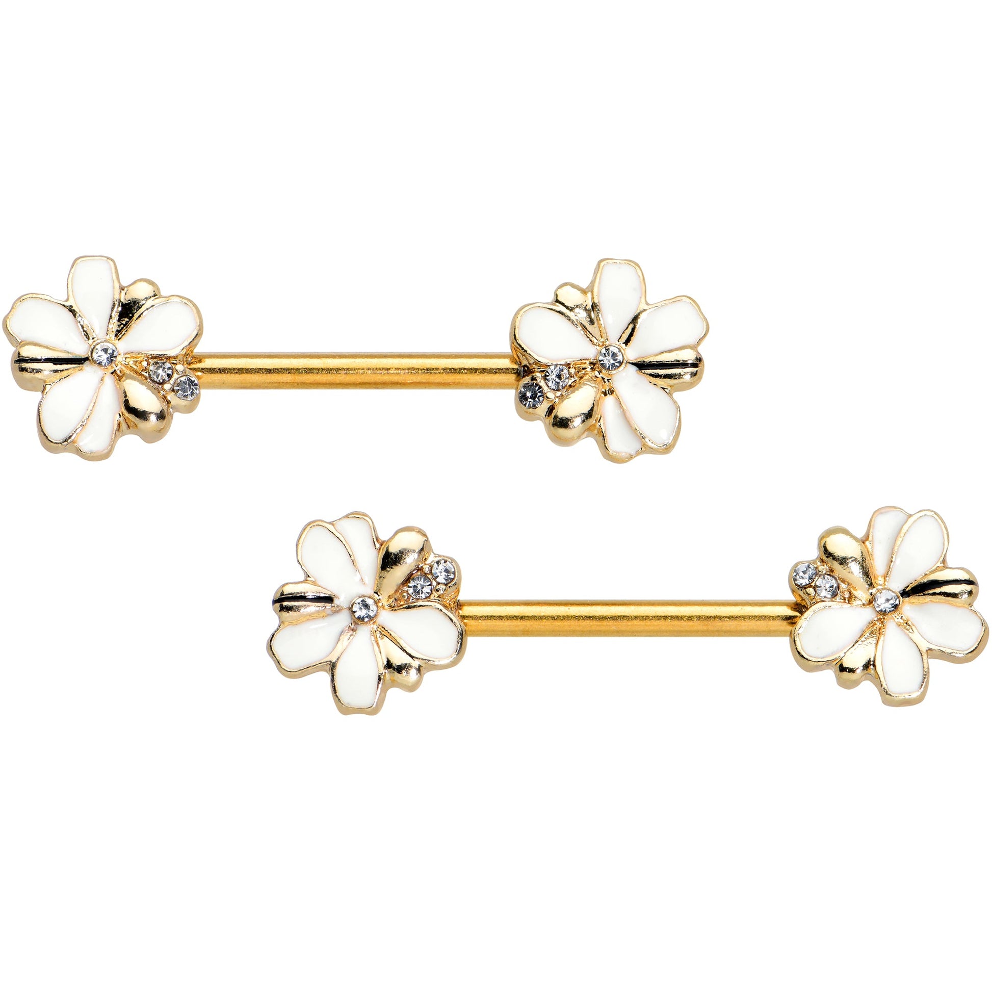 The little critter on this 14 gauge nipple jewelry is hungry...for style! It's made with 14mm gold tone PVD over 316L surgical grade stainless steel straight barbells. Each of the ends features a white flower charm with a clear gem at the centers. On each flower is a tiny bee, composed entirely of clear gems, who appears to be having a pollen snack at the center of the flower. These floral nipple piercing rings are sure to keep you looking delicious! Sold as a set of two.Specifications