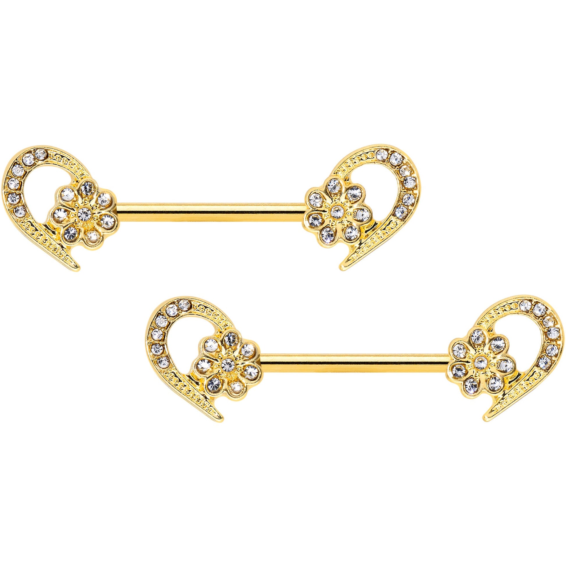Half a heart this Valentine's Day with this 14 gauge nipple jewelry! It's made with 14mm gold tone plated over 316L surgical grade stainless steel straight barbells. Each of the ends features a half heart charm set with clear gems. Between the heart's ends is a gold tone flower, composed of matching clear gems. These half hearts are sure to steal your whole heart this Valentine's Day with the graceful style they'll bring to your nipple piercings! Sold as a set of two.Specifications