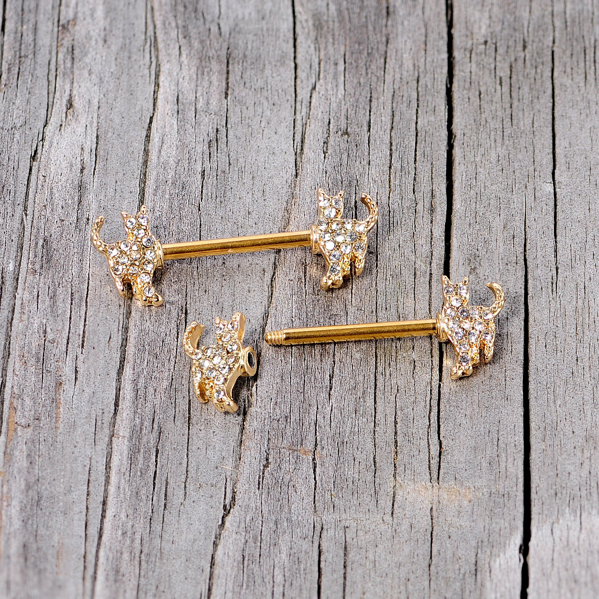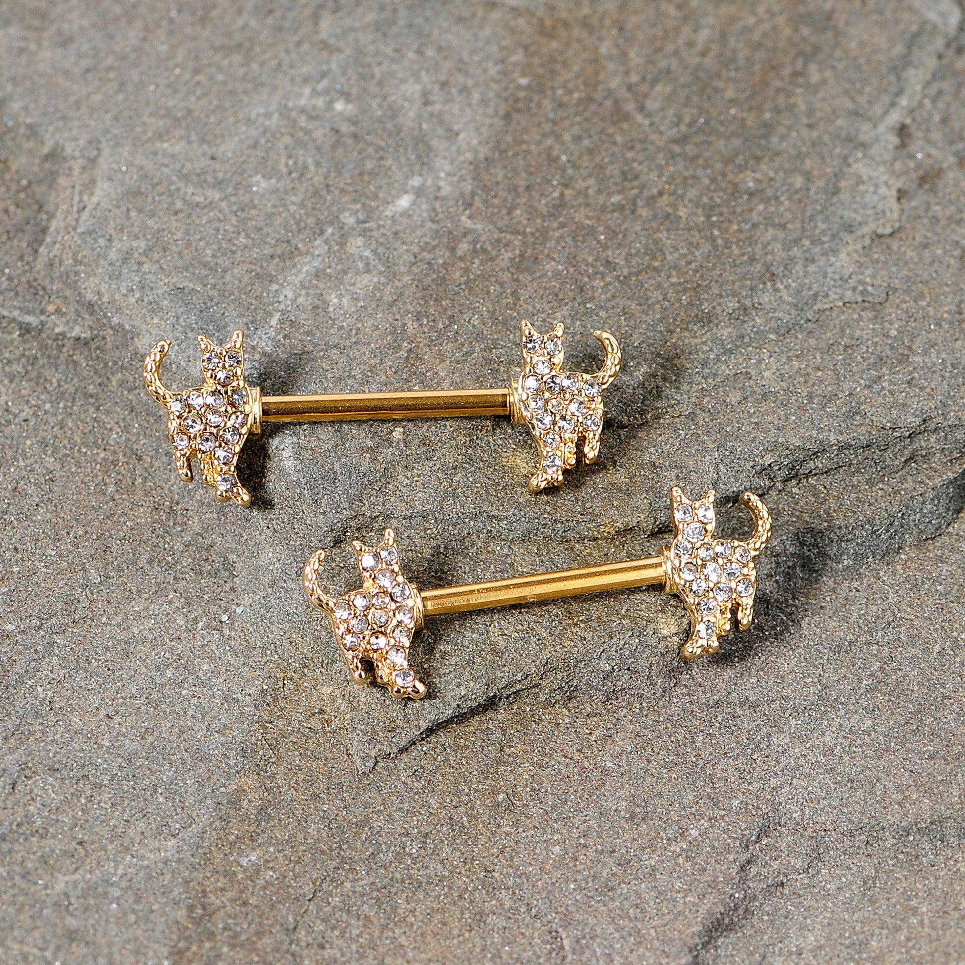 14G 9/16 Clear Gem Gold Tone Glamour Cat Barbell Nipple Ring Set