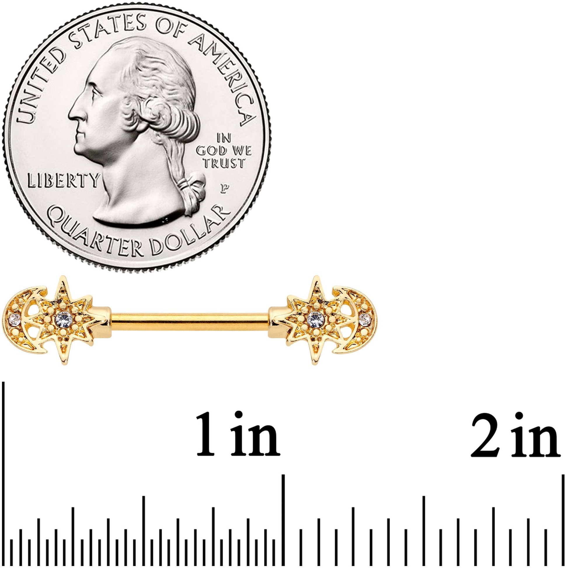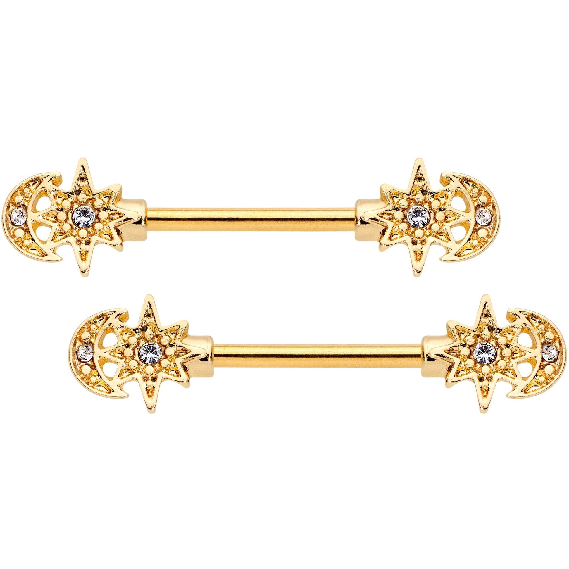 Stars and the moon are common themes but few pieces of jewelry featuring them are quite so lavishly ornamented! These 14 gauge nipple piercings are made with 14mm gold tone PVD over 316L surgical grade stainless steel straight barbells. Each moon and eight-pointed star is individually embellished with small clear gems adding to the look of opulence. They also feature textured details further giving them a sumptuously rococo style. These are sure to add some holiday extravagance to your piercings without an extravagant price tag! Sold as a set of two.Specifications