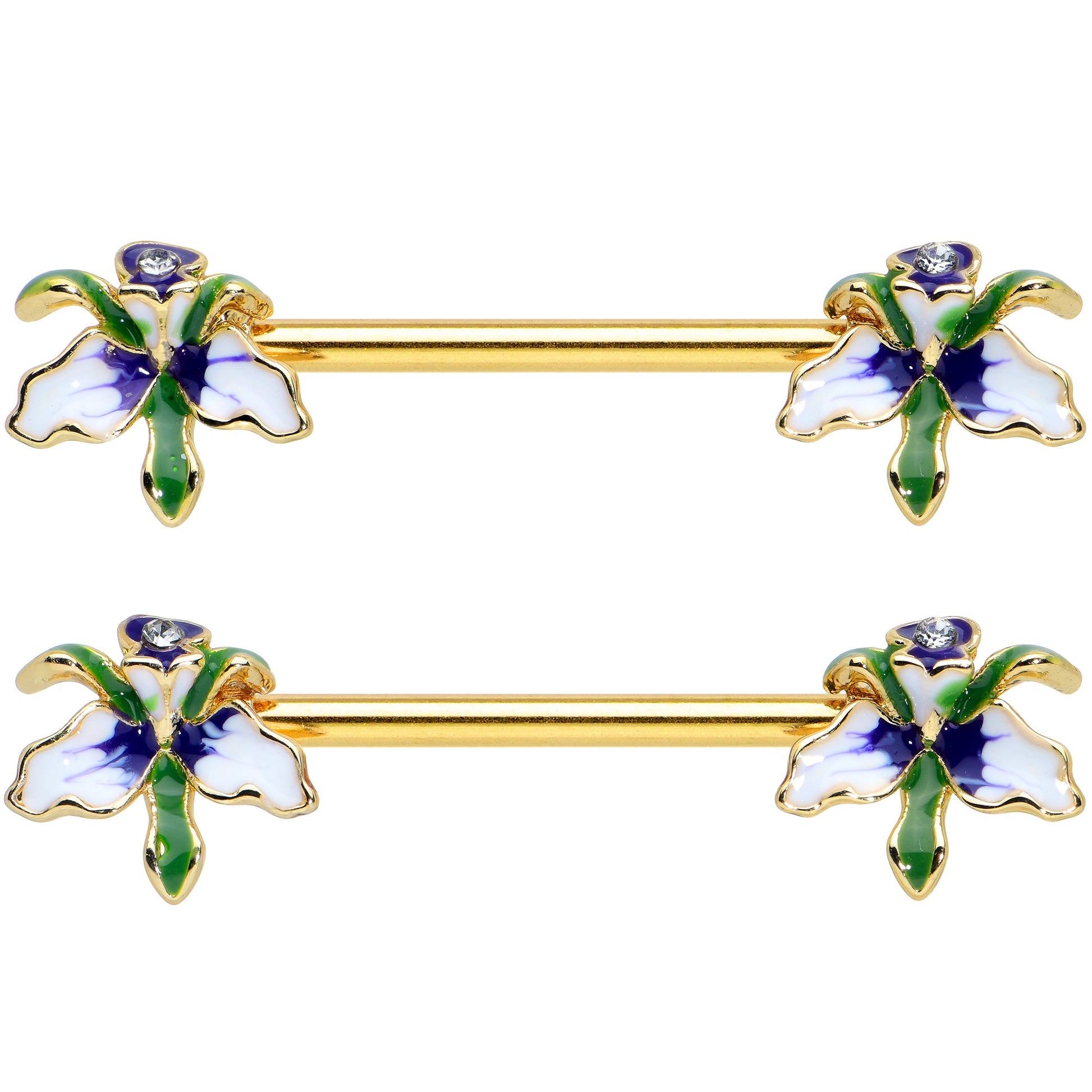 Let every day feel like Springtime when you're rocking this 14 gauge nipple jewelry! it's made with 14mm gold tone PVD over 316L surgical grade stainless steel straight barbells. Each of the ends features an iris flower charm, inlaid in purple and white. They're further embellished with green leaves and are each set at the top with a clear gem for added style. Your look is going to blossom with these fantastic, floral nipple piercing rings! Sold as a set of two.Specifications