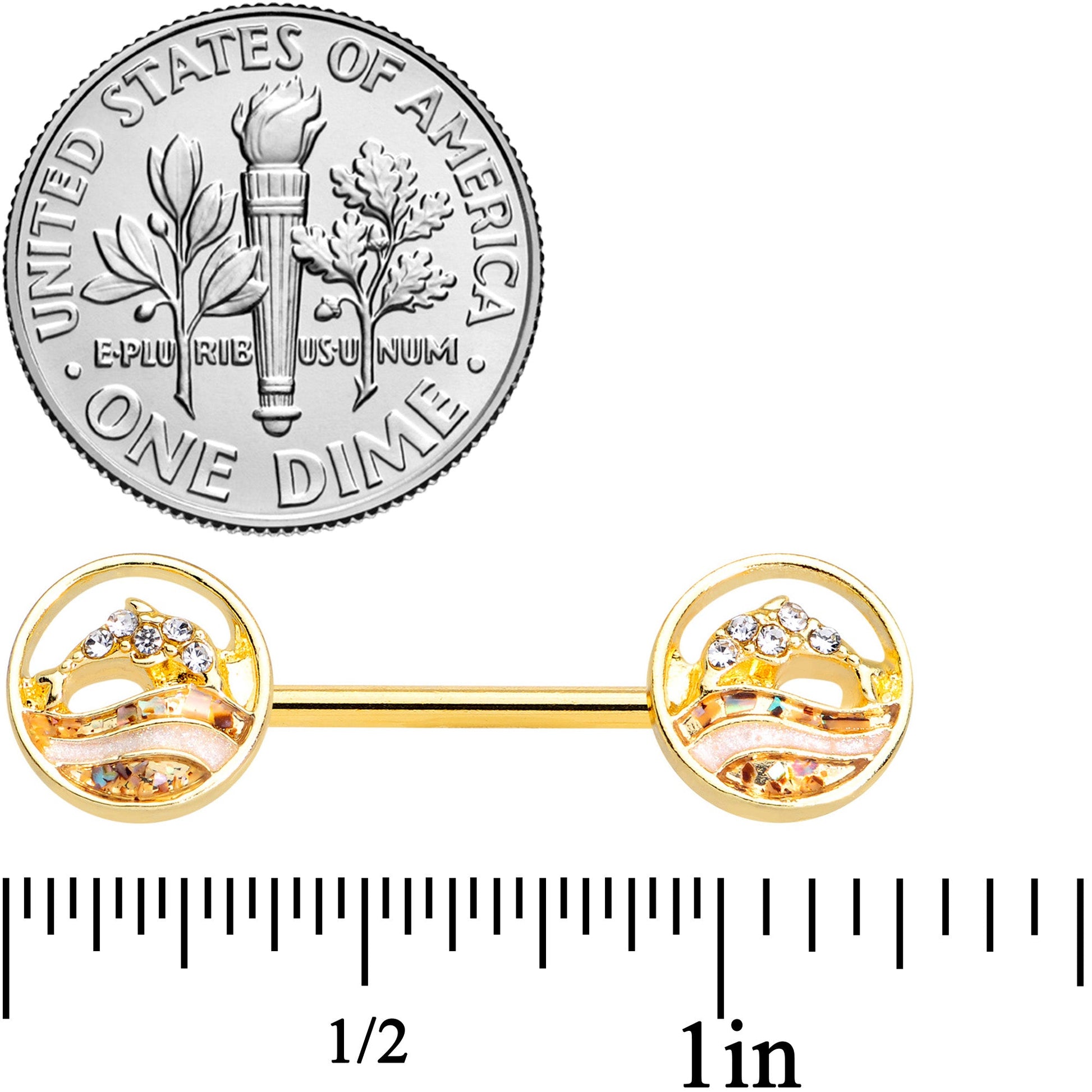 If you're mad for marine life or daffy for dolphins, these 14 gauge nipple rings are right up your alley! They're made with 14mm gold tone PVD over 316L surgical grade stainless steel straight barbells. The ends each feature circular dolphin charms paved with clear gems, caught in mid-leap over the waves. If you're all about ocean life, this nipple jewelry will have you leaping for joy! Sold as a set of two.Specifications