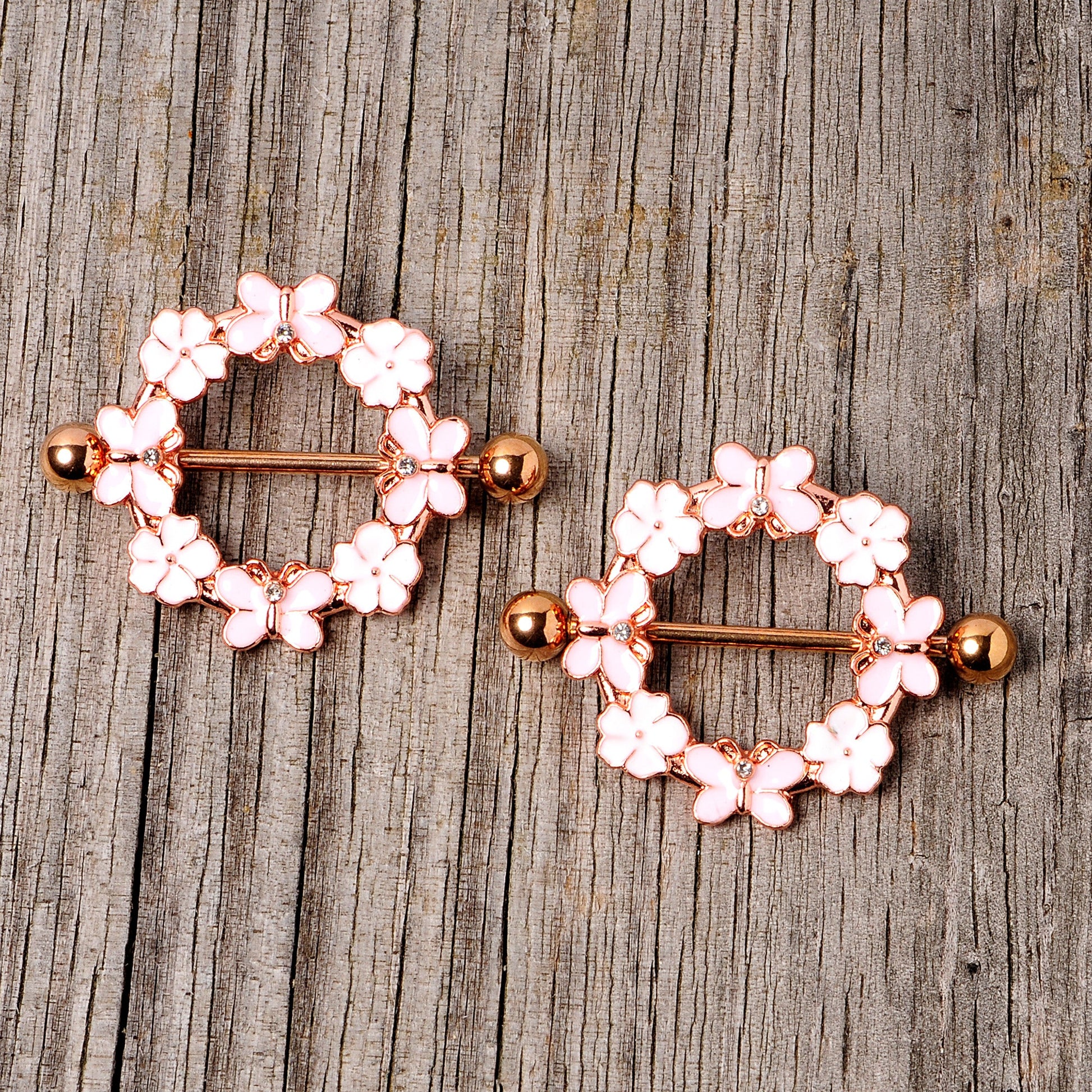 What could be prettier than butterflies and flowers in pink and white? These 14 gauge nipple shields are made with 14mm gold tone PVD over 316L surgical grade stainless steel straight barbells with 5mm ball ends. The shield portion features a ring of alternating white flower and pink butterflies with small clear gems. This nipple jewelry is sure to make your heart flutter like a butterfly's wings! Sold as a set of two.Specifications