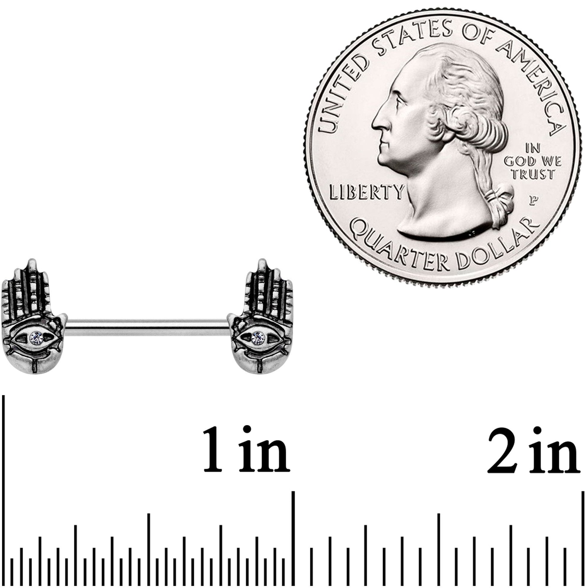 Give yourself and your piercings a spiritually uplifting experience with these 14 gauge nipple barbells. At 14mm, they are finished with two Hamsa spirit hands with clear gems set into the palms. These are made of durable 316L surgical grade stainless steel straight barbells that have the power and strength of this sacred symbol itself. Sold as a set of two.Specifications